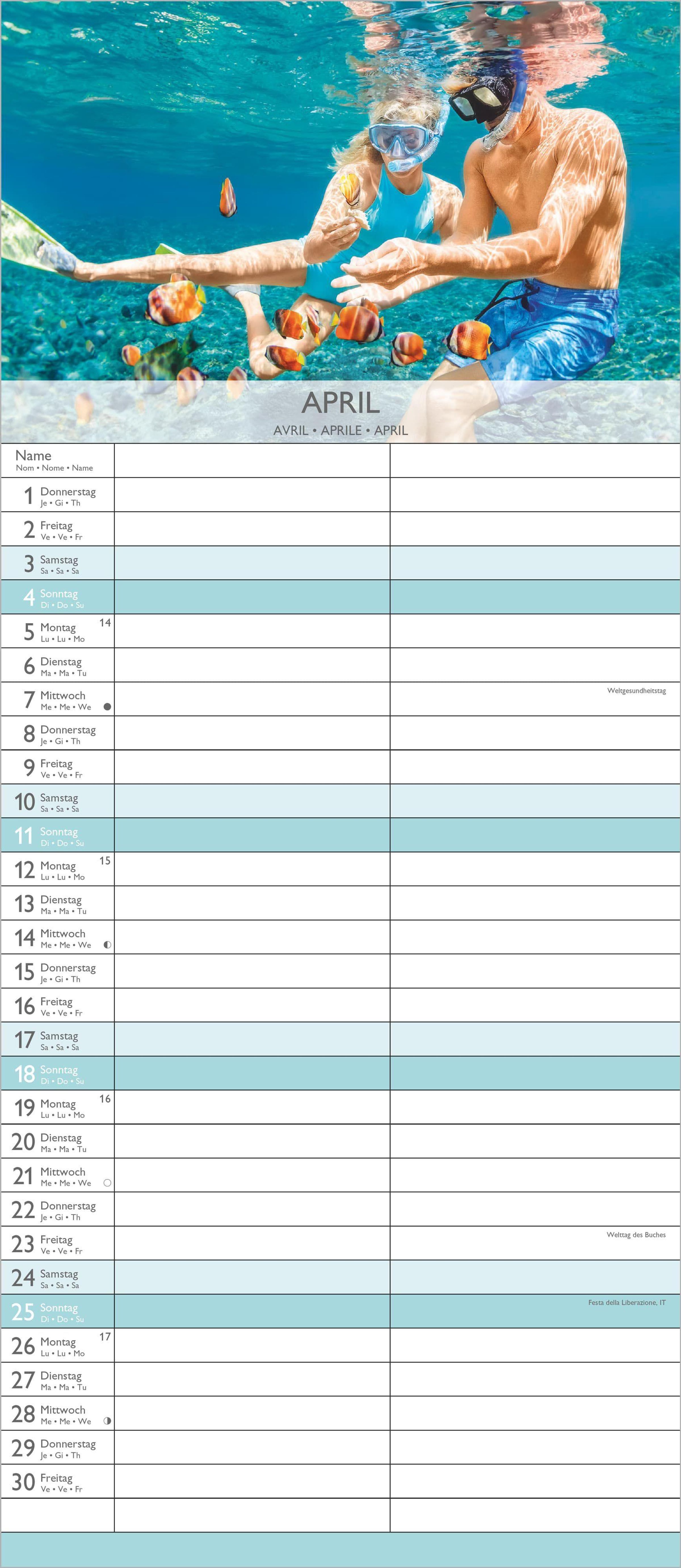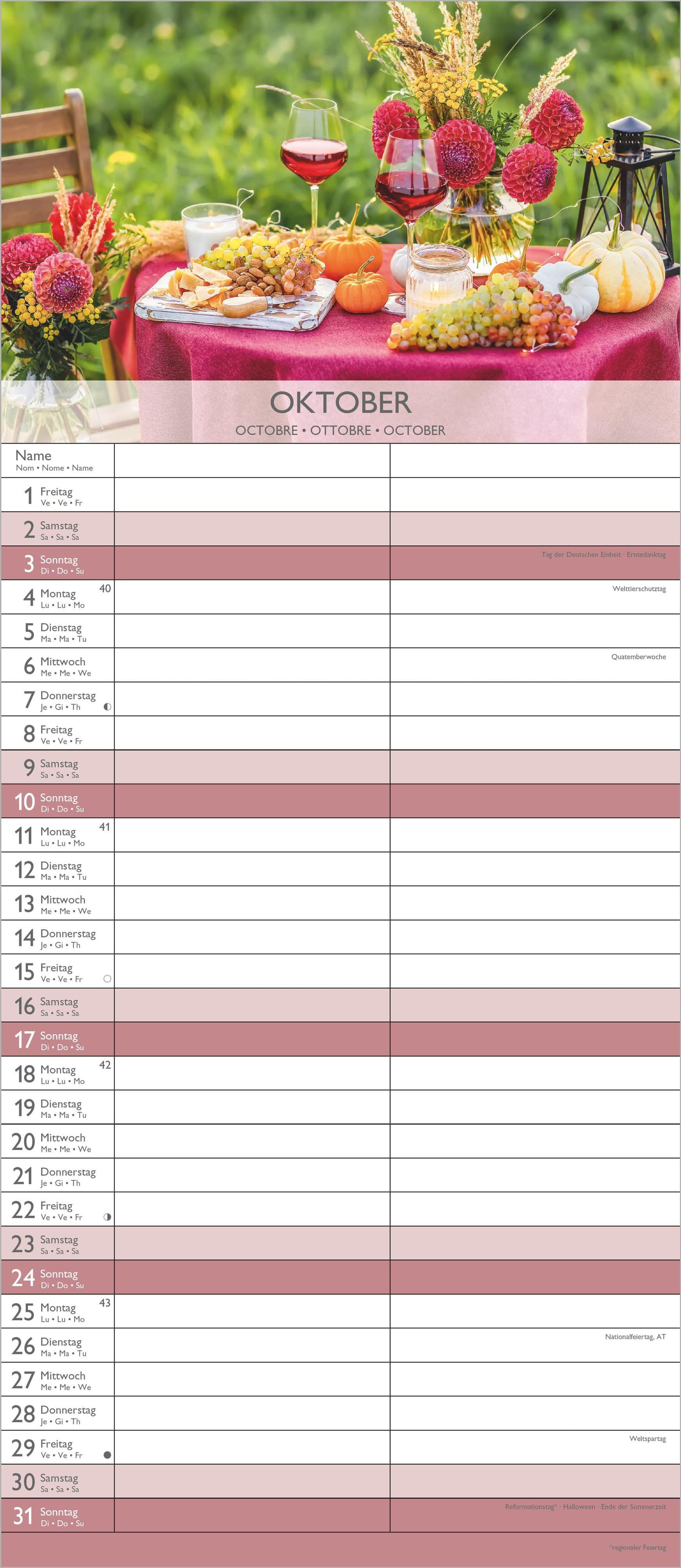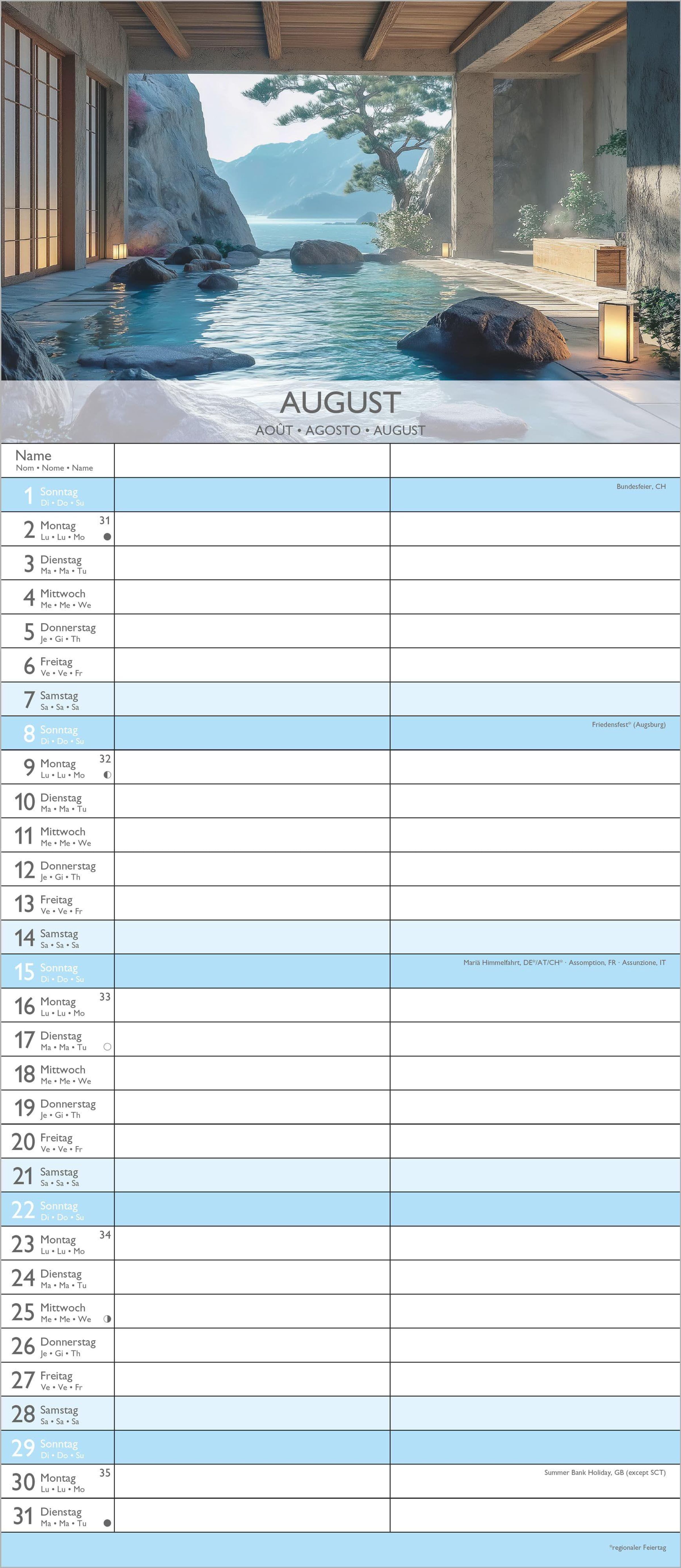 Übersichtliche Monatsansicht: 4-sprachiges Kalendarium (DE/FR/IT/GB) mit allen Feiertagen und Mondphasen für DE/AT/CH