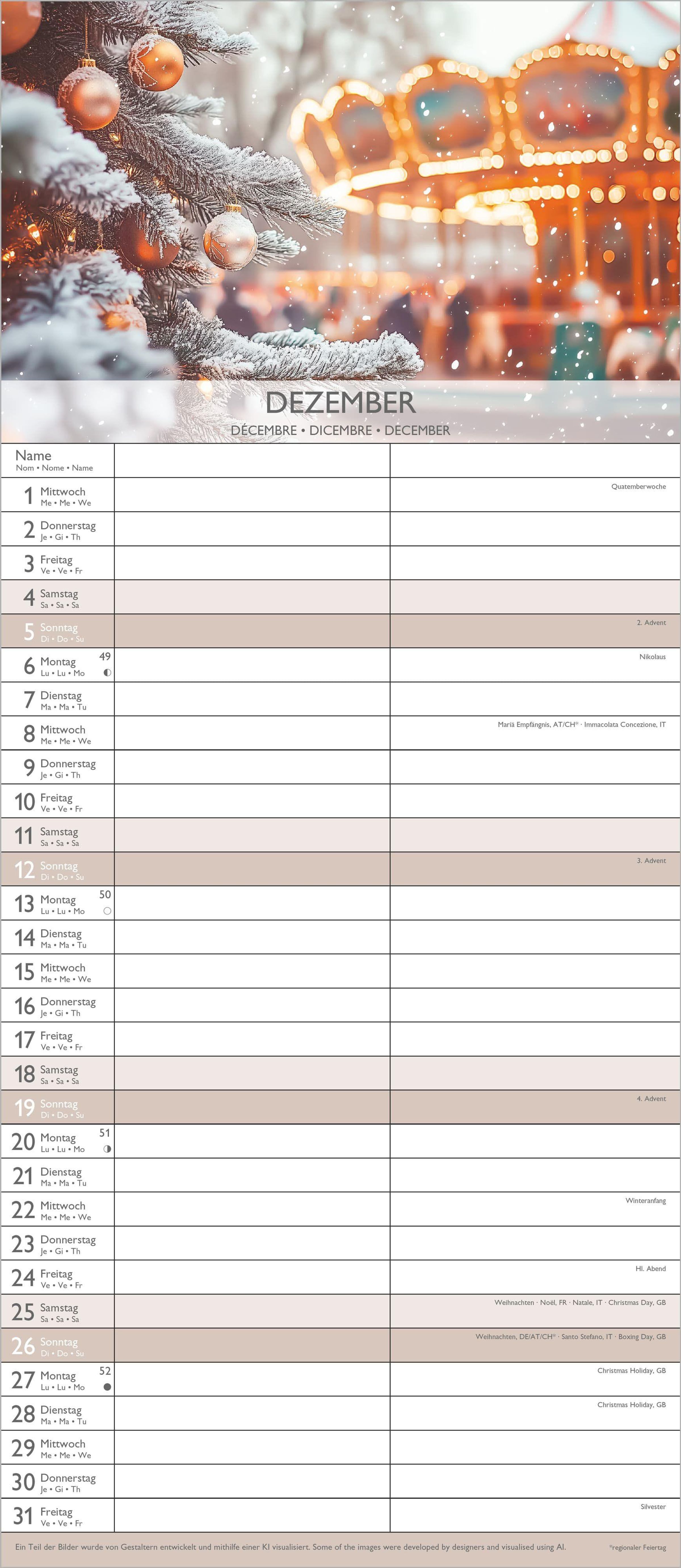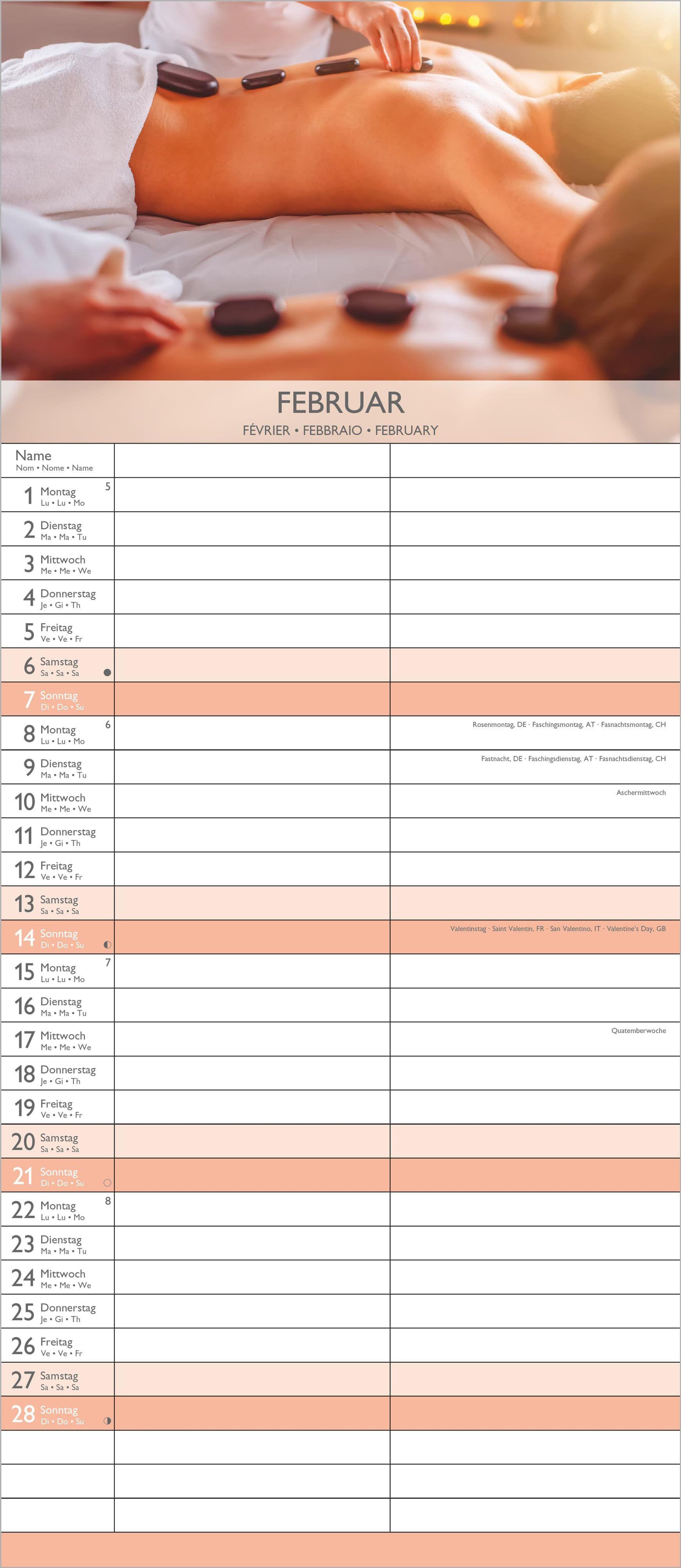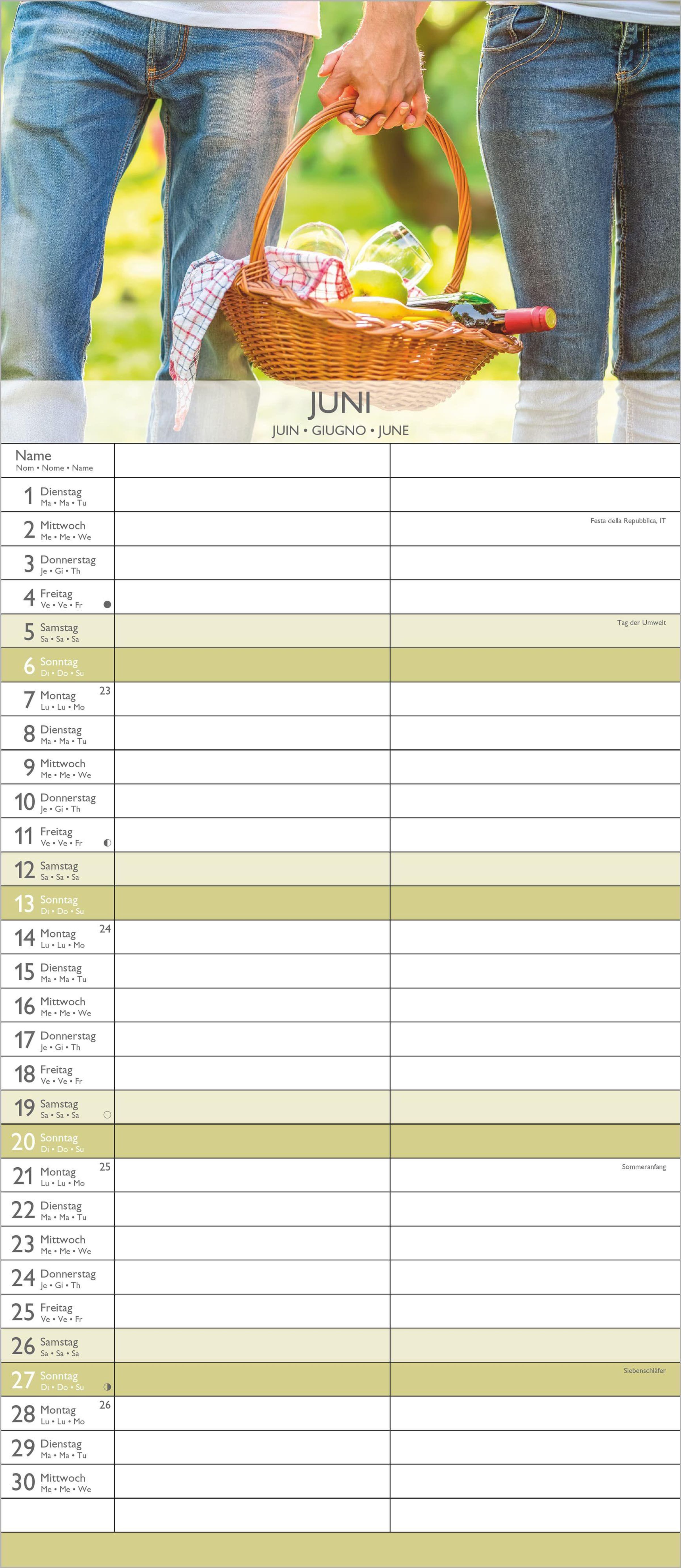 Übersichtliche Monatsansicht: 4-sprachiges Kalendarium (DE/FR/IT/GB) mit allen Feiertagen und Mondphasen für DE/AT/CH