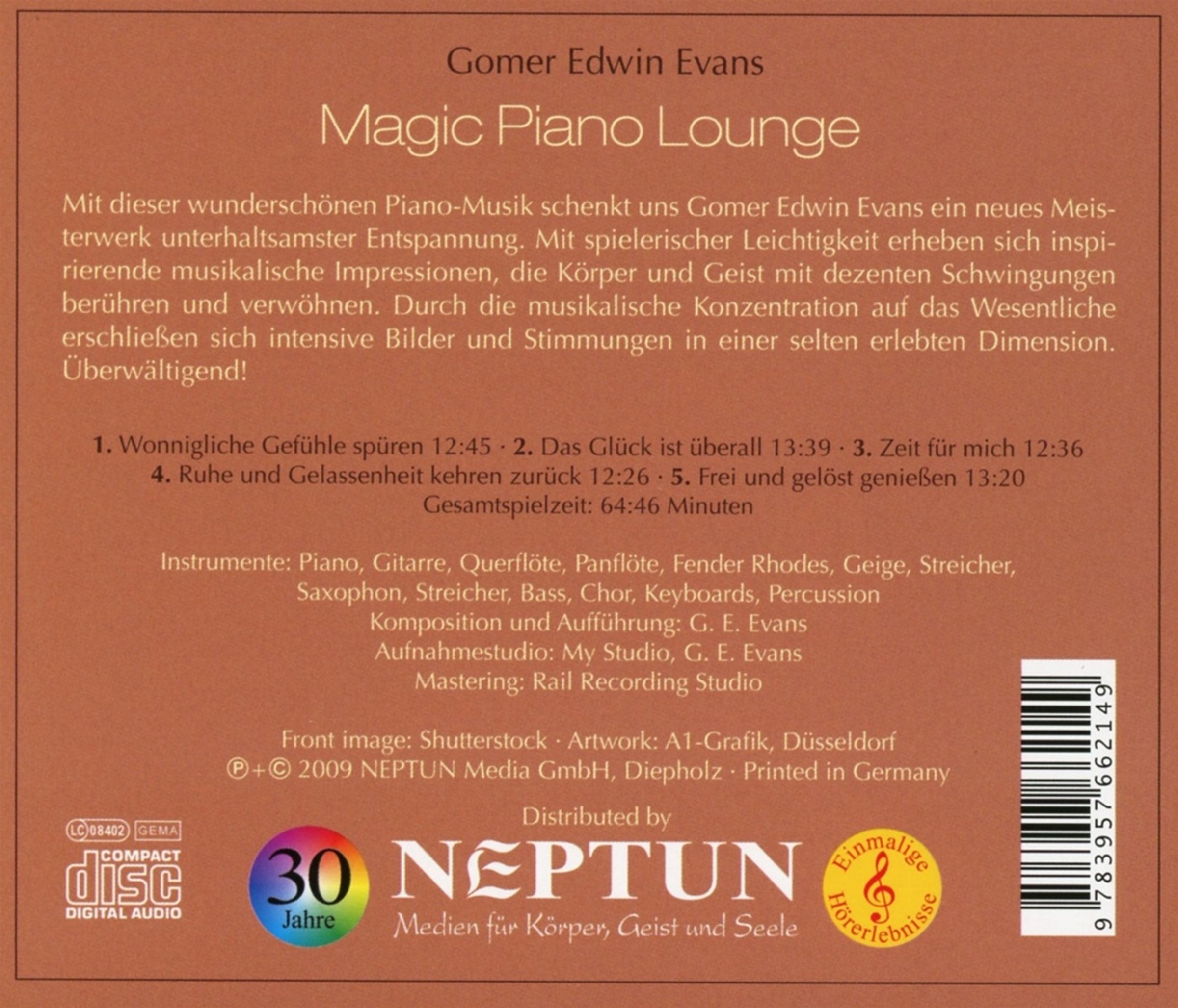 Mit dieser wunderschönen Piano-Musik schenkt uns Gomer Edwin Evans ein neues Meisterwerk unterhaltsamster Entspannung. Mit spielerischer Leichtigkeit erheben sich inspirierende musikalische Impressionen, die Körper und Geist mit dezenten Schwingungen berühren und verwöhnen. Durch die musikalische Konzentration auf das Wesentliche erschließen sich intensive Bilder und Stimmungen in einer selten erlebten Dimension. Überwältigend!