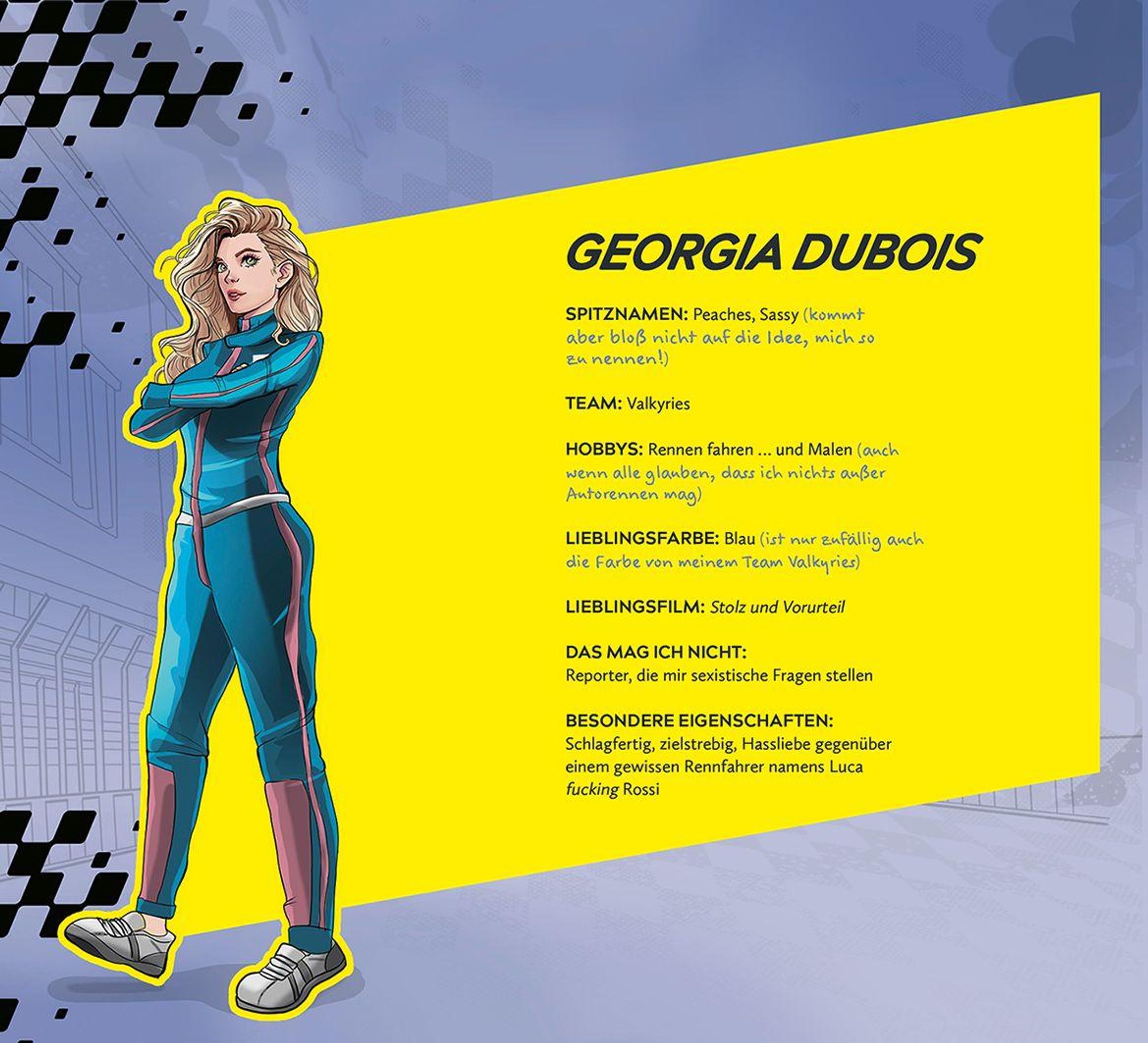 Für ihren Traum würde die schlagfertige Georgia Dubois alles tun: Sie will als erste Frau Formel-1-Weltmeisterin werden. Doch Medien und Sponsoren machen es ihr und ihrem reinen Frauen-Team Valkyries alles andere als leicht. Währenddessen steht der leidenschaftliche und bislang extrem beliebte Rennfahrer Luca Rossi gehörig unter Druck: Eine leichtsinnige Aktion auf Mallorca hat ihm den Ruf eines selbstsüchtigen Playboys eingebracht.