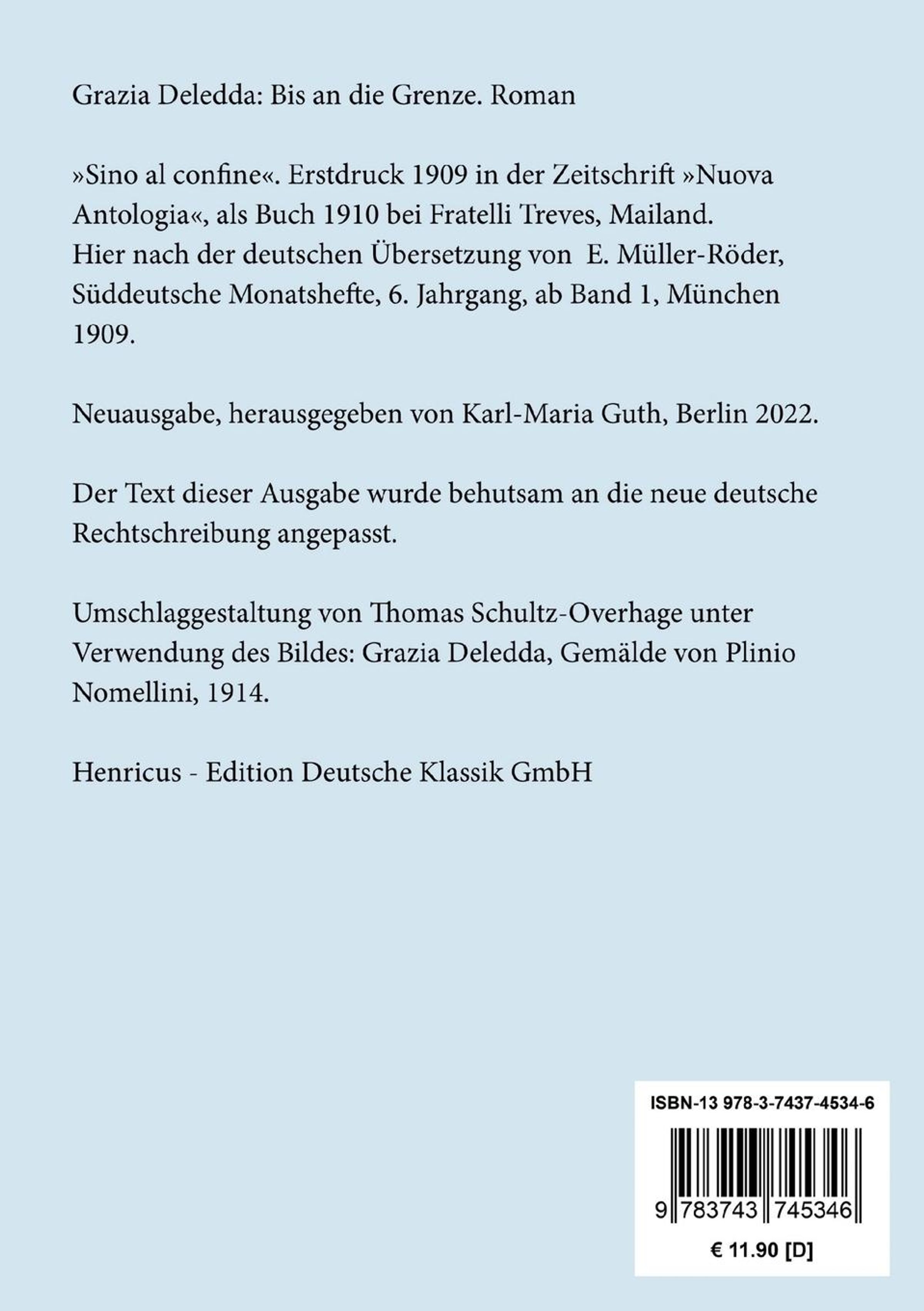Grazia Deledda wurde am 27. September 1875 in Nuoro auf Sardinien geboren. Seit 1900 in Rom lebend, zählte sie zu den bedeutendsten Autorinnen des Naturalismus innerhalb der italienischen Literatur. In ihren Werken schilderte sie das harte Leben der Menschen Sardiniens. Schauplatz ihrer späteren Werke ist Italien, jedoch immer mit Bindung an ihre Heimat. 1926 erhielt sie den Nobelpreis für Literatur. Sie starb am 15. August 1936 in Rom.Anmerkungen:
