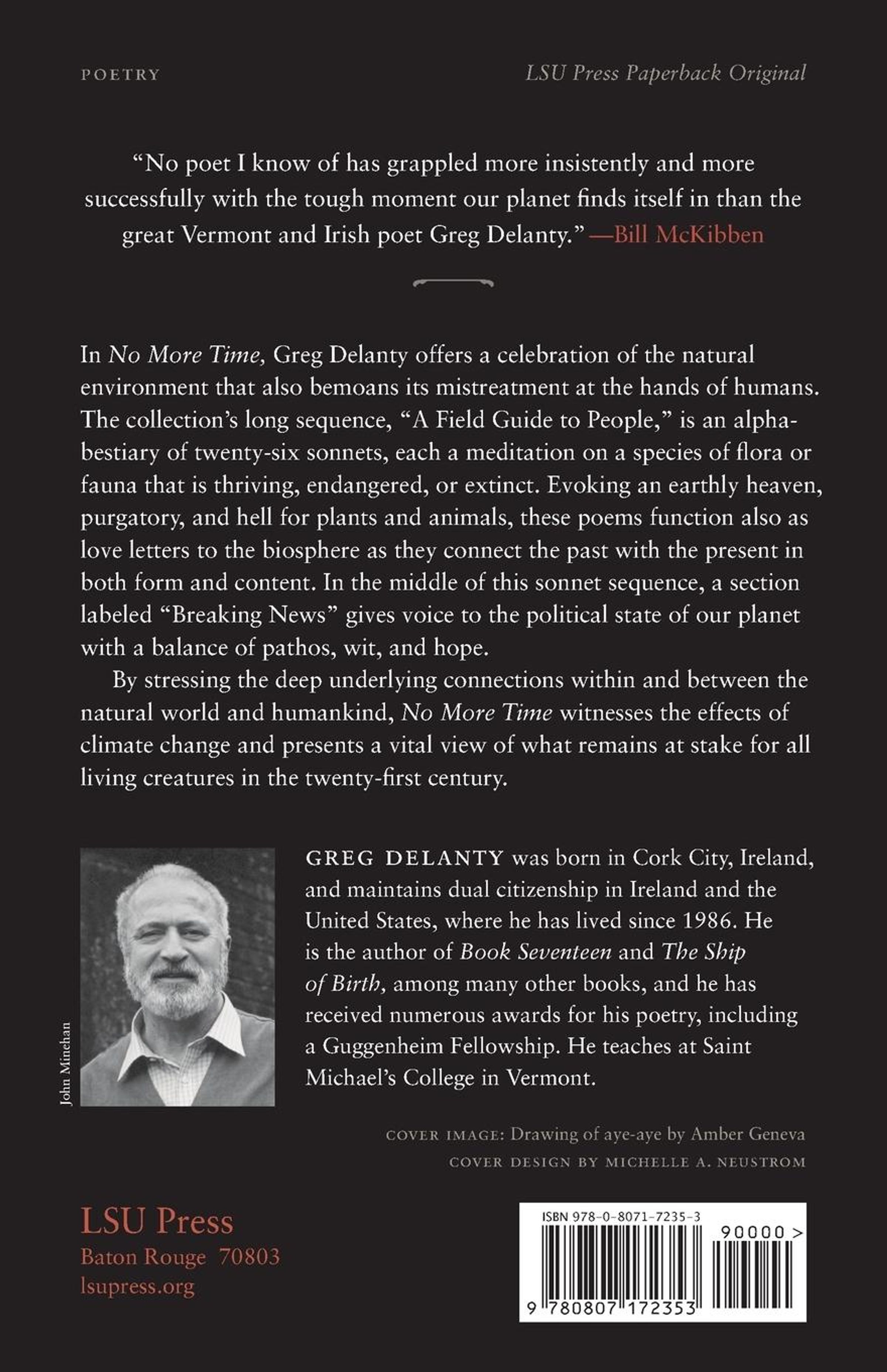 In No More Time, Greg Delanty offers a celebration of the natural environment that also bemoans its mistreatment at the hands of humans. The collection's long sequence, "A Field Guide to People," is an alpha-bestiary of twenty-six sonnets, each a meditation on a species of flora or fauna that is thriving, endangered, or extinct. Evoking an earthly heaven, purgatory, and hell for plants and animals, these poems function also as love letters to the biosphere as they connect the past with the present in both form and content. In the middle of this sonnet sequence, a section labeled "Breaking News" gives voice in poetry to the political state of our planet with a balance of pathos, wit, and hope. Delanty stresses the deep underlying connections within and between the natural world and humankind, rather than the fragmented world stressed at the beginning of the twentieth century. No More Time witnesses the effects of climate change and presents a vital view of what remains at stake for engaged global citizens in the twenty-first century.