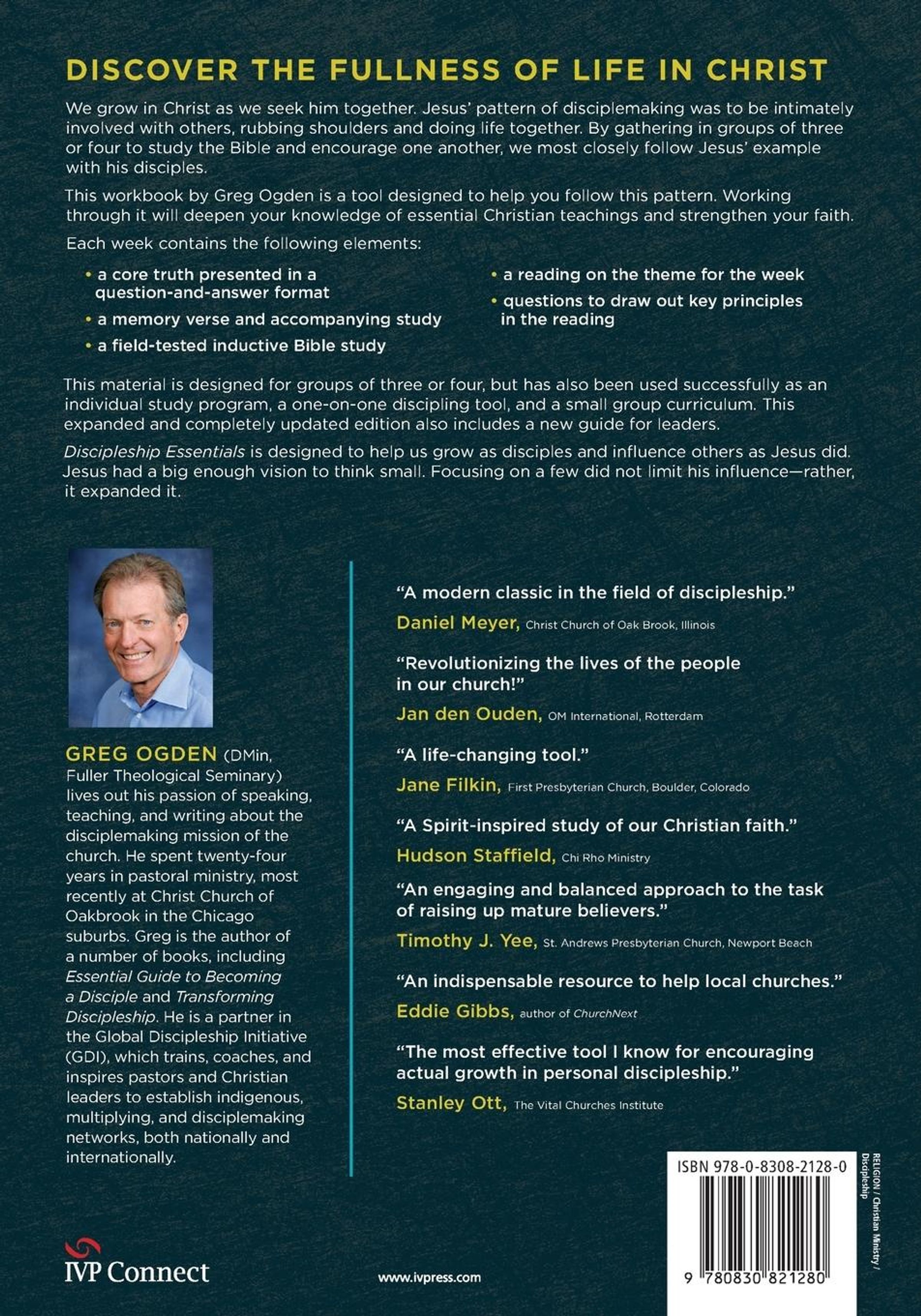 Over 300, 000 Copies Sold! The Essential Workbook for Spiritual Growth We grow in Christ as we seek him together. Jesus' own pattern of disciple-making was to be intimately involved with others and allow life to rub against life. By gathering in twos or threes to study the Bible and encourage one another, we most closely follow Jesus' example with the twelve disciples. Discipleship Essentials by Greg Ogden is a tool designed to help you follow this pattern. In each week, you'll find: a core truth presented in a question-and-answer format a memory verse and accompanying study a field-tested inductive Bible study a reading on the theme for the week questions to draw out key principles in the reading