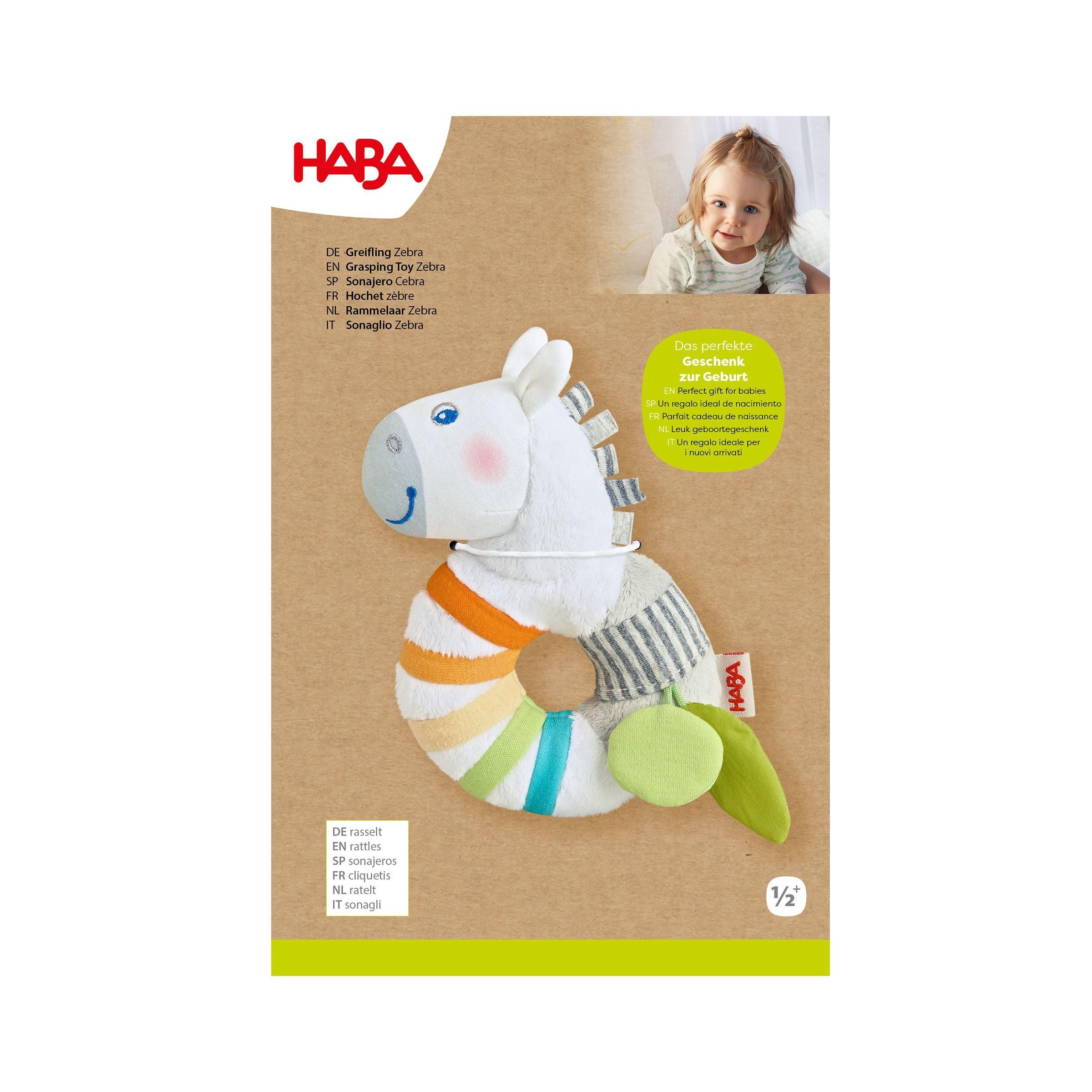 Kuschlig weich und ein Babys erster Freund: Das ist der HABA Greifling Zebra! Er begleitet Babys auf die alltäglichen Entdeckertouren und hält dabei selbst eine kleine Überraschung bereit: Wird er geschüttelt, erklingt dank Rassel ein lustiges Geräusch. Wow! Gleich nochmal!