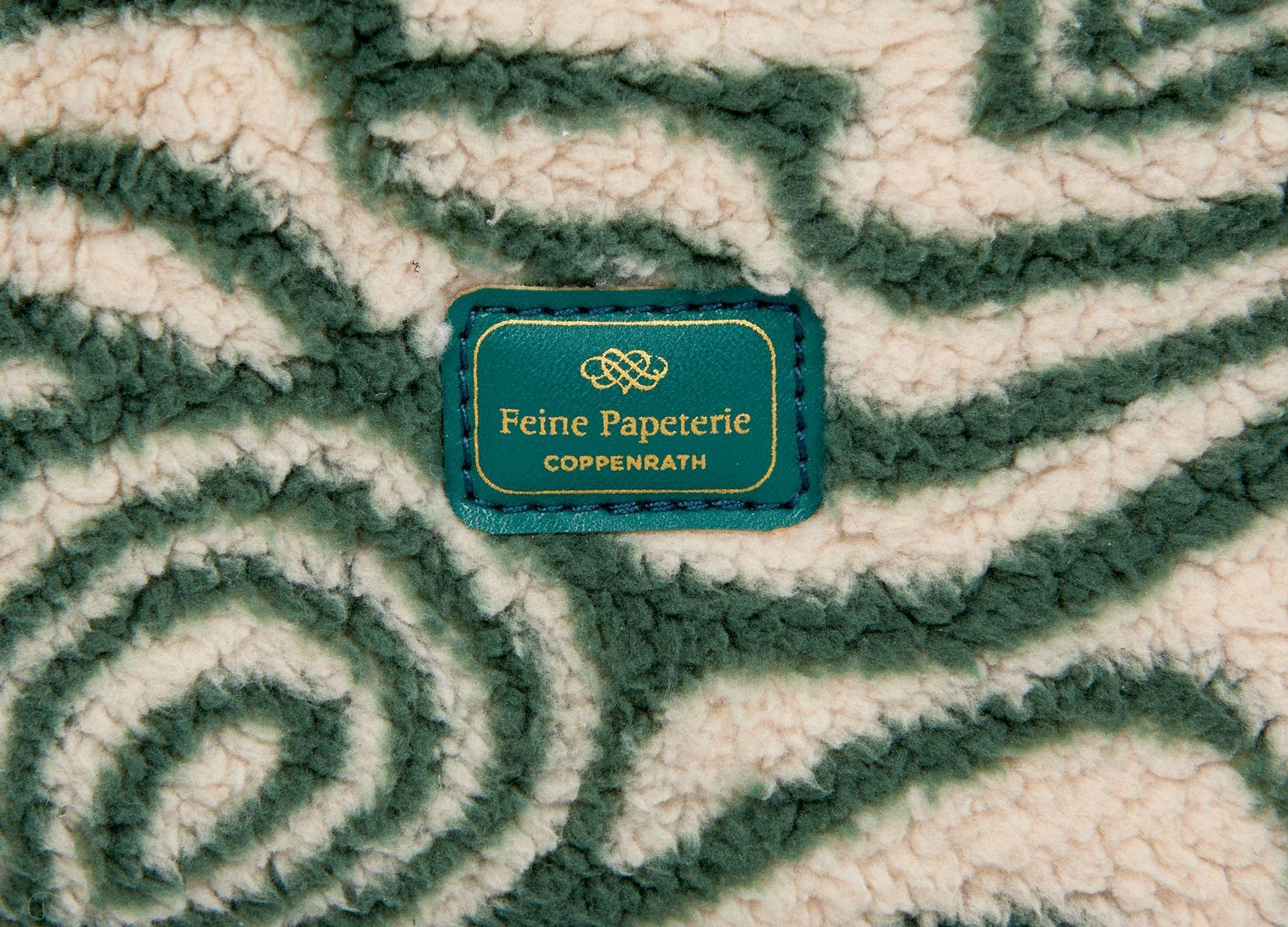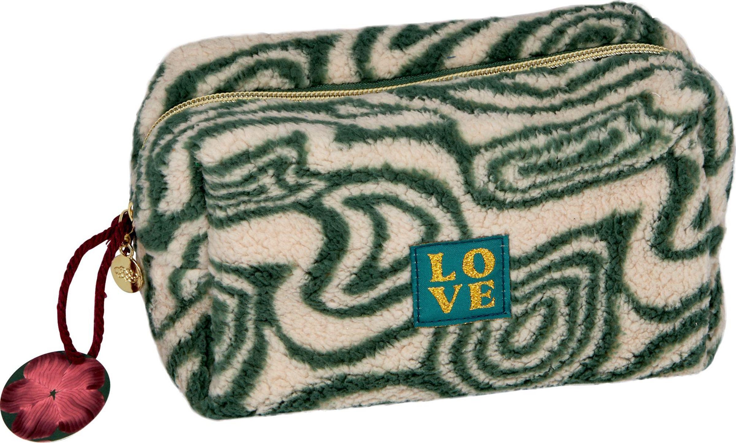 Text: "LOVE" in Gold auf grünem Hintergrund. Flauschige Tasche mit grün-weißem, wirbelndem Muster und goldenem Reißverschluss., Diverse