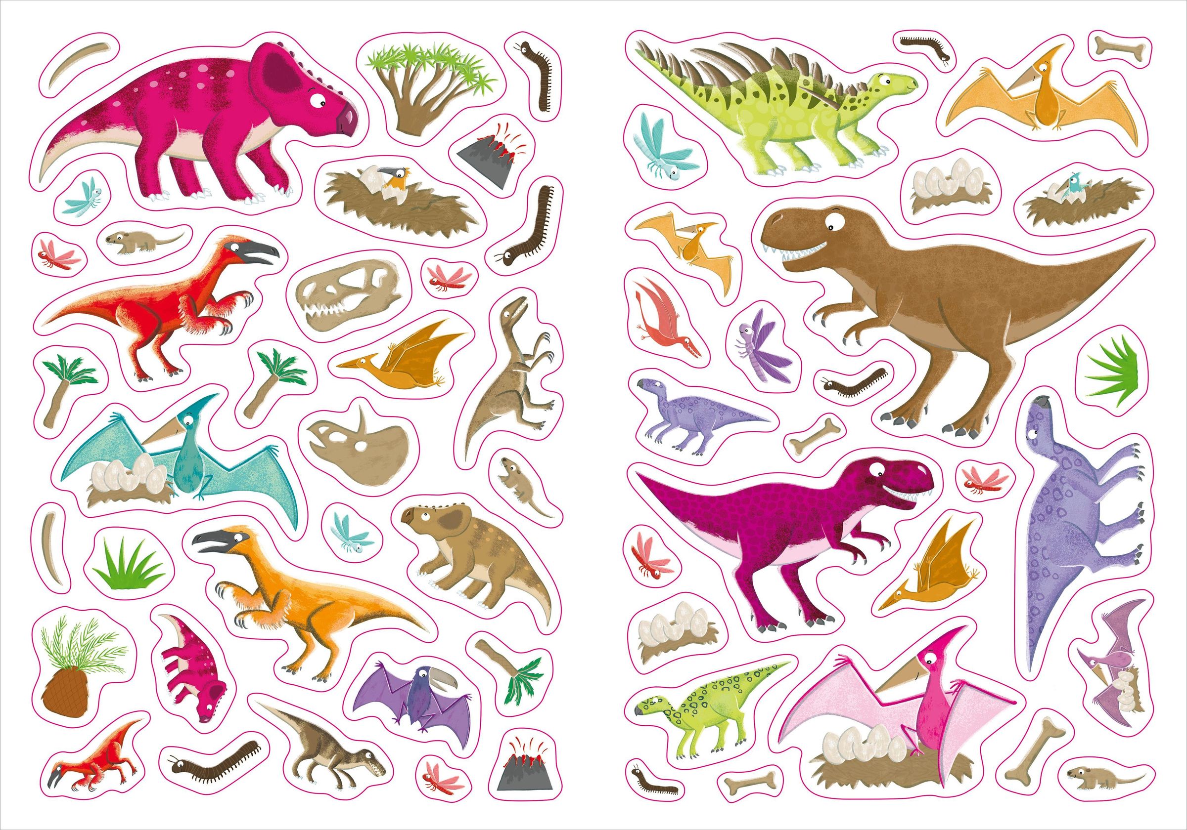 Ich sticker mir die Welt, wie sie mir gefällt! 13 bunte Landschaften können mit Stickern fantasievoll gestaltet werden. Für jeden Dino-Fan ist was dabei: Unterwassersaurier wie Plesiosaurus oder Ichthyosaurus, Flugsaurier wie Dimorphodon und die bekannten Dinosaurier auf dem Land wie T. rex, Triceratops und Stegosaurus. Dabei können die Dinosaurier zum Beispiel im Wald, im Sumpf, am Meer oder in eine faszinierende Vulkanlandschaft eingeklebt werden. Soll der T-Rex lieber auf den Triceratops oder auf einen Maiasaurier treffen? Das können die Kinder selbst entscheiden und ihre eigenen Dinoszenen stickern! Der Fantasie sind keine Grenzen gesetzt. Mit über 200 Stickern. Für Kinder ab 5 Jahren.