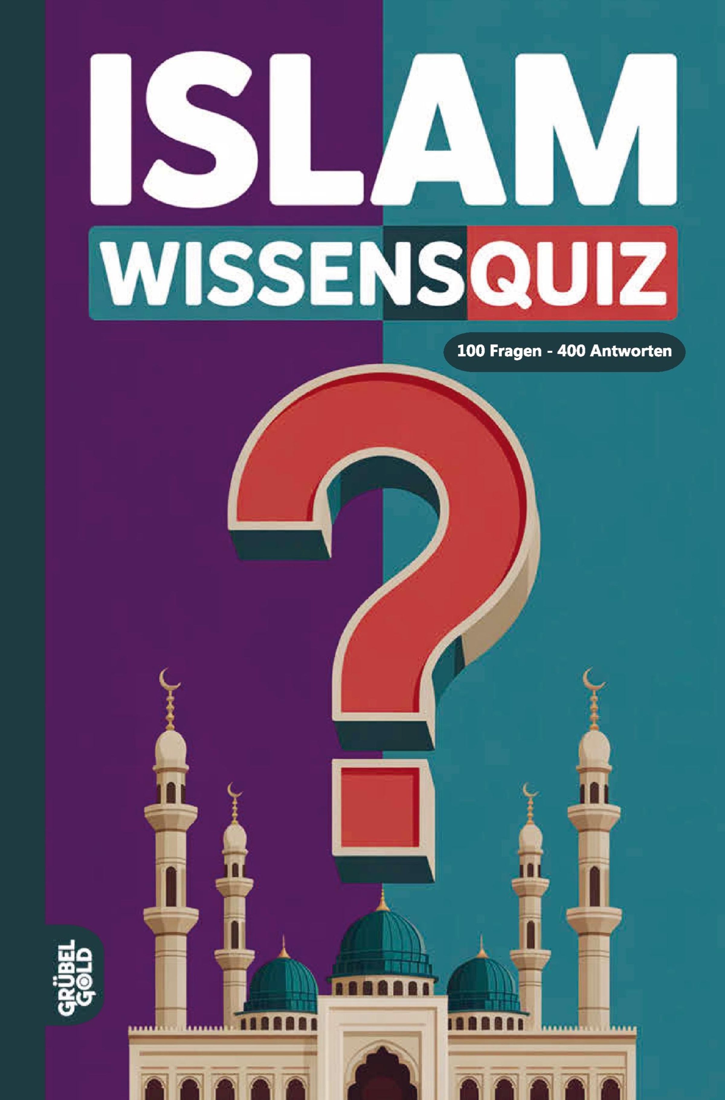 "ISLAM WISSENSQUIZ", "100 Fragen - 400 Antworten". Eine Moschee-Illustration mit Minaretten und großem Fragezeichen., Buch