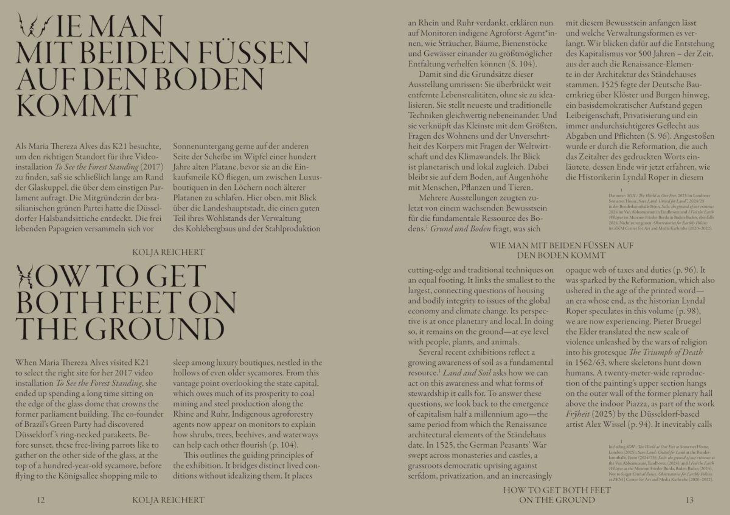 30 internationale Künstler*innen und Kollektive führen an die Grundlagen des menschlichen Zusammenlebens. Im Zentrum steht die Verwaltung des Bodens. Boden verbindet: Wir pflegen und bewirtschaften ihn, wir teilen Gefühle für die Heimat. Boden trennt: Die einen haben ihn, die anderen nicht. Besitz an Boden war und ist in allen Gesellschaftssystemen ein entscheidender Machtfaktor. Wie kann Wohnen erschwinglich bleiben? Wie kann der Amazonas als grüne Lunge erhalten werden? Und wie kann Zusammenarbeit über Grenzen und Unterschiede hinweg wieder Freude machen? Die Ausstellung "Grund und Boden" lädt dazu ein, den eigenen Platz in der Geschichte der Weltwirtschaft zu verstehen und eine gerechte Zukunft zu entwerfen. Die Publikation stellt die Künstler*innen vor und macht die Welt des Bodens anschaulich.