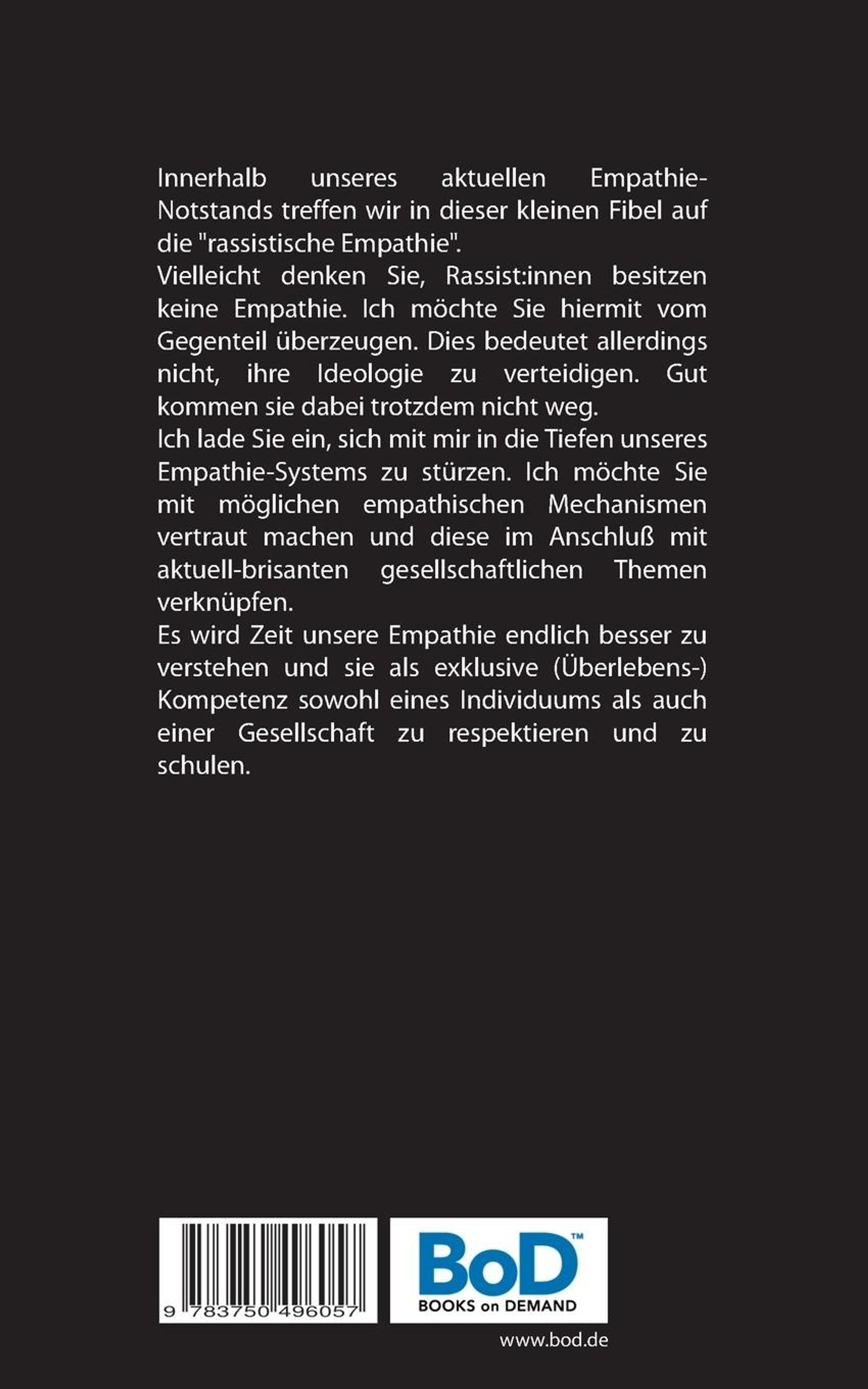 Innerhalb unseres aktuellen Empathie-Notstands treffen wir in dieser kleinen Fibel auf die "rassistische Empathie". Vielleicht denken Sie, Rassist: innen besitzen keine Empathie. Ich möchte Sie hiermit vom Gegenteil überzeugen. Dies bedeutet allerdings nicht, ihre Ideologie zu verteidigen. Gut kommen sie dabei trotzdem nicht weg. Ich lade Sie ein, sich mit mir in die Tiefen unseres Empathie-Systems zu stürzen. Ich möchte Sie mit möglichen empathischen Mechanismen vertraut machen und diese im Anschluß mit aktuell-brisanten gesellschaftlichen Themen verknüpfen. Es wird Zeit unsere Empathie endlich besser zu verstehen und sie als exklusive (Überlebens-)Kompetenz sowohl eines Individuums als auch einer Gesellschaft zu respektieren und zu schulen.