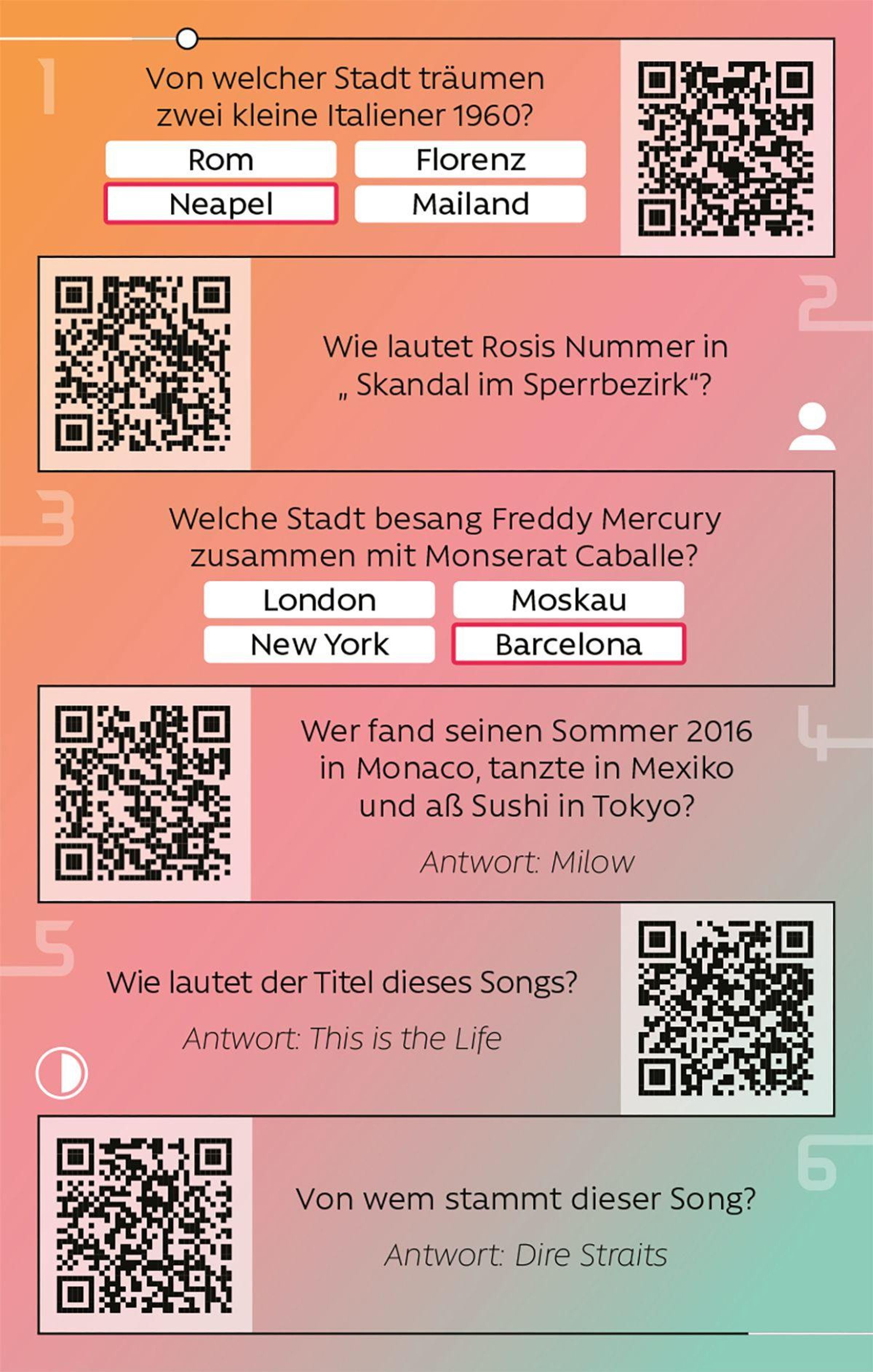 Eine Person zieht eine Fragenkarte und verteilt die Aufgaben an die Mitspielenden. Wer kennt sich mit den Beatles aus? Wer hört ständig Schlager? Wer erkennt den neuesten K-Pop-Song? Jede richtige Antwort bringt Punkte für den Quizmaster und denjenigen oder diejenige, die richtig geantwortet hat.