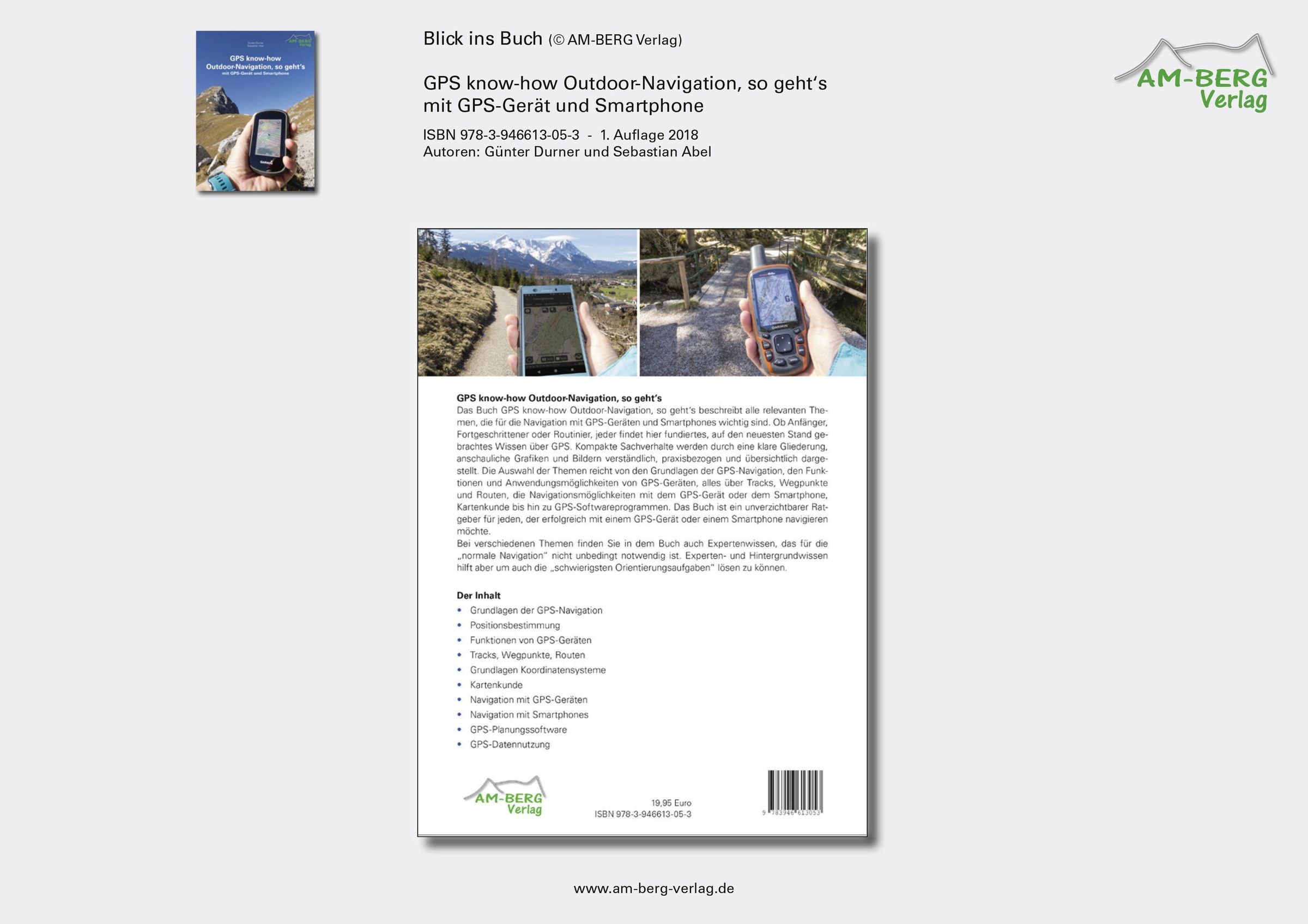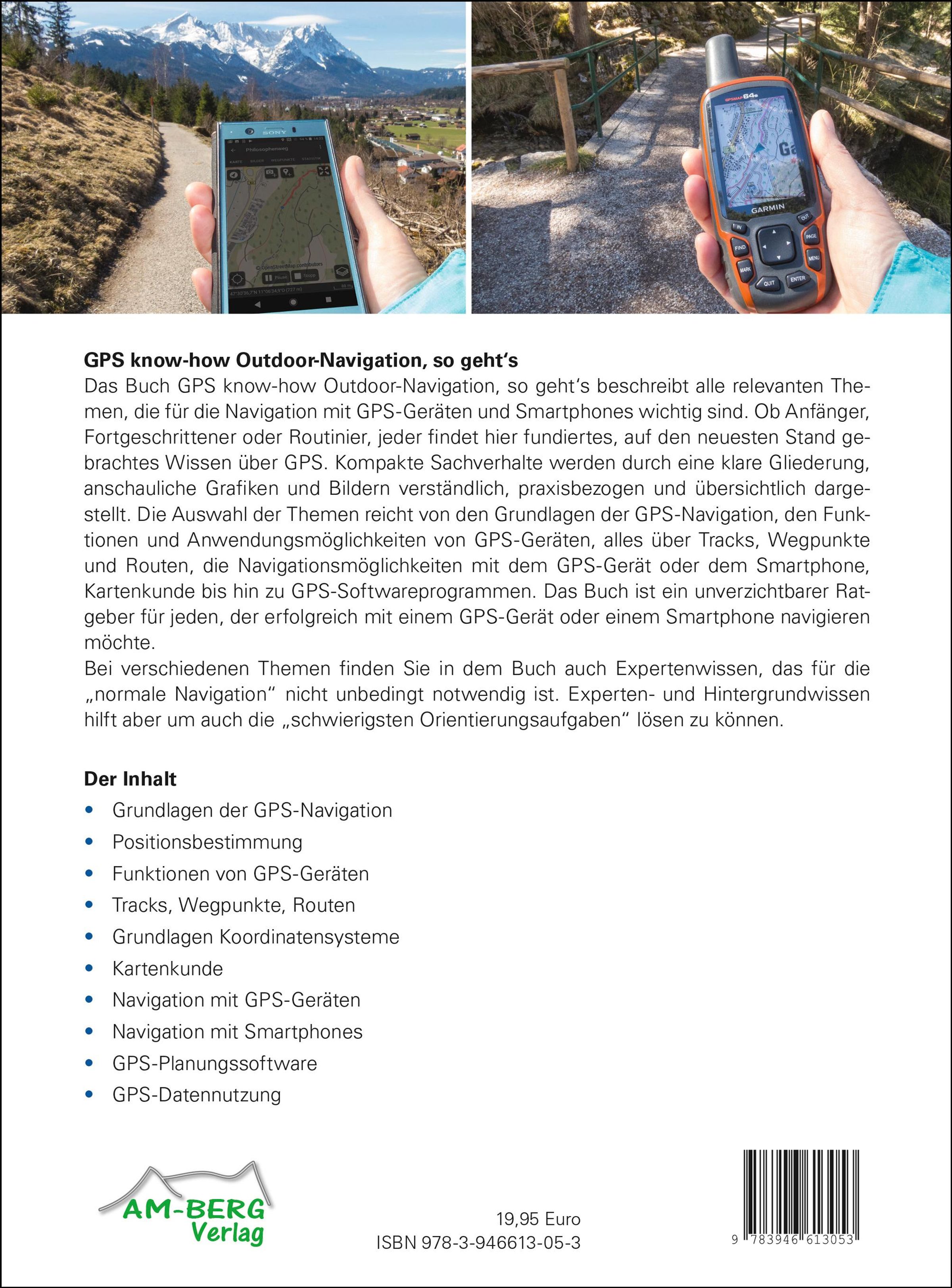 Das Buch GPS know-how Outdoor-Navigation, so geht's beschreibt alle relevanten Themen, die für die Navigation mit GPS-Geräte und Smartphones wichtig sind. Ob Anfänger, Fortgeschrittener oder Routinier, jeder findet hier fundiertes, auf den neuesten Stand gebrachtes Wissen über GPS. Kompakte Sachverhalte werden durch eine klare Gliederung, anschaulichen Grafiken und Bildern verständlich, praxisbezogen und übersichtlich dargestellt. Das breite Spektrum der Themen reicht von den Grundlagen der GPS-Navigation, den Funktionen und Anwendungsmöglichkeiten von GPS-Geräten, alles über Tracks, Wegpunkte und Routen, die Navigationsmöglichkeiten mit dem GPS-Gerät oder dem Smartphone, Kartenkunde bis hin zu GPS-Softwareprogrammen. Das Buch ist ein unverzichtbarer Ratgeber für jeden, der erfolgreich mit einem GPS-Gerät oder einem Smartphone navigieren möchte. Bei verschiedenen Themen finden Sie in dem Buch auch Expertenwissen, das für die "normale Navigation" nicht unbedingt notwendig ist. Experten- und Hintergrundwissen hilft aber um auch die "schwierigsten Orientierungsaufgaben" lösen zu können.