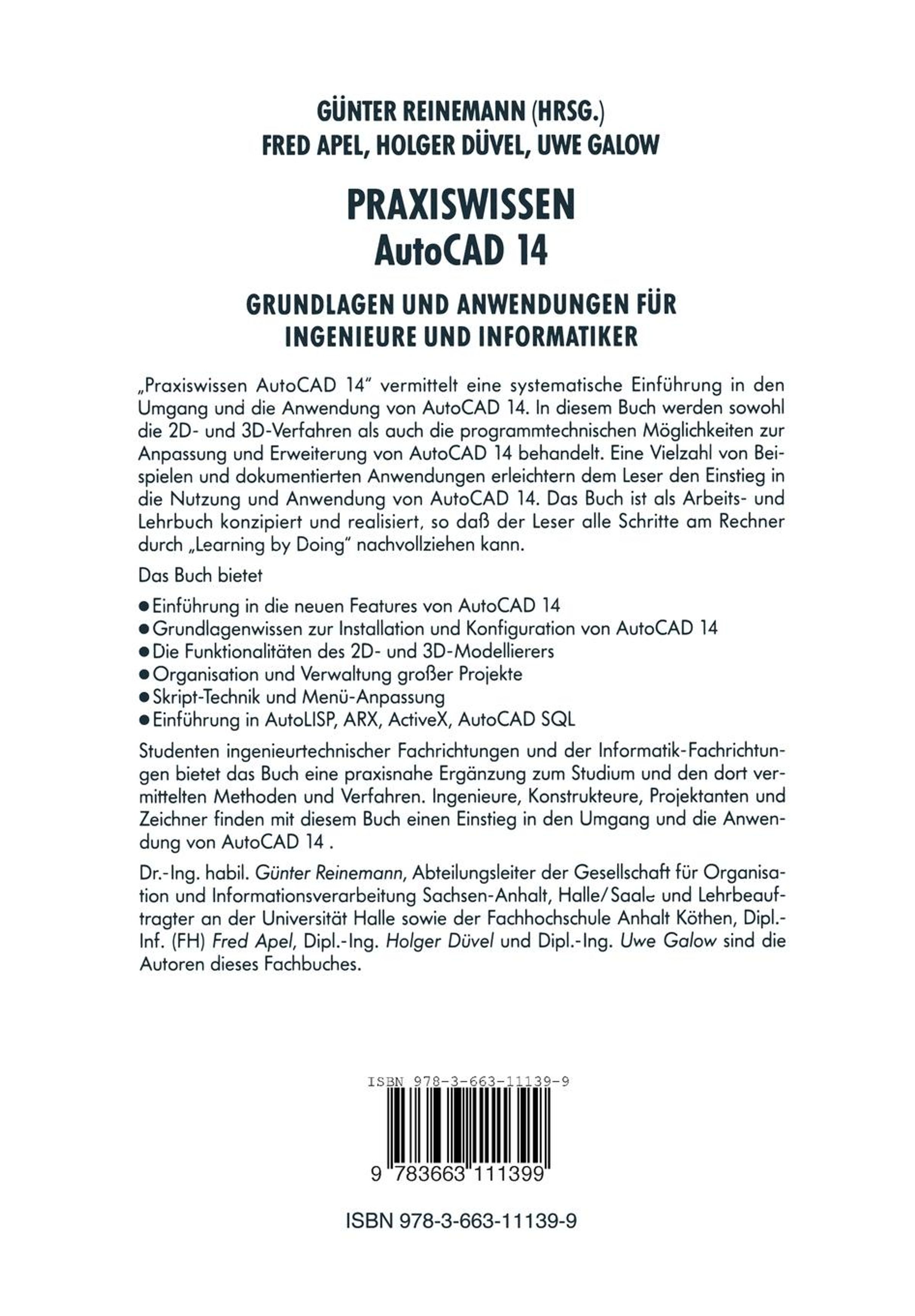 Einsteiger finden eine systematische Einführung in Umgang mit und Anwendung von AuotCAD 14. Nutzer und Anwender, die schon mit AutoCAD gearbeitet haben, lernen die neuen Möglichkeiten und werden mit dem Update von AutoCAD 14 vertraut gemacht. Versierte Fachleute und CAD-Systembetreuer erweitern ihr Praxiswissen in den einzelnen Teilbereichen. Studenten gibt das Lehrbuch eine praxisorientierte Einführung in Verfahren, Programmiermethoden und Schnittstellen von CAD-Systemen. Manager und Entscheider erhalten Entscheidungshilfen für den Einsatz von CAD-Technik.