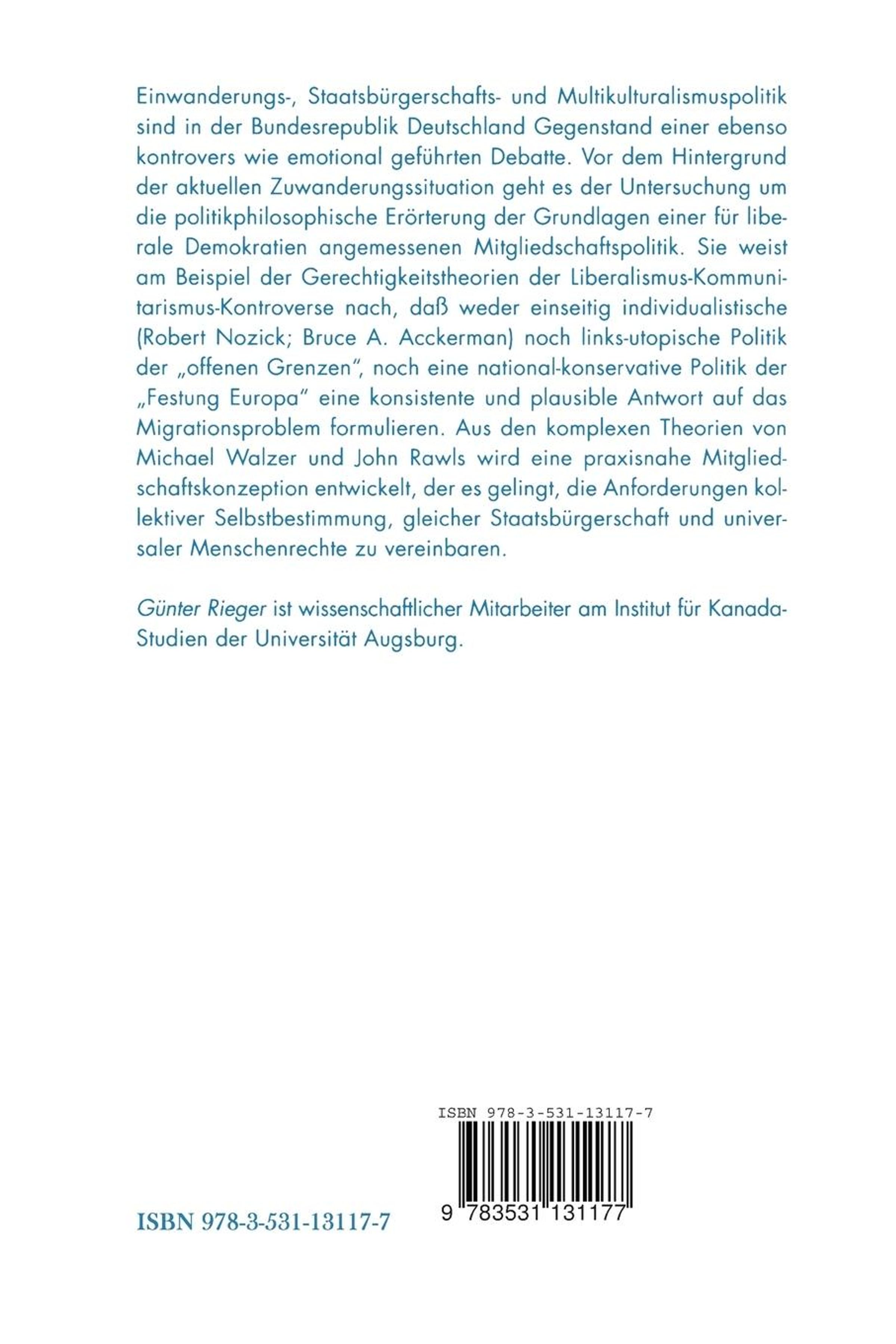 Einwanderungs-, Staatsbürgerschafts- und Multikulturalismuspolitik sind in der Bundesrepublik Deutschland Gegenstand einer ebenso kontrovers wie emotional geführten Debatte. Vor dem Hintergrund der aktuellen Zuwanderungssituation geht es der Untersuchung um die politikphilosophische Erörterung der Grundlagen einer für liberale Demokratien angemessenen Mitgliedschaftspolitik. Sie weist am Beispiel der Gerechtigkeitstheorien der Liberalismus-Kommunitarismus-Kontroverse nach, daß weder einseitig individualistische (Robert Nozick; Bruce A. Ackerman) noch links-utopische Politik der "offenen Grenzen", noch eine national-konservative Politik der "Festung Europa" eine konsistente und plausible Antwort auf das Migrationsproblem formulieren. Aus den komplexen Theorien von Michael Walzer und John Rawls wird eine praxisnahe Mitgliedschaftskonzeption entwickelt, der es gelingt, die Anforderungen kollektiver Selbstbestimmung, gleicher Staatsbürgerschaft und universaler Menschenrechte zu vereinbaren.