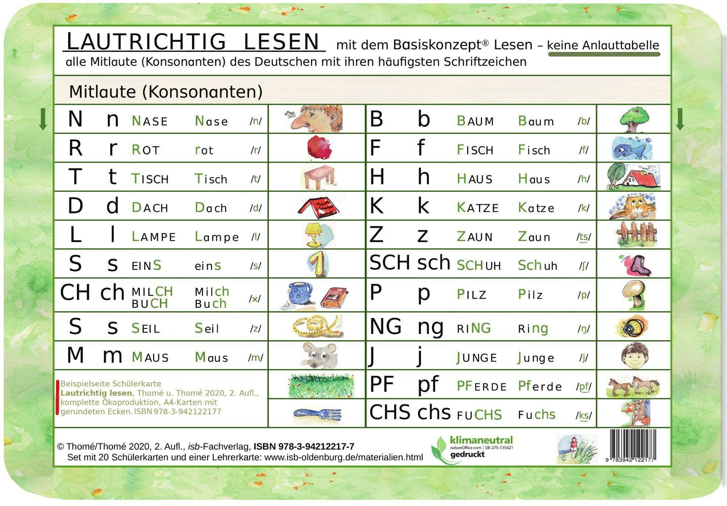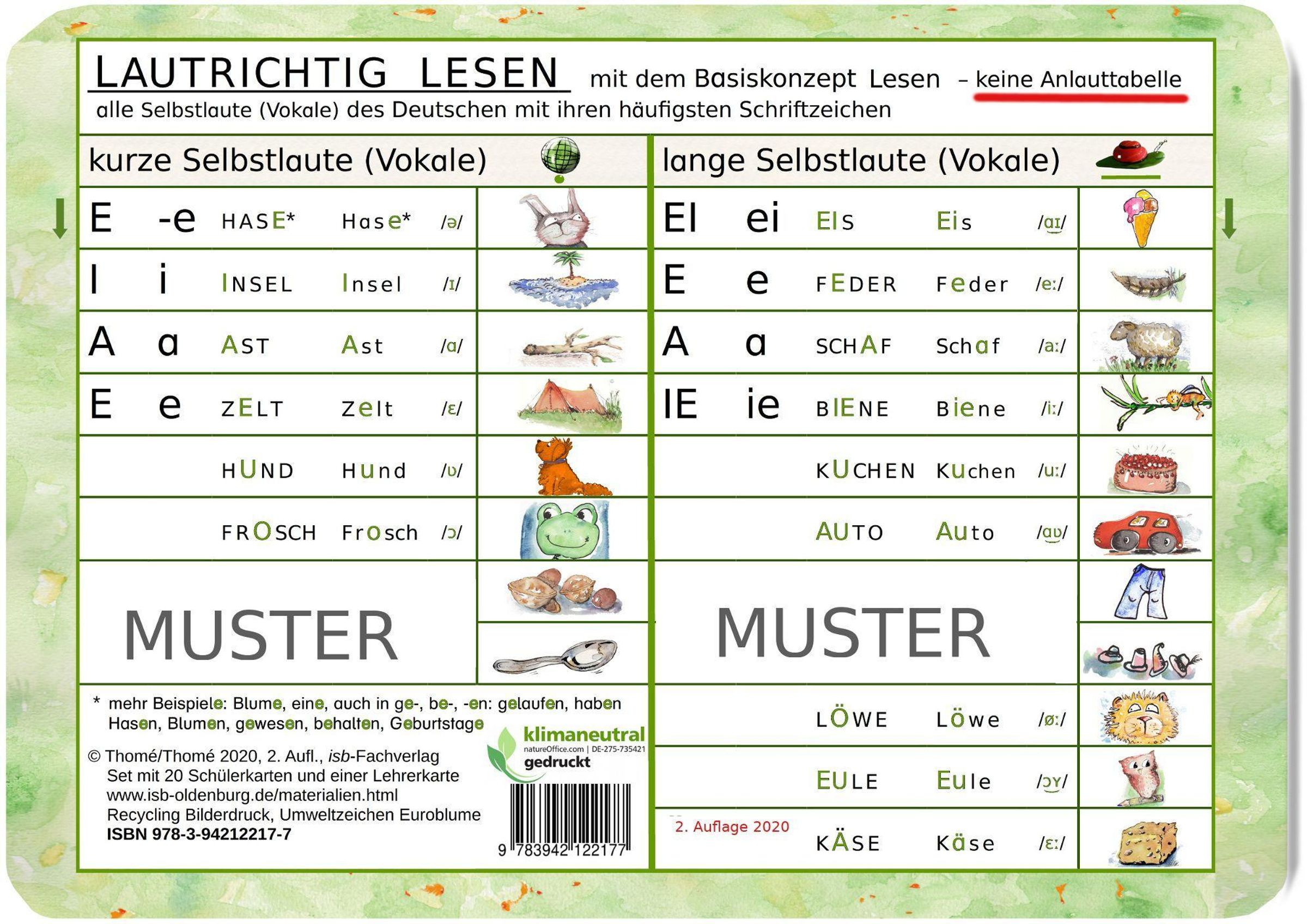 - Alle Laute des Deutschen mit ihren häufigsten Schriftzeichen, 20 identische Schülerkarten, 1 Lehrerkarte