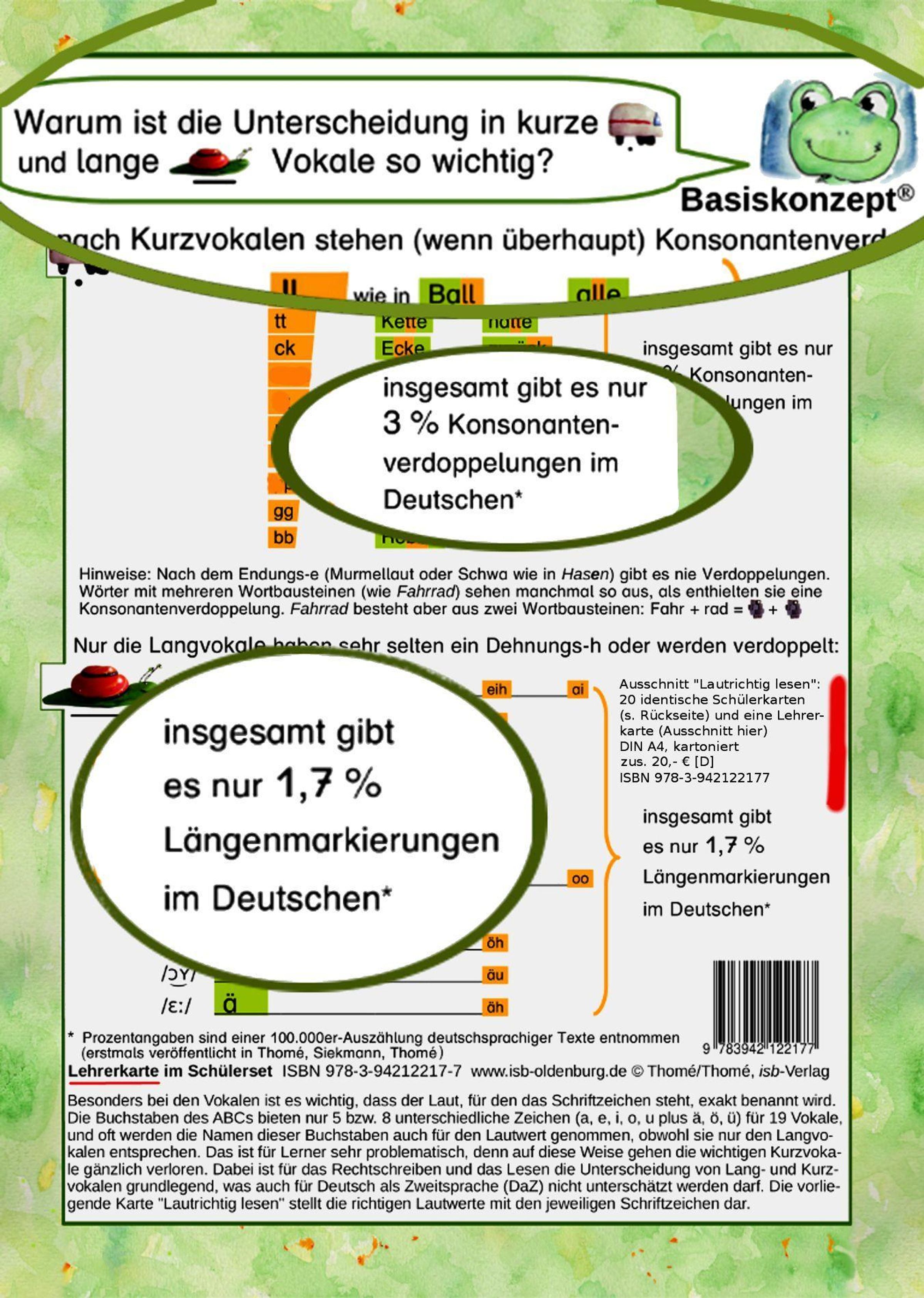Wie man die deutsche Sprache ausspricht, ist auch unter Muttersprachlern manchmal strittig. Nicht nur in den unterschiedlichen deutschen Landschaften, sondern erst recht in den beiden großen deutschsprachigen Ländern Österreich und Schweiz spricht man gewohnheitsmäßig anders als z. B. in Mainz oder Berlin. Das ist auch gut und schön so! Für die Rechtschreibung gilt das aber nicht. Und so, wie nur eine Schreibweise für die deutsche Sprache als korrekt gilt, gibt es auch nur eine Lautung, die zur richtigen Schreibweise, der Orthographie, passt. Im Paket "Lautrichtig lesen" ist dieses Verhältnis zwischen Laut- und Schrifteinheiten abgebildet. Auf 20 stabilen (identischen) Schülerkarten und einer Lehrerkarte sind die wichtigsten Informationen übersichtlich und richtig dargestellt (= keine Anlauttabelle). Das Basiskonzept Lesen von Günther und Dorothea Thomé unterstützt den Leseerwerb auf effektive Weise, da hier erstmals die Häufigkeiten der Schrifteinheiten richtig vermittelt werden.