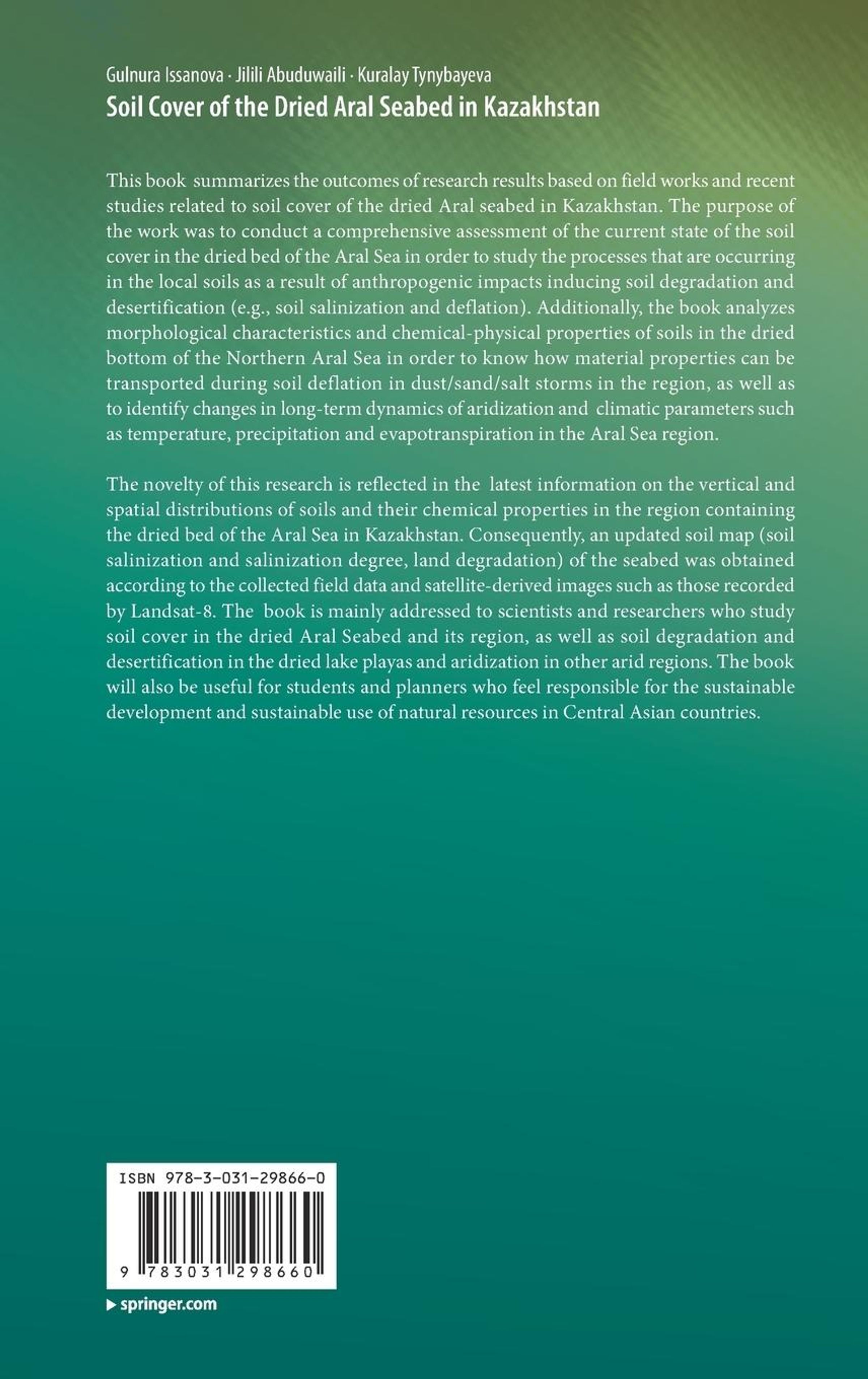 Chapter1: introduction and background on environmental changes in the dried aral sea region.- Chapter2: environmental conditions of the aral sea region.- Chapter3: origin of the aralkum desert (dried aral seabed).- Chapter4: soil cover of the dried aral seabed (aralkum).- chapter5: formation, degradation and mapping.- Chapter6: Conclusions.- Chapter7: Recommendations for the rational use of the land and water resources in the dried Aral Seabed region.