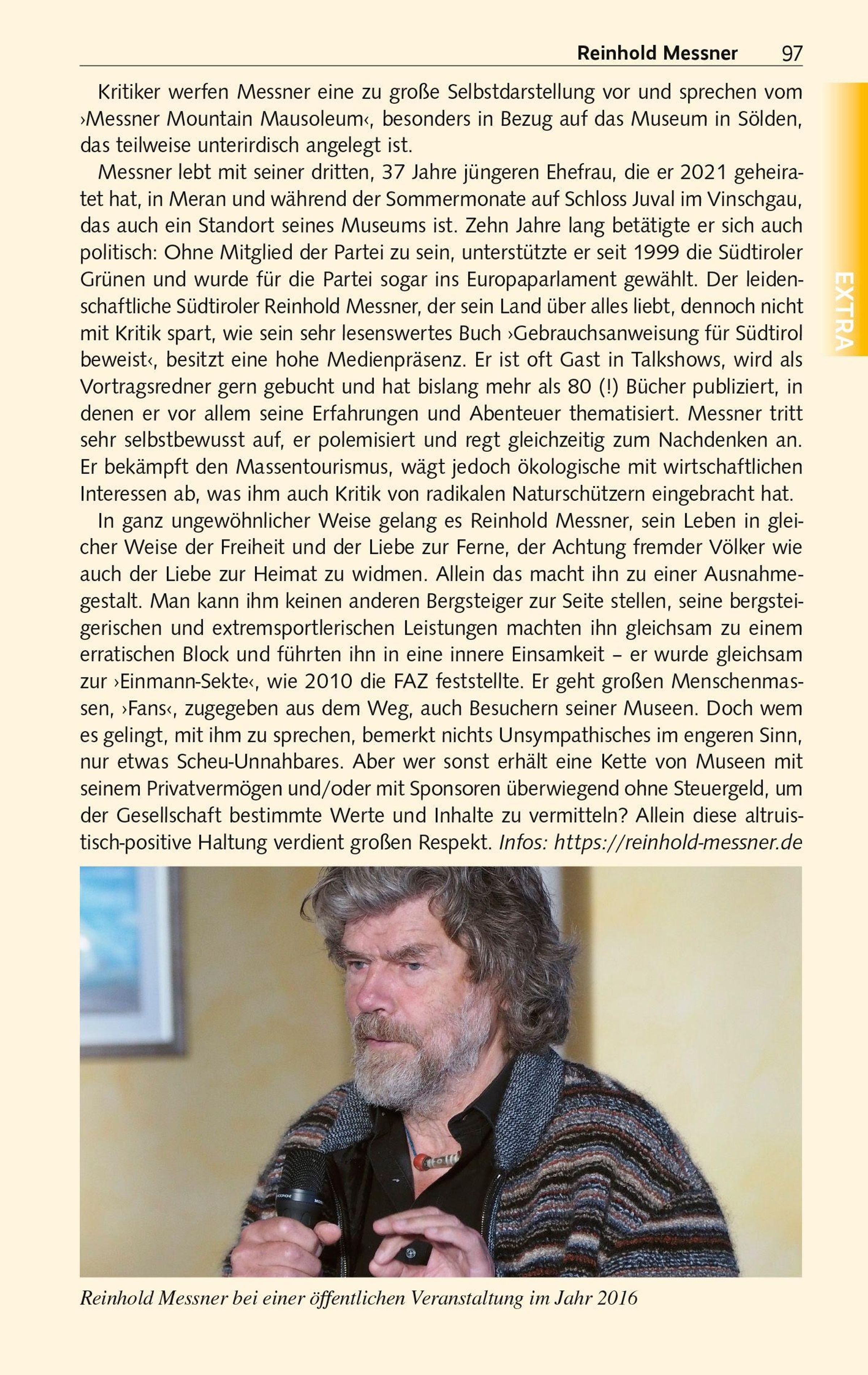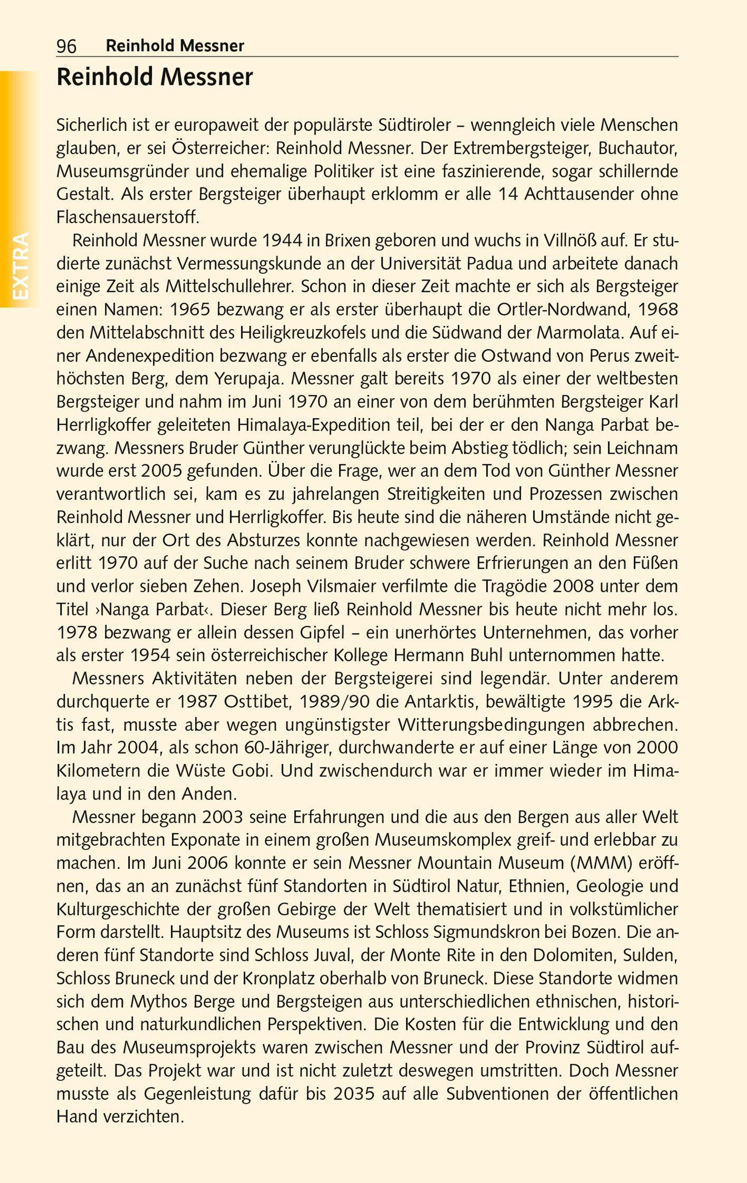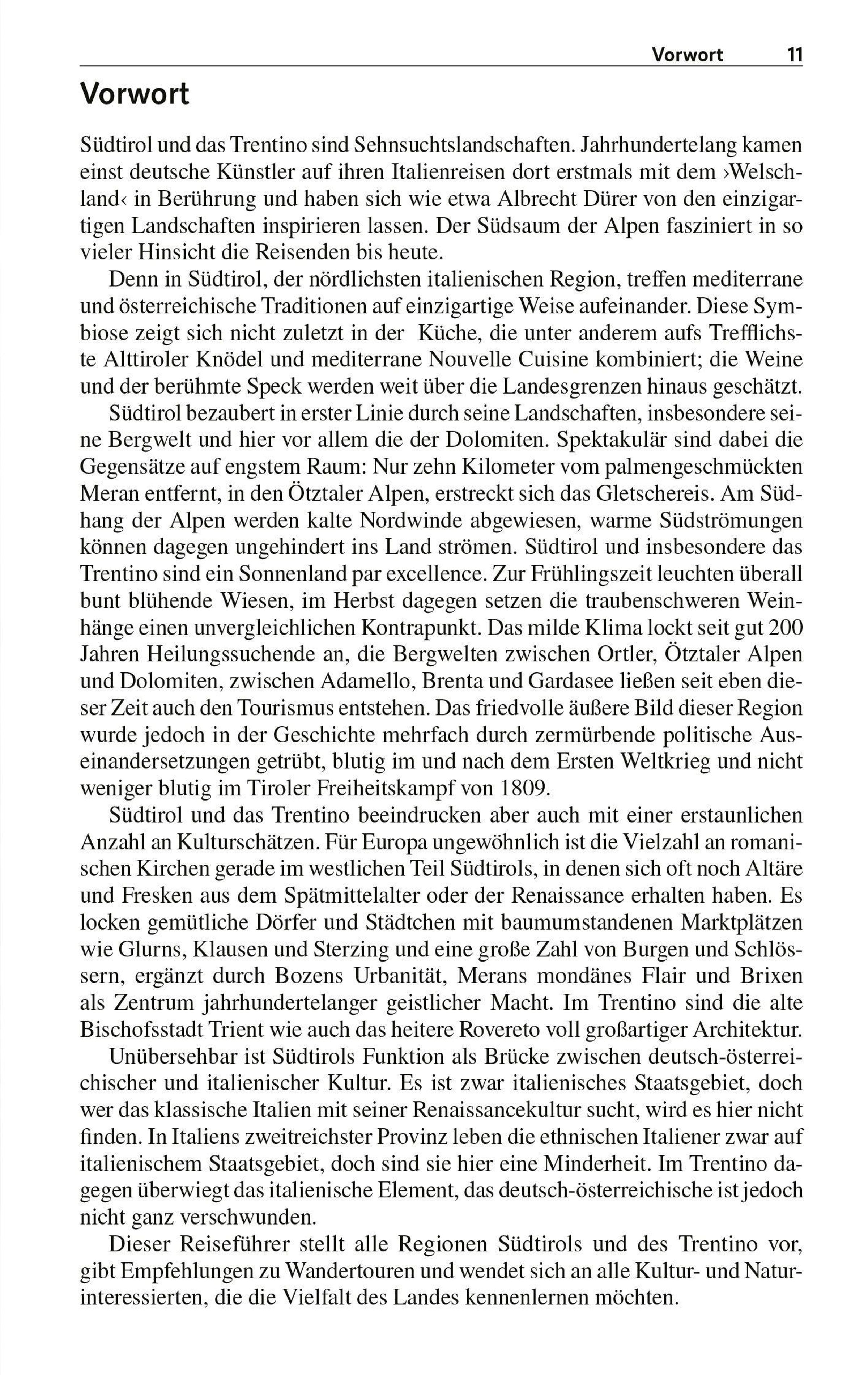 Der renommierte Reisebuchautor Gunnar Strunz lockt in beschauliche Dörfer und Städtchen, stellt die große Zahl Burgen und Schlösser vor und begleitet die Leser von Südtirol über Trient und das heitere Rovereto zum Gardasee. Von den wilden Zacken der Texelspitze führt er ins palmengeschmückte Meran, wo Dolce Vita und alpenländische Bräuche eine wunderbare Symbiose eingehen. Es geht in die alte Bischofsstadt Brixen mit Dom, pittoresken Gassen und typischen Laubengängen oder zum Kloster Neustift, wo, umgeben von idyllischen Weingärten, die Augustiner Chorherren eine der weltweit ältesten Kellereien unterhalten. Nicht zu vergessen die Landeshauptstadt Bozen, wo man im Archäologischen Museum der berühmten Gletschermumie "Ötzi" seine Aufwartung machen kann.