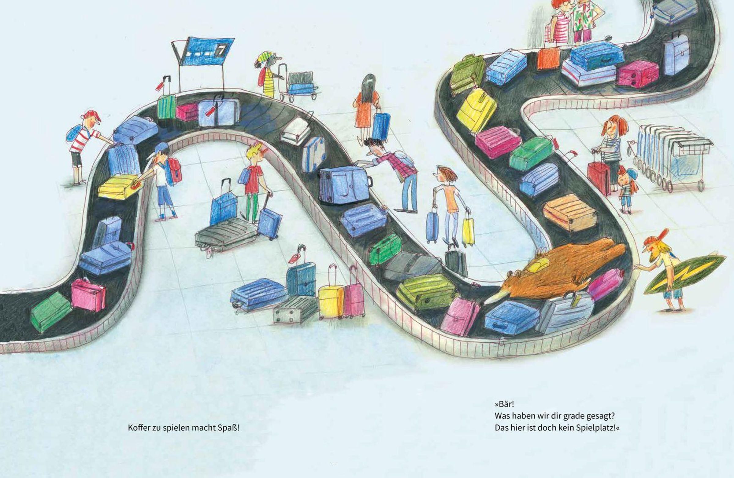Bär will verreisen. Was passt alles in den Koffer? Wann geht es endlich los? Ui, der Flughafen ist ein großer Spielplatz und Rolltreppe fahren will gelernt sein. Bär staunt über so viele Menschen. Alle müssen ihre Pässe zeigen und sich bei der Sicherheitskontrolle kitzeln lassen. Aber warum dauert das so lange? Auch Bär muss geduldig in der langen Schlange stehen. Als sie endlich im Flugzeug sitzen, heißt es: bitte anschnallen. Aber Bär muss dringend aufs Klo!
