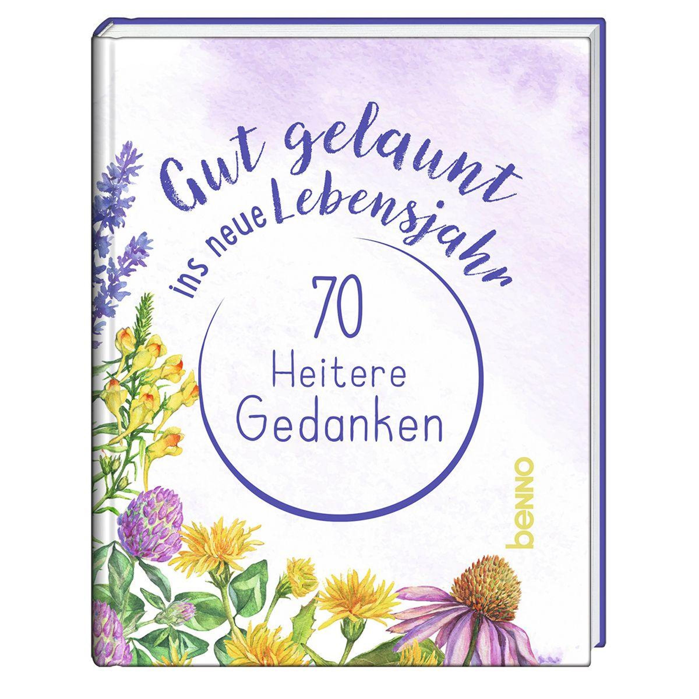 „Gut gelaunt ins neue Lebensjahr. 70 Heitere Gedanken.“ Bunte Blumenillustration umrahmt den Text., Buch