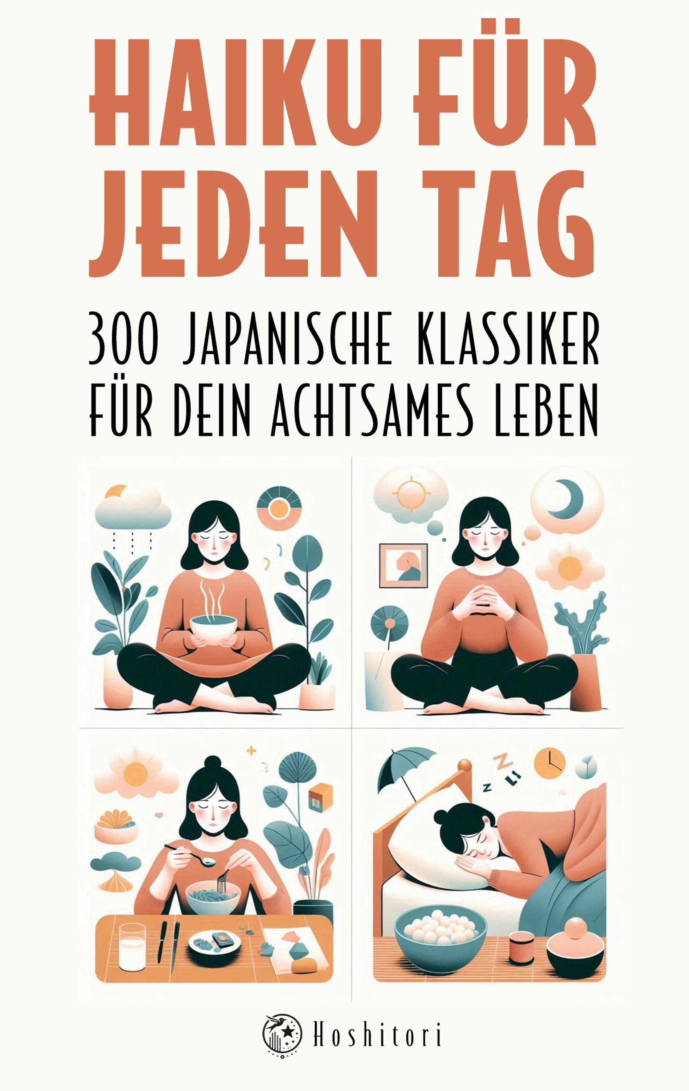 "Haiku für jeden Tag: 300 japanische Klassiker für dein achtsames Leben." Vier Illustrationen von entspannten Menschen., Buch