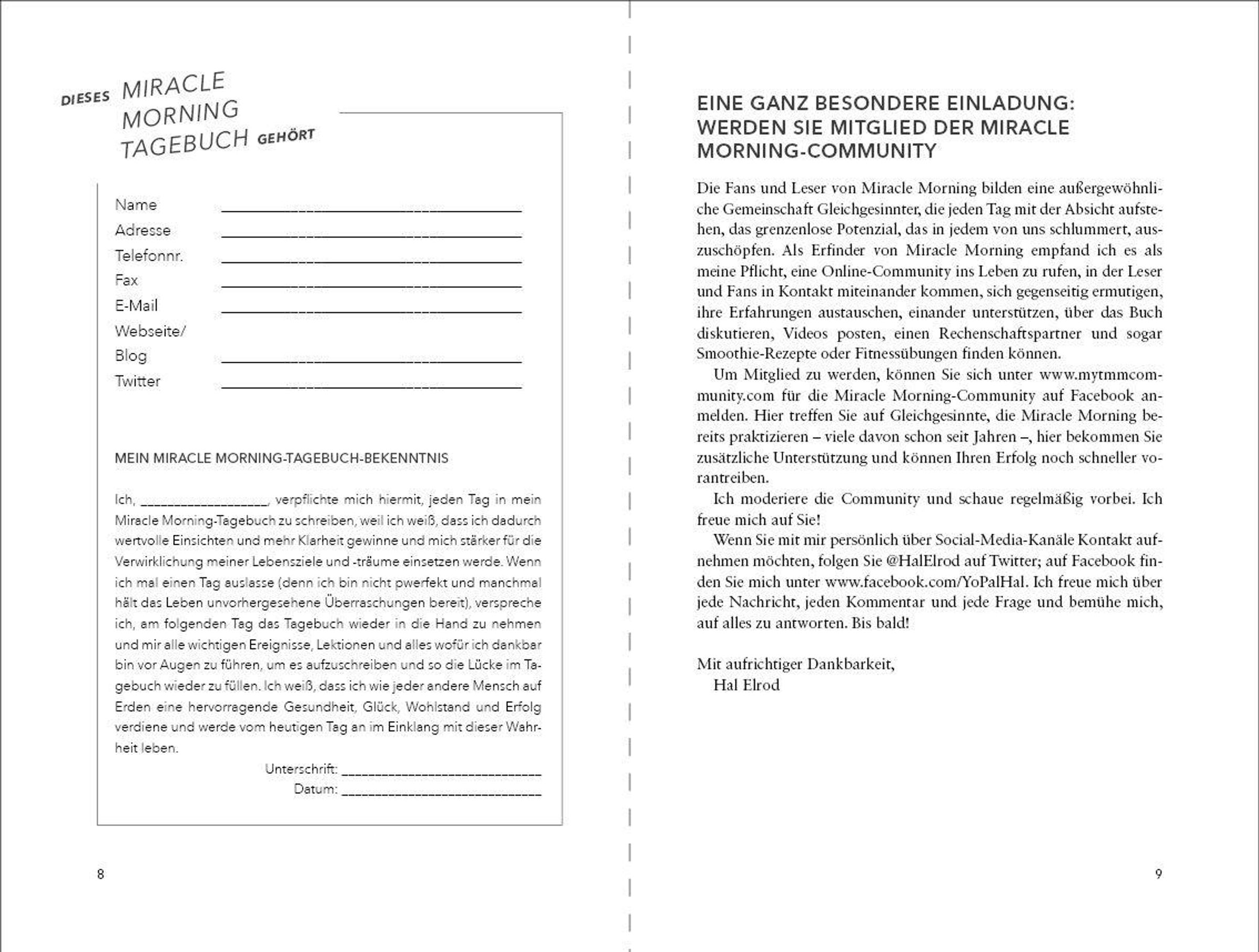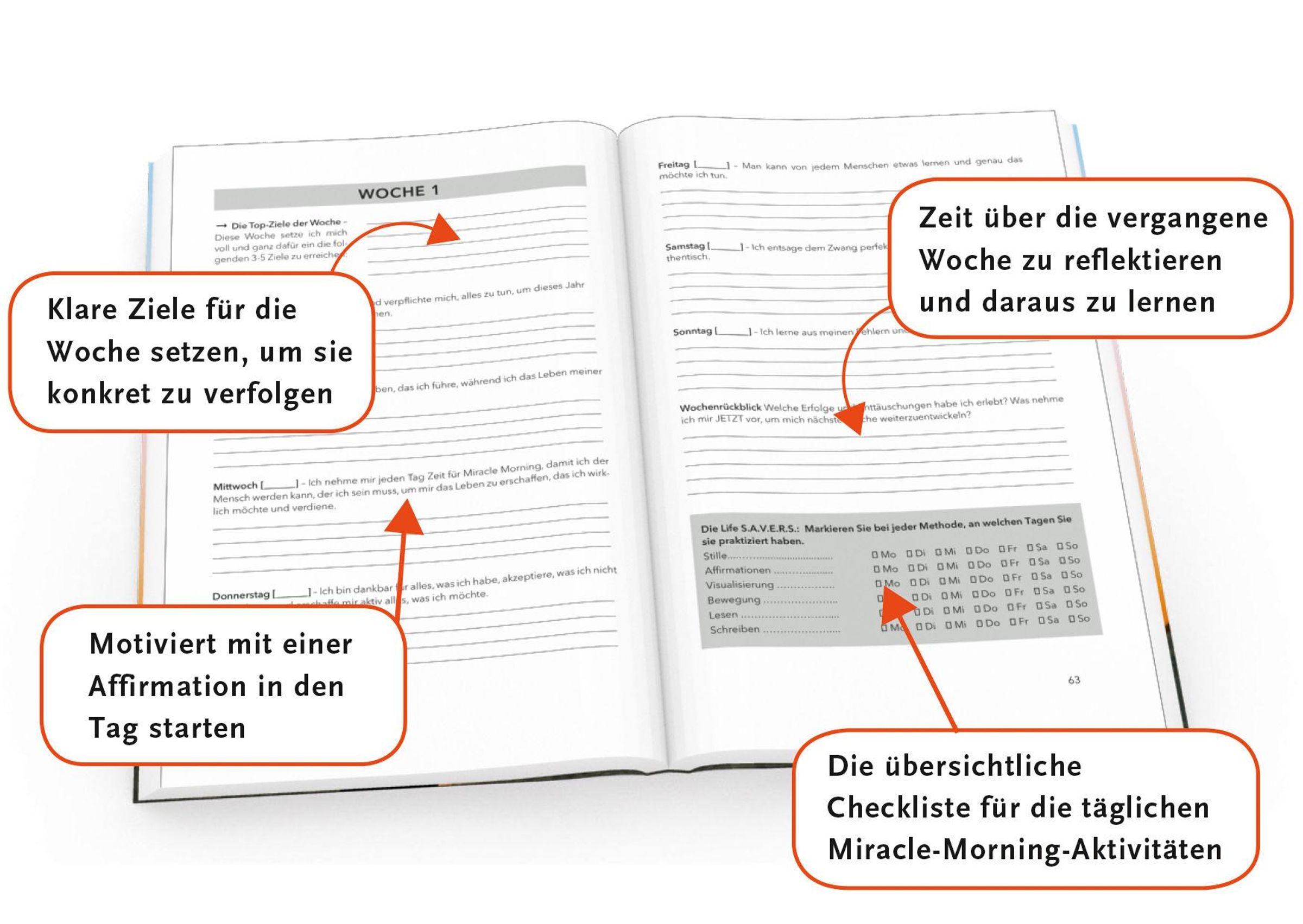 Mit dem Miracle Morning -Programm fördern Sie Ihre persönliche Entwicklung und ziehen so unweigerlich Erfolg auf allen Ebenen an. Dieses Buch erklärt die Grundprinzipien und bietet Ihnen Platz ein Jahr lang täglich Ihre Gedanken einzutragen. Zahlreiche Auswertungen bieten Ihnen den Raum über Ihre Erlebnisse zu reflektieren, um aus ihnen zu lernen.