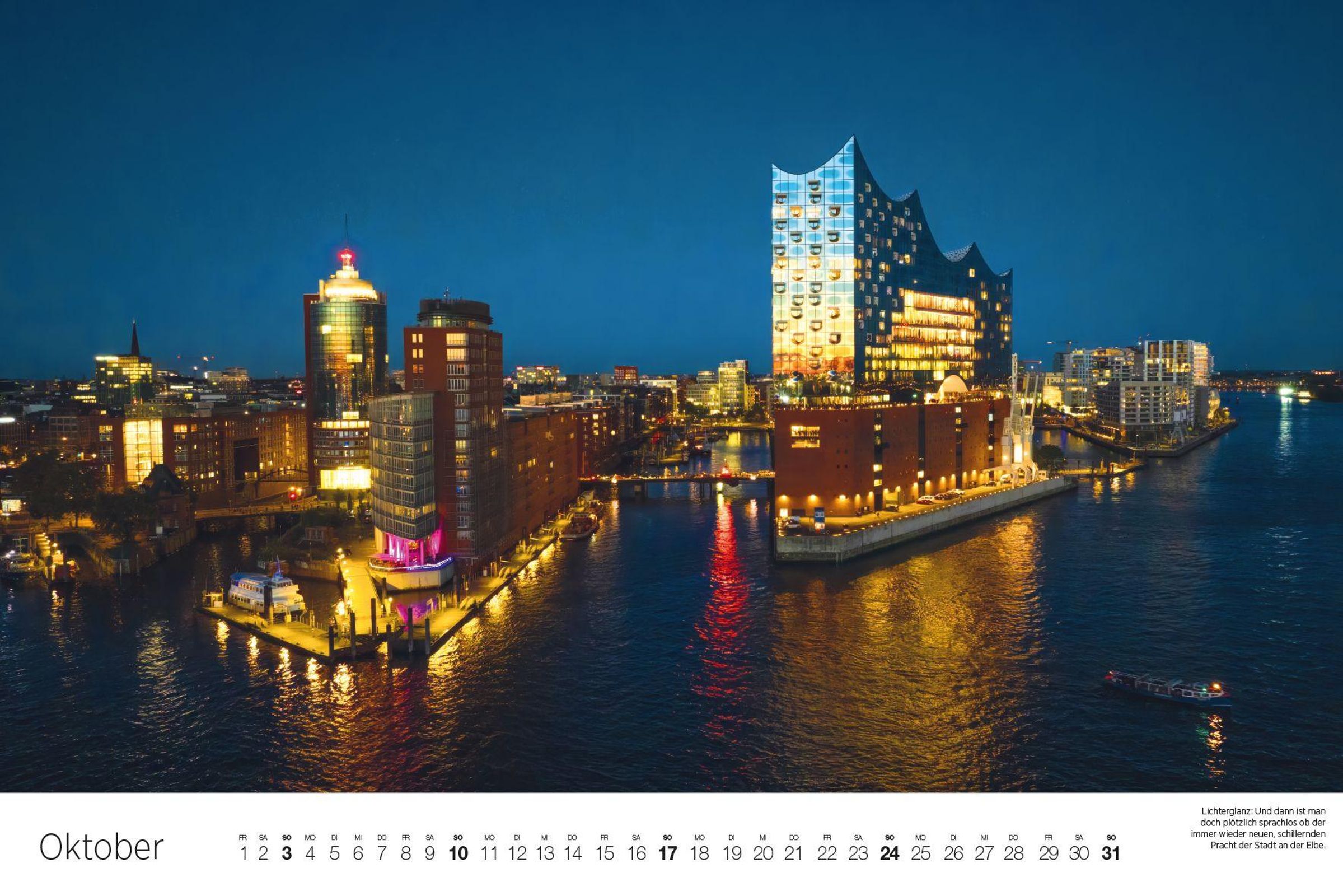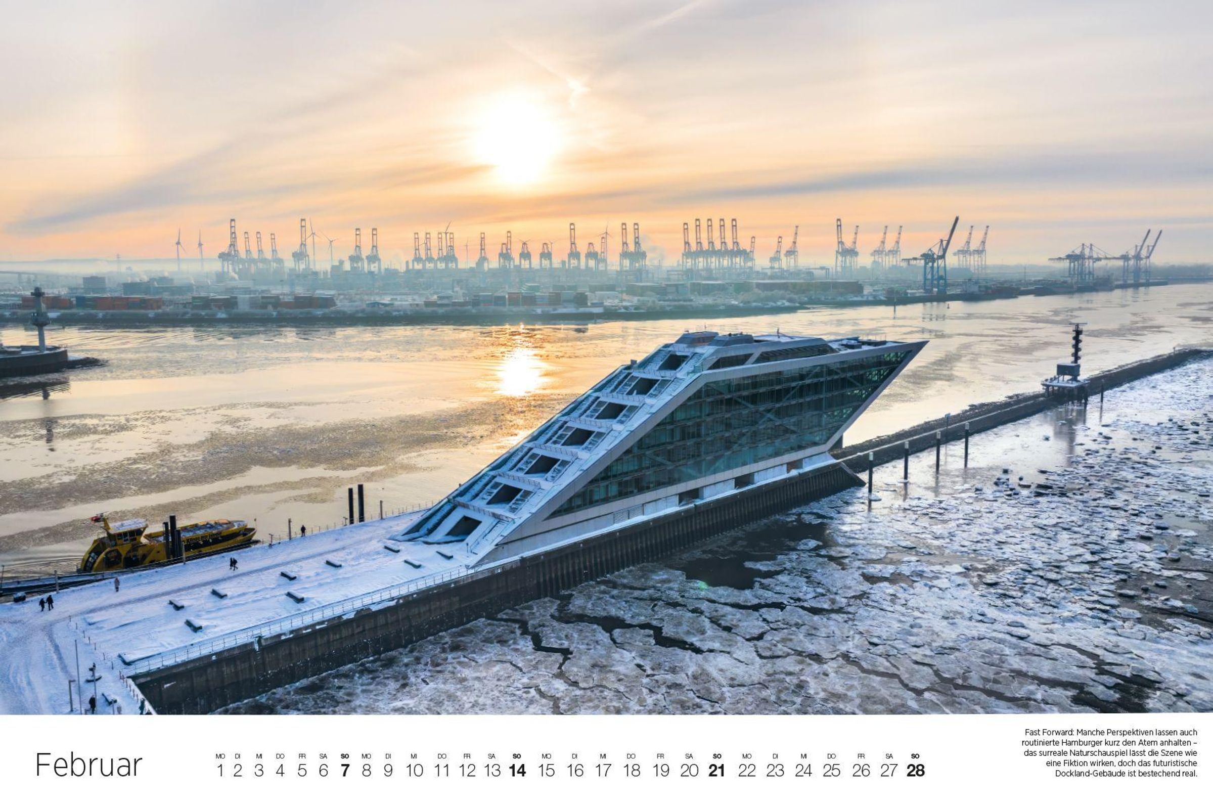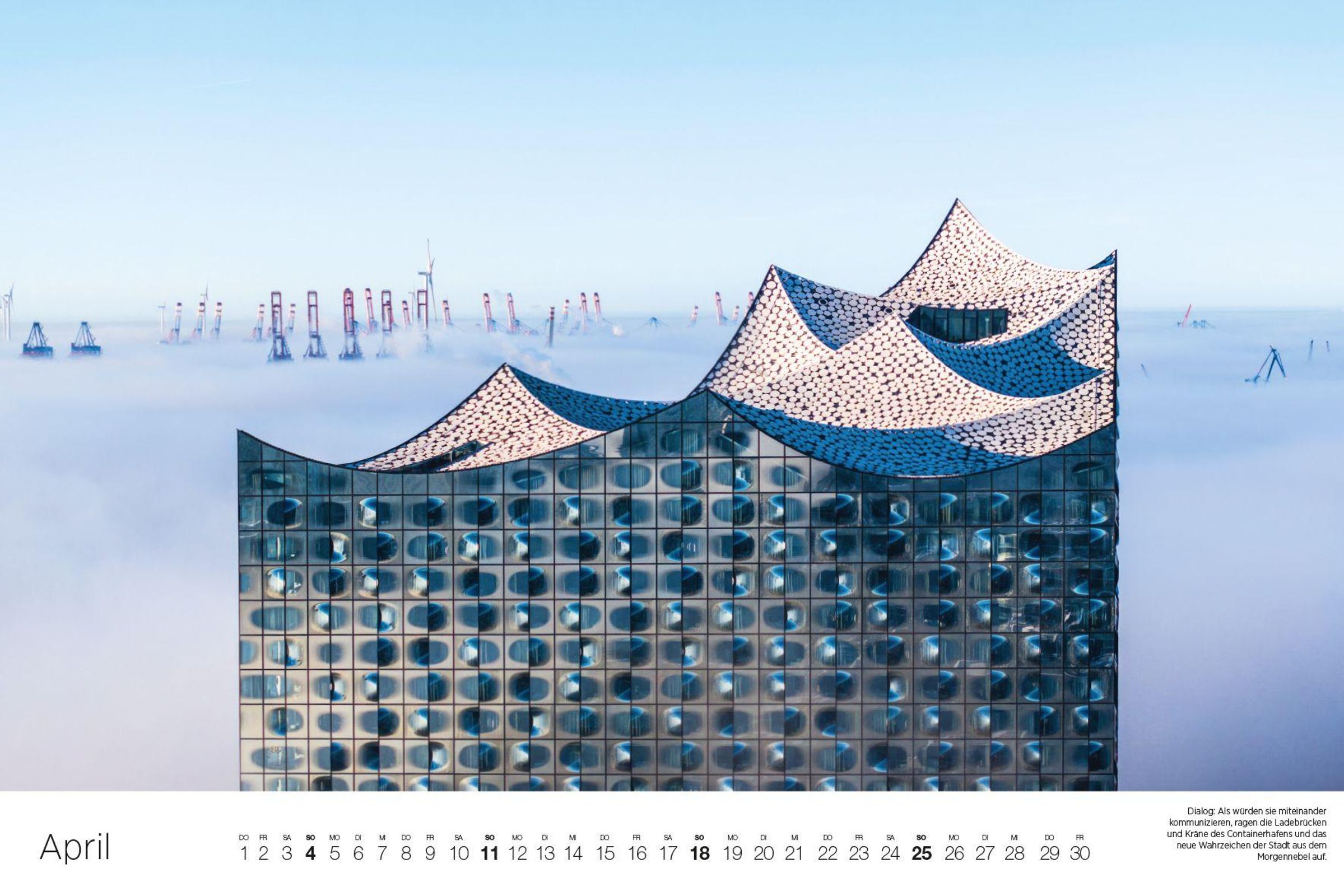 Text: "HAMBURG AUS DEN WOLKEN 2027". Eine neblige Stadtansicht mit Kirchtürmen, über die die Sonne scheint. Logo unten links., Kalender