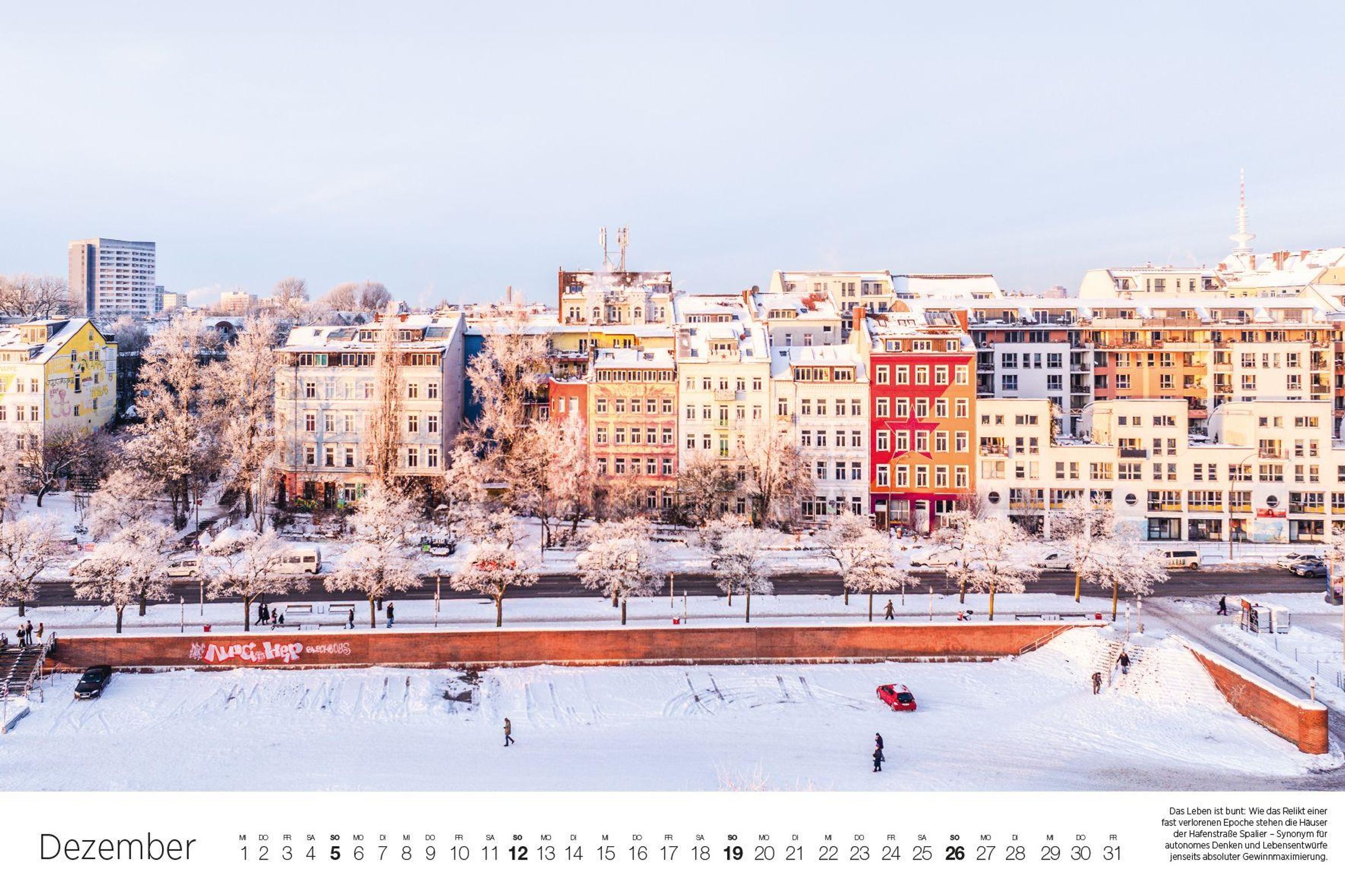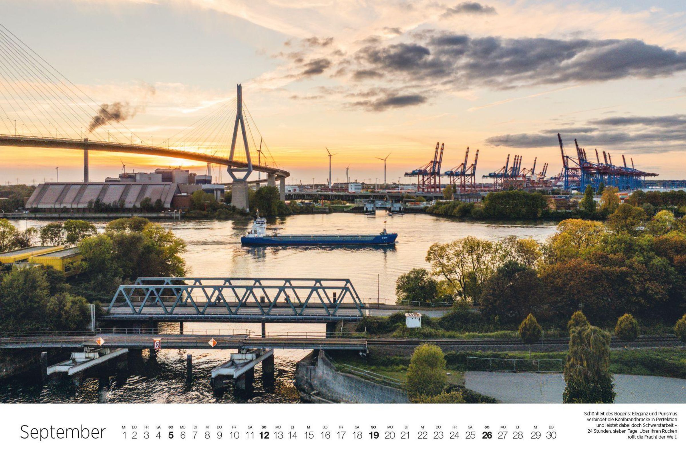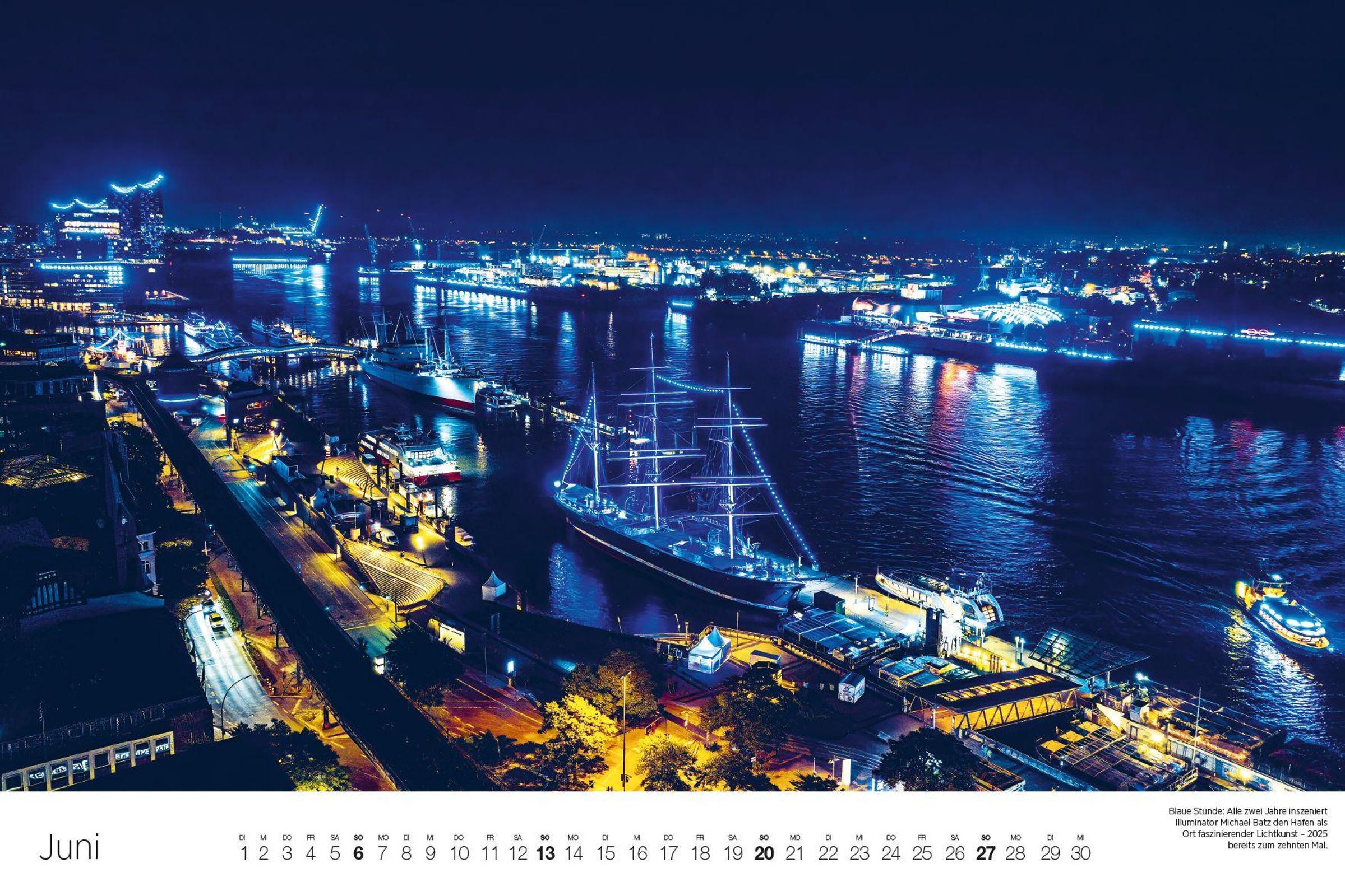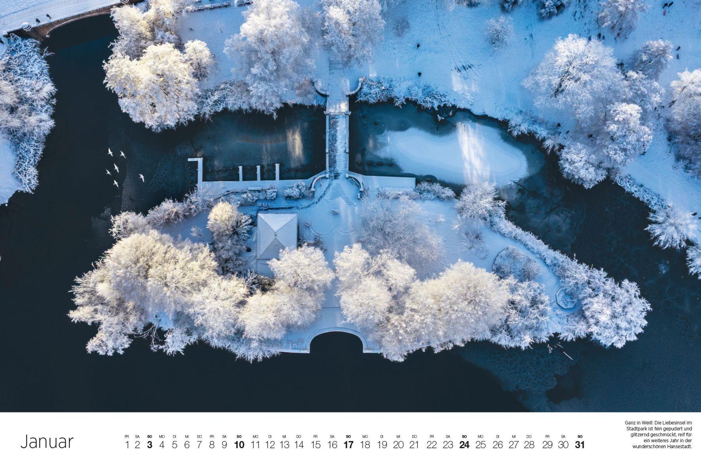 Text: "HAMBURG AUS DEN WOLKEN 2027". Eine neblige Stadtansicht mit Kirchtürmen, über die die Sonne scheint. Logo unten links., Kalender