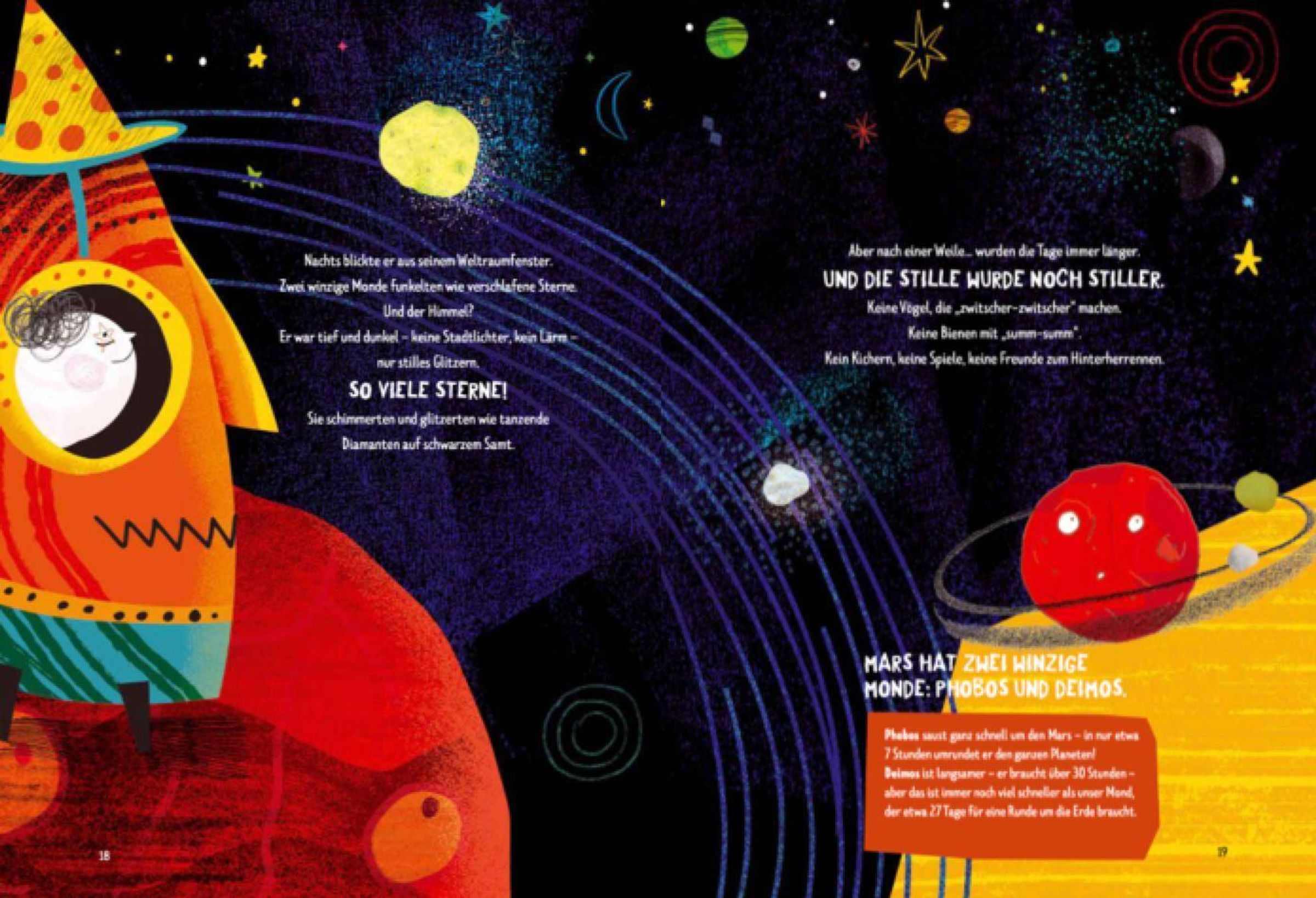 "Einmal Mars und zurück" ist eine außergewöhnliche Verbindung aus wissenschaftlicher Genauigkeit und erzählerischer Fantasie. Das Buch nimmt Kinder mit auf eine spannende Reise zum Roten Planeten und zeigt eindrucksvoll, wie das Leben dort tatsächlich wäre: mit dünner Luft, rotem Staub, schwerelosen Mahlzeiten und der großen Stille des Alls. Doch je länger der Junge auf dem Mars lebt, desto stärker wird seine Sehnsucht nach der Erde - nach ihren Geräuschen, Farben, Düften und vor allem nach Umarmungen. Diese poetische Geschichte weckt Neugier für das Universum und macht gleichzeitig bewusst, welch einzigartiger und wunderbarer Planet unsere Erde ist.