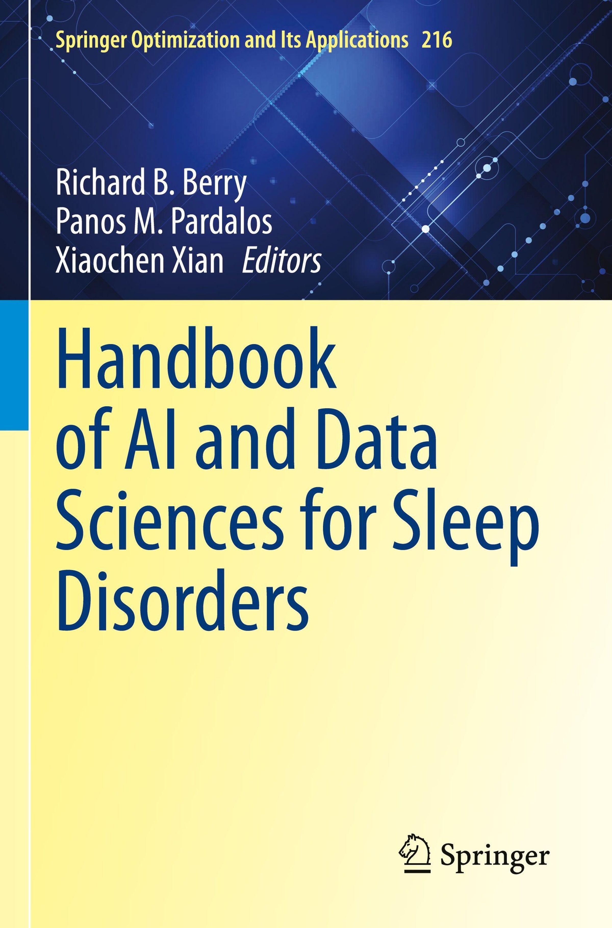 Titel: "Handbook of AI and Data Sciences for Sleep Disorders". Autoren: Berry, Pardalos, Xian. Blauer und gelber Hintergrund., Buch