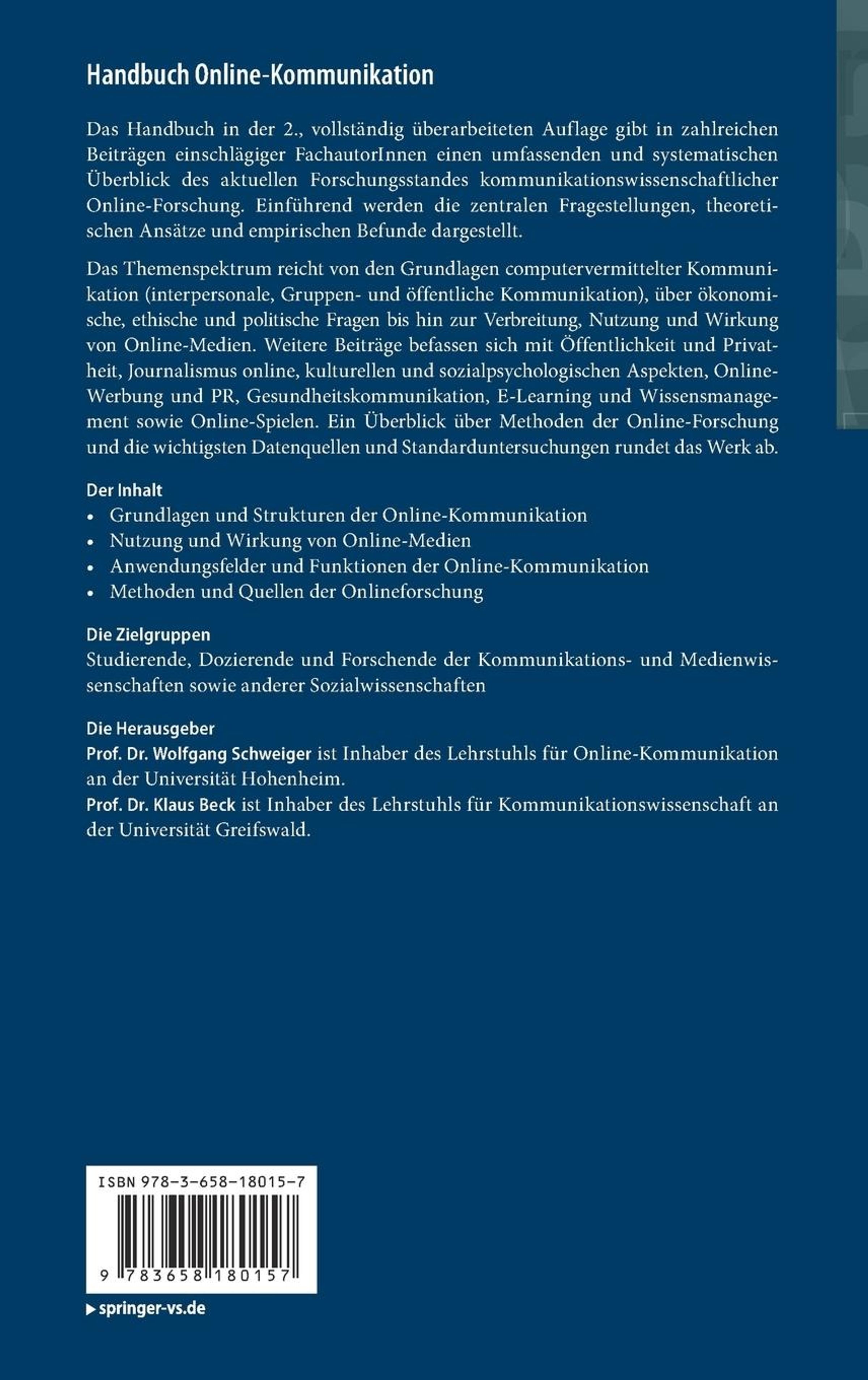 Das Handbuch in der 2., vollständig überarbeiteten Auflage gibt in zahlreichen Beiträgen einschlägiger FachautorInnen einen umfassenden und systematischen Überblick des aktuellen Forschungsstandes kommunikationswissenschaftlicher Online-Forschung. Einführend werden die zentralen Fragestellungen, theoretischen Ansätze und empirischen Befunde dargestellt.
