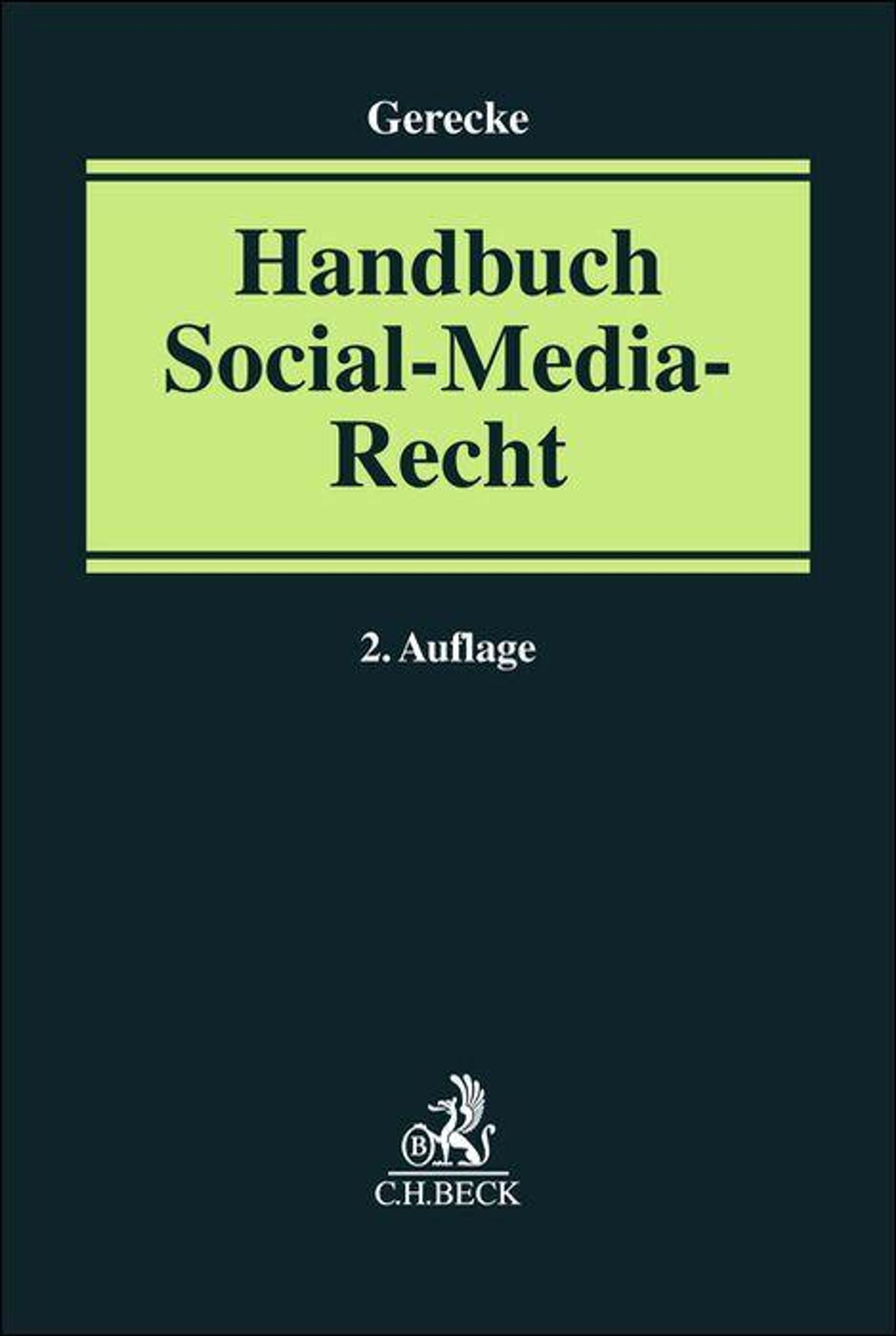 "Gerecke, Handbuch Social-Media-Recht, 2. Auflage". Dunkler Hintergrund mit grünem Textfeld und C.H. BECK Logo unten., Buch