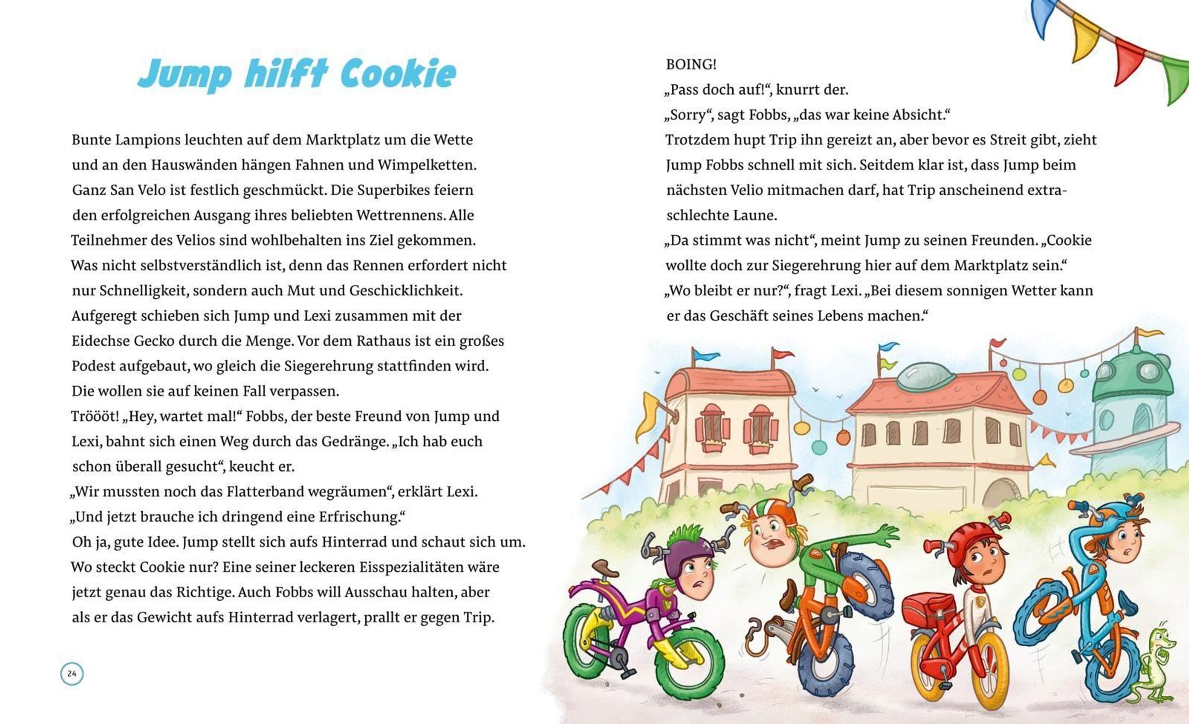 Die SUPERBIKES sind die neuen Helden im Kinderbuch! Sie sind flink und lebendig, sie reden und lachen, haben Mut und Herz , sind allerbeste Freunde und erleben gemeinsam spannende Abenteuer. Der mutige Jump traut sich, erstmals beim großen SUPERBIKES-Rennen VELIO mitzufahren. Aber sein fieser Rivale Trip fährt auch sehr schnell... Ein spannendes Duell! Gemeinsam mit seiner schlauen Freundin Lexi und seinem Kumpel Fobbs meistert Jump alle Herausforderungen. Ein großes Vorlesebuch mit vielen SUPERBIKES-Bildern. Klingeling!