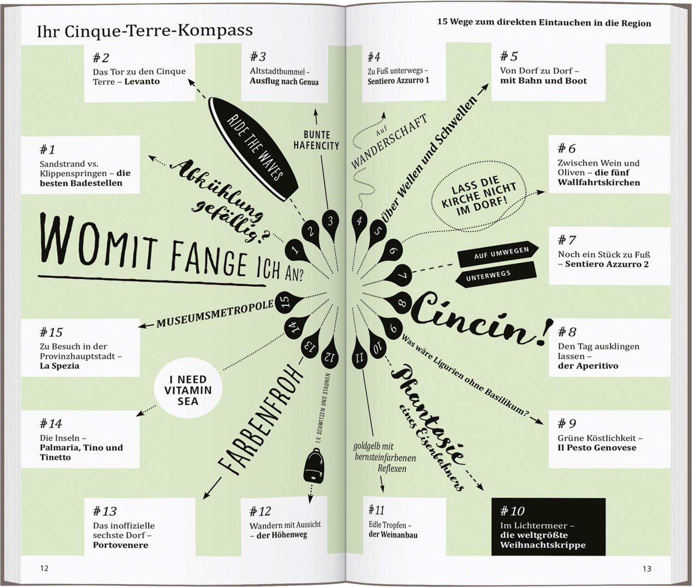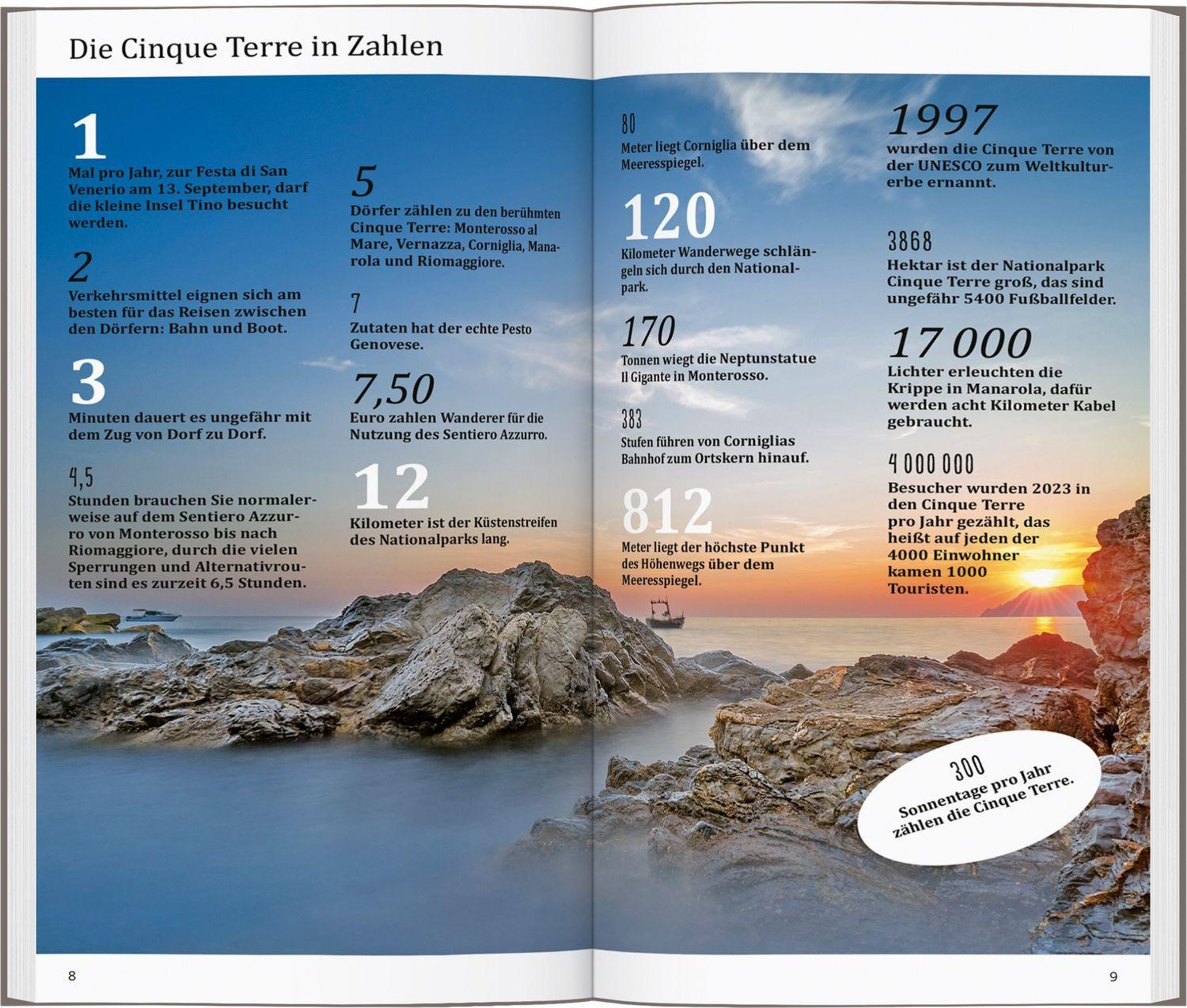Dank vieler Tipps und Adressen erfahren Sie, wo es sich in fremden Betten gut schläft, wo Sie glücklich satt werden, wohin die Menschen in Cinque Terre zum Stöbern und Entdecken gehen und wohin es sie zieht, wenn die Nacht beginnt.