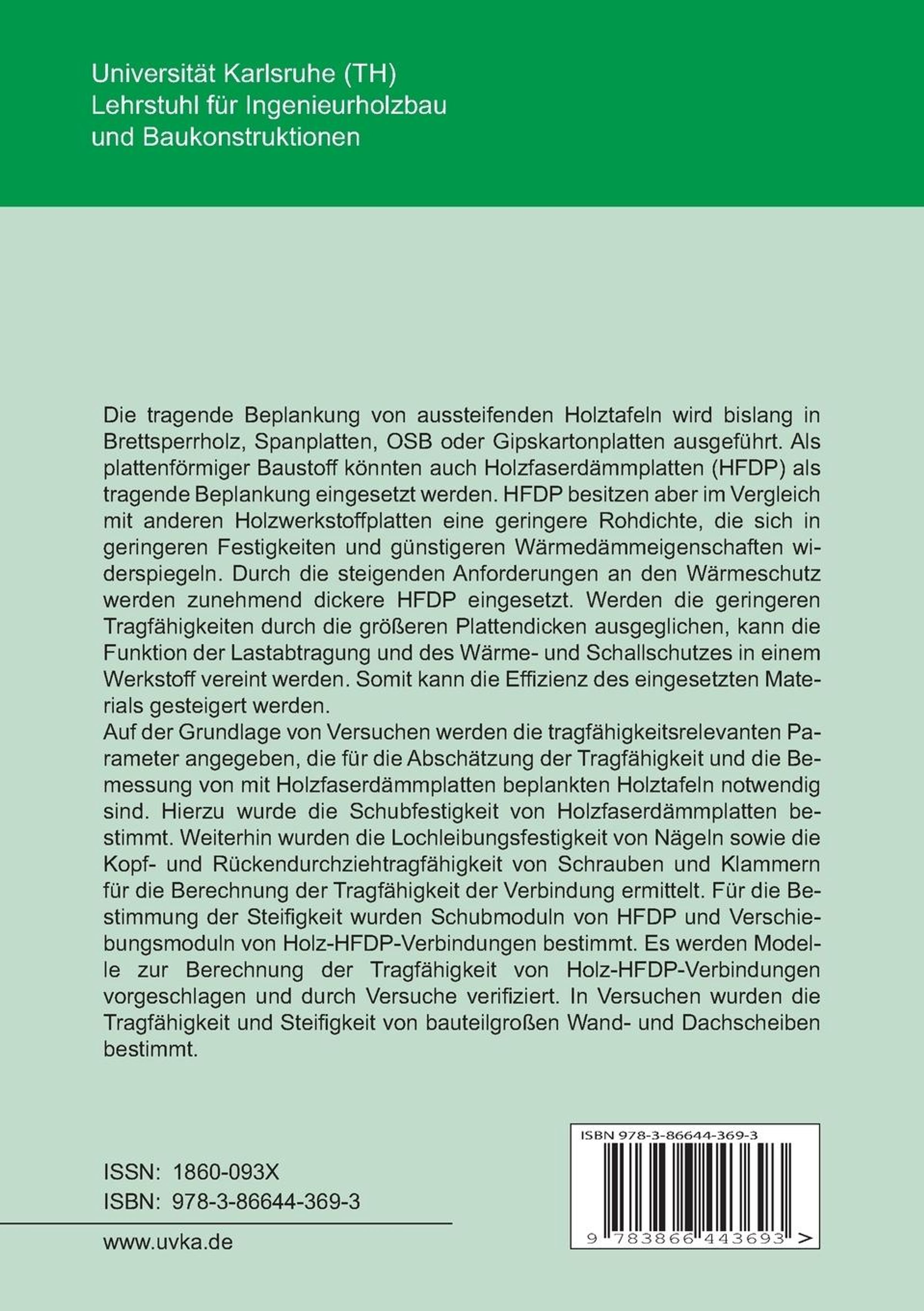 Im Rahmen dieser Arbeit wurde der Einsatz von Holzfaserdämmplatten als tragende Beplankung von aussteifenden Holztafeln untersucht. Auf der Grundlage von Versuchen werden die tragfähigkeitsrelevanten Parameter angegeben, die für die Abschätzung der Tragfähigkeit und die Bemessung notwendig sind. Es werden Modelle zur Berechnung der Tragfähigkeit von Holz-HFDP-Verbindungen vorgeschlagen. In Versuchen wurden die Tragfähigkeit und Steifigkeit von bauteilgroßen Wand- und Dachscheiben bestimmt.