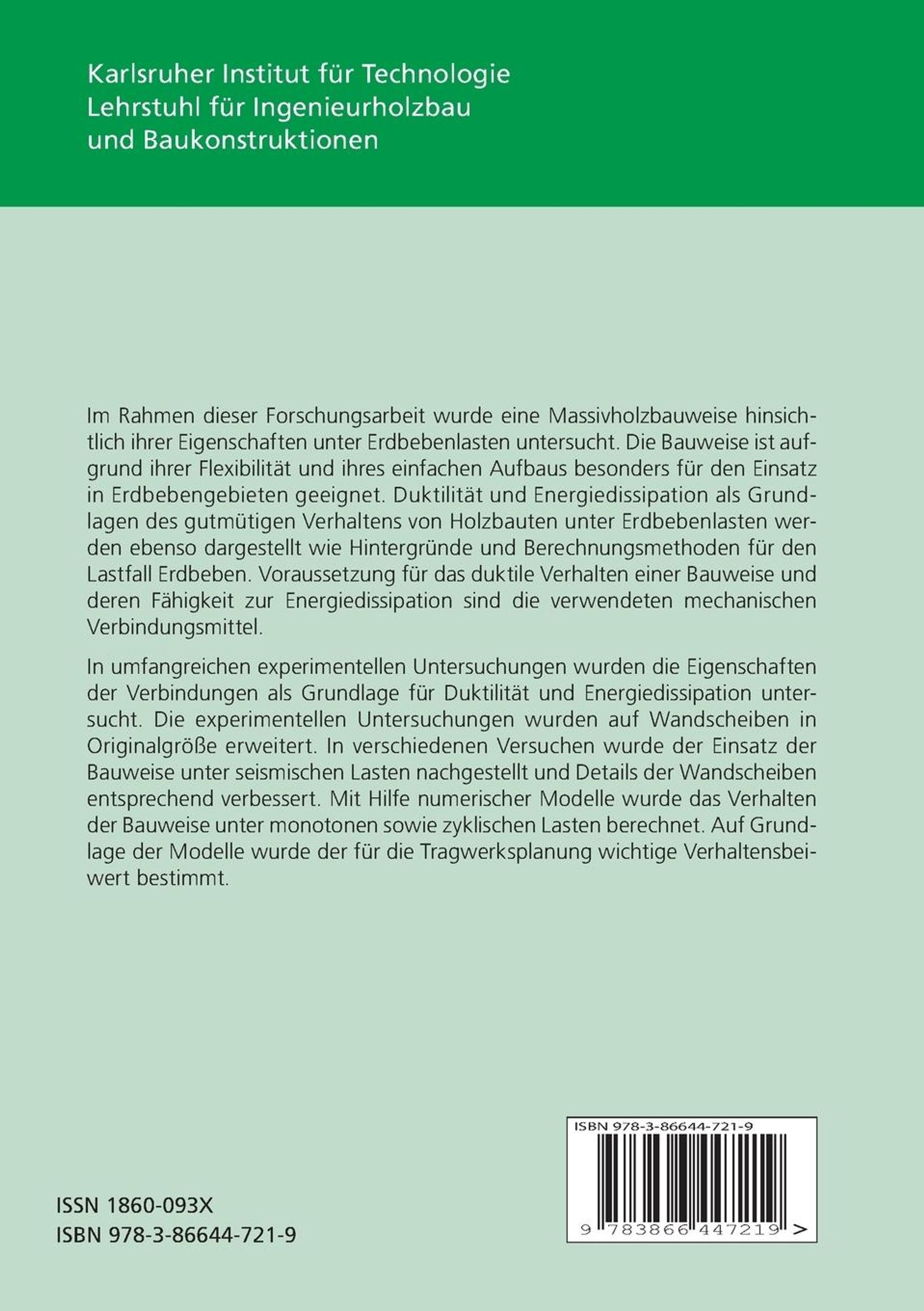 Die Eigenschaften einer Massivholzbauweise, die aufgrund ihrer Flexibilität und des einfachen Aufbaus besonders für den Einsatz in Erdbebengebieten geeignet ist, wurden untersucht. In experimentellen Untersuchungen wurden die Eigenschaften der Verbindungsmittel und von Wandscheiben in Originalgröße geprüft. Mit Hilfe numerischer Modelle wurde das Verhalten der Bauweise unter monotonen und zyklischen Lasten berechnet. Mit den Modellen wurde der Verhaltensbeiwert q bestimmt.