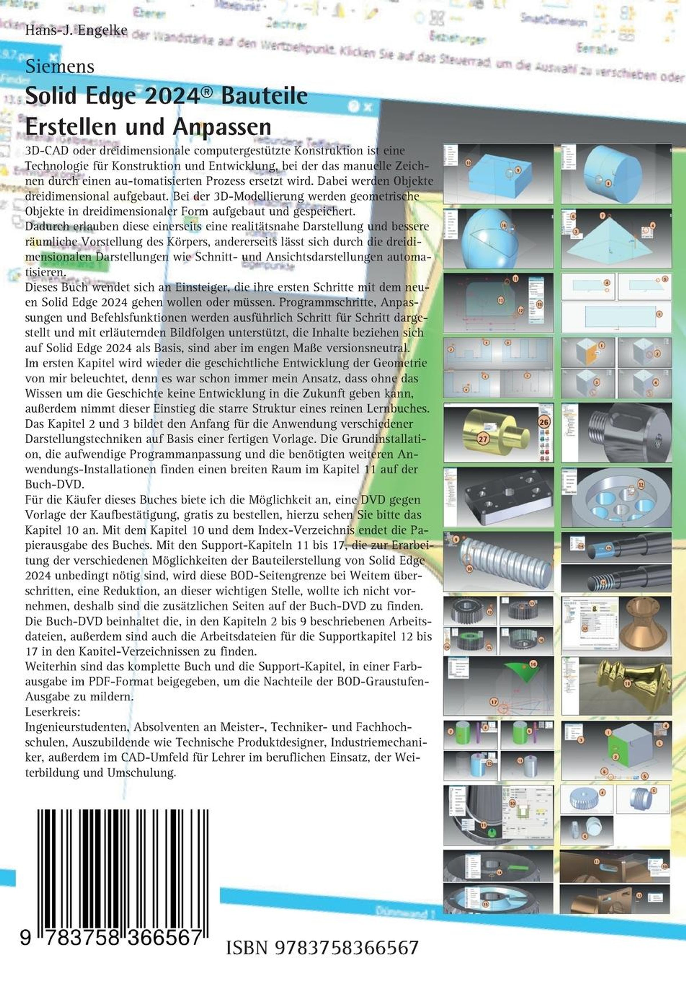 Hans-J. Engelke Siemens Solid Edge 2024® Bauteile Erstellen und Anpassen ISBN 9783758366567 3D-CAD oder dreidimensionale computergestützte Konstruktion ist eine Technologie für Konstruktion und Entwicklung, bei der das manuelle Zeichnen durch einen au-tomatisierten Prozess ersetzt wird. Dabei werden Objekte dreidimensional aufgebaut. Bei der 3D-Modellierung werden geometrische Objekte in dreidimensionaler Form aufgebaut und gespeichert. Dadurch erlauben diese einerseits eine realitätsnahe Darstellung und bessere räumliche Vorstellung des Körpers, andererseits lässt sich durch die dreidimensionalen Darstellungen wie Schnitt- und Ansichtsdarstellungen automatisieren. Dieses Buch wendet sich an Einsteiger, die ihre ersten Schritte mit der neuen Solid Edge Version 2024 gehen wollen oder müssen. Programmschritte, Anpassungen und Befehlsfunktionen werden ausführlich Schritt für Schritt dargestellt und mit erläuternden Bildfolgen unterstützt, die Inhalte beziehen sich auf Solid Edge 2024 als Basis, sind aber im engen Maße versionsneutral. Im ersten Kapitel wird wieder die geschichtliche Entwicklung der Geometrie von mir beleuchtet, denn es war schon immer mein Ansatz, dass ohne das Wissen um die Geschichte keine Entwicklung in die Zukunft geben kann, außerdem nimmt dieser Einstieg die starre Struktur eines reinen Lernbuches. Das Kapitel 2 und 3 bildet den Anfang für die Anwendung verschiedener Darstellungstechniken auf Basis einer fertigen Vorlage. Die Grundinstallation, die aufwendige Programmanpassung und die benötigten weiteren Anwendungs-Installationen finden einen breiten Raum im Kapitel 11 auf der Buch-DVD. Mit den Kapitel 4 bis 9 und 12 bis 17, die zur Erarbeitung der verschiedenen Möglichkeiten der Bauteilerstellung von Solid Edge 2024 unbedingt nötig sind, wird diese BOD-Seitengrenze bei Weitem überschritten, eine Reduktion, an dieser wichtigen Stelle, wollte ich nicht vornehmen, deshalb sind die zusätzlichen Seiten auf der Buch-DVD zu finden. Für die Käufer dieses Buches biete ich die Möglichkeit an, eine DVD gegen Vorlage der Kaufbestätigung, gratis zu bestellen. Die Buch-DVD beinhaltet die, in den Kapiteln 3 bis 9 und Supportkapitel 12 bis 17, beschriebenen Arbeitsdateien. Weiterhin sind das komplette Buch und die Support-Kapitel, in einer Farbausgabe im PDF-Format beigegeben, um die Nachteile der Graustufen-Ausgabe zu mildern.
