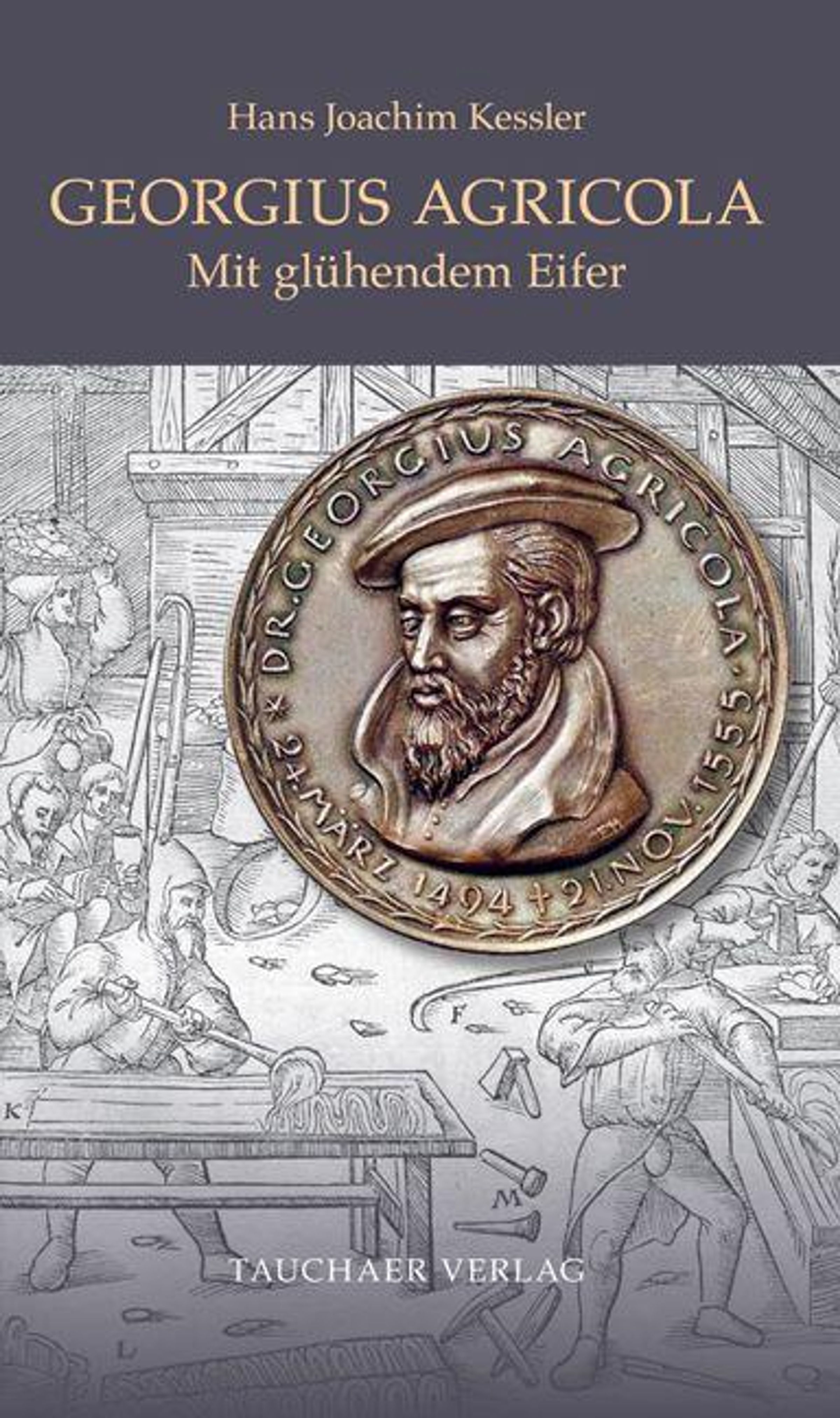 „Georgius Agricola: Mit glühendem Eifer“, Münzbildnis eines Mannes, mittelalterliche Zeichnung im Hintergrund, Tauchaer Verlag., Buch