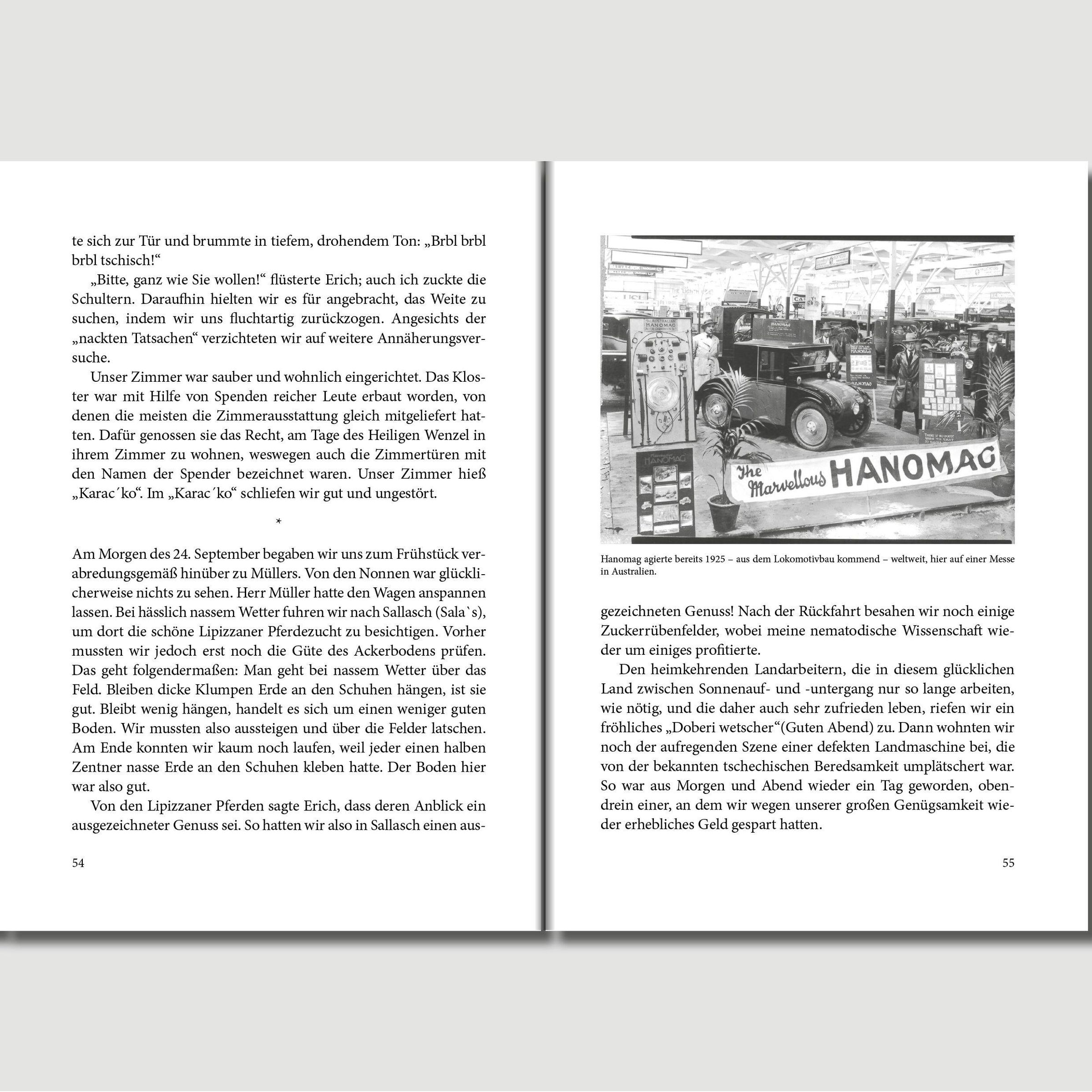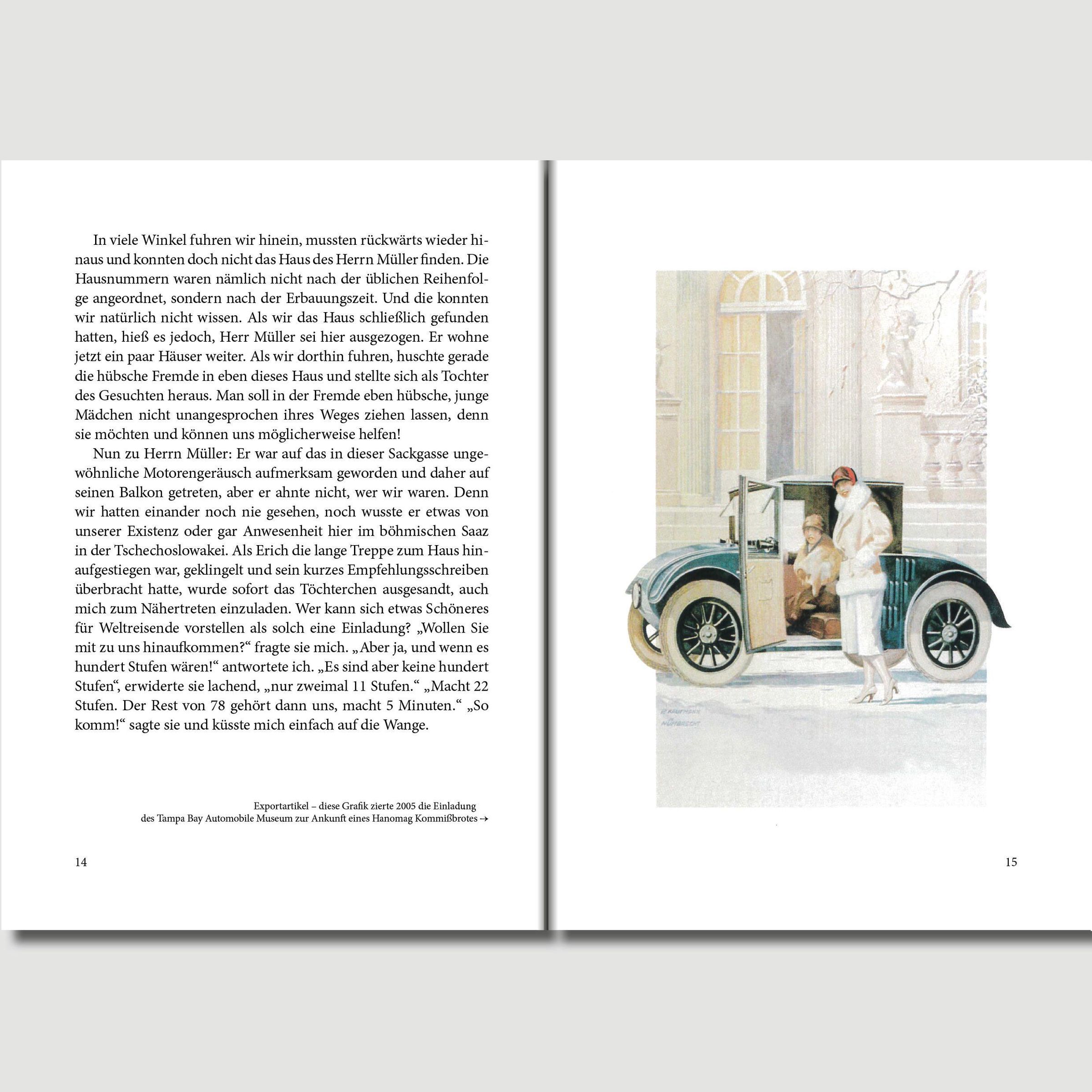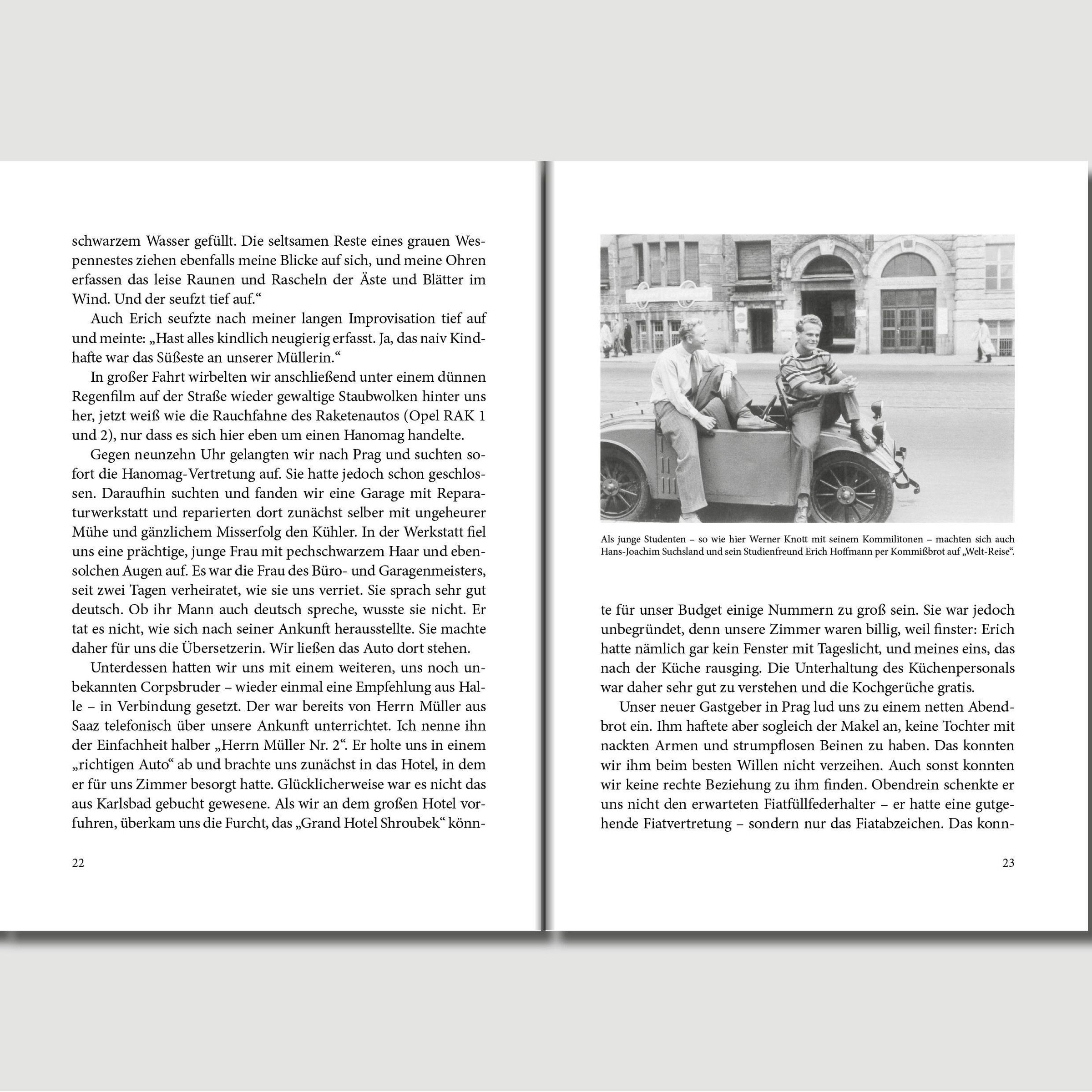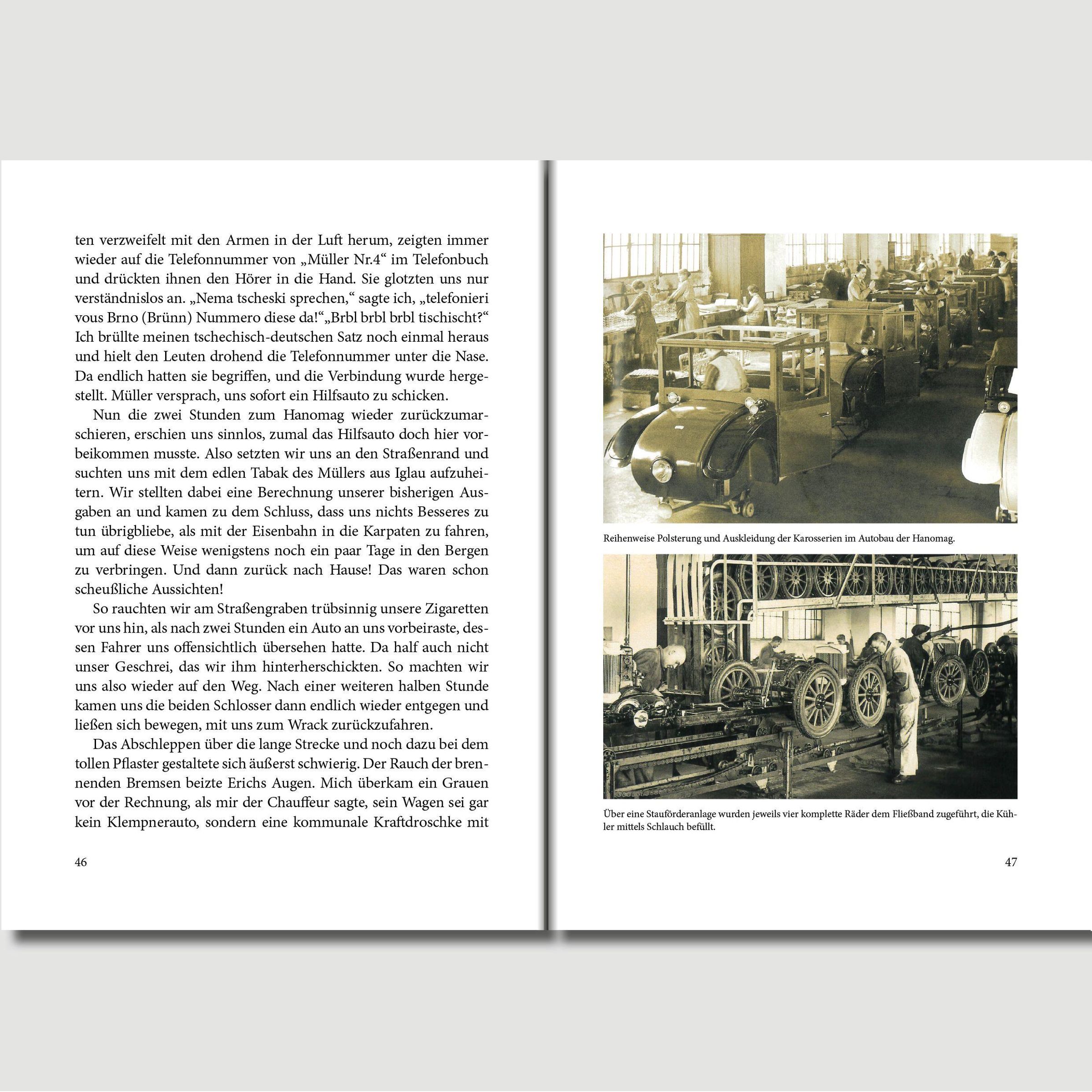 Mit viel Mut, wenig Geld und einem gebraucht erworbenen, notdürftig reparierten Hanomag Typ 2 / 10 gingen mein Vater und sein Studienfreund 1928 auf "Weltreise". Weder der Jurastudent noch der angehende Agrarwissenschaftler hatten viel Fahrpraxis. Dennoch starteten sie mit dem in Hannover-Linden gebauten kleinen Hanomag, liebevoll "Kommissbrot" genannt, von Halle / Saale aus dieses Wagnis. Schwierige Straßenverhältnisse, Pannen, mühsame Ersatzteilbeschaffung und Beinah-Unfälle waren häufige Begleiter auf ihrer Fahrt. Dank einiger Empfehlungsschreiben der Universität wurde den beiden "Weltreisenden" in den fremden Ländern manche Tür geöffnet. So trat der Ernstfall auch nie ein, mangels eines Bettes unter dem Auto nächtigen zu müssen. Dafür gab es genügend andere Abenteuer, vergnügliche und unangenehme, und nicht zuletzt auch einige amouröse. Leider nahm die Reise nach knapp fünf Wochen ein jähes Ende. Das treue Kommissbrot hat Halle nie wiedergesehen.