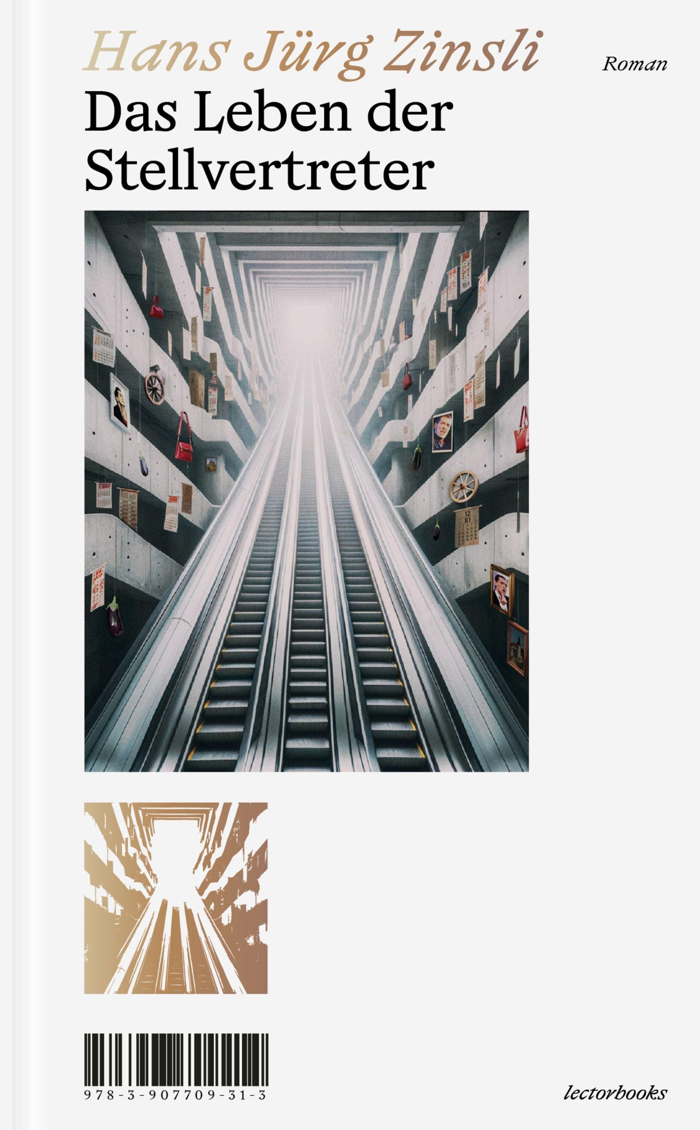 Titel: "Das Leben der Stellvertreter" von Hans Jürg Zinsli. Untertitel: Roman. Illustration einer langen Rolltreppe., Buch