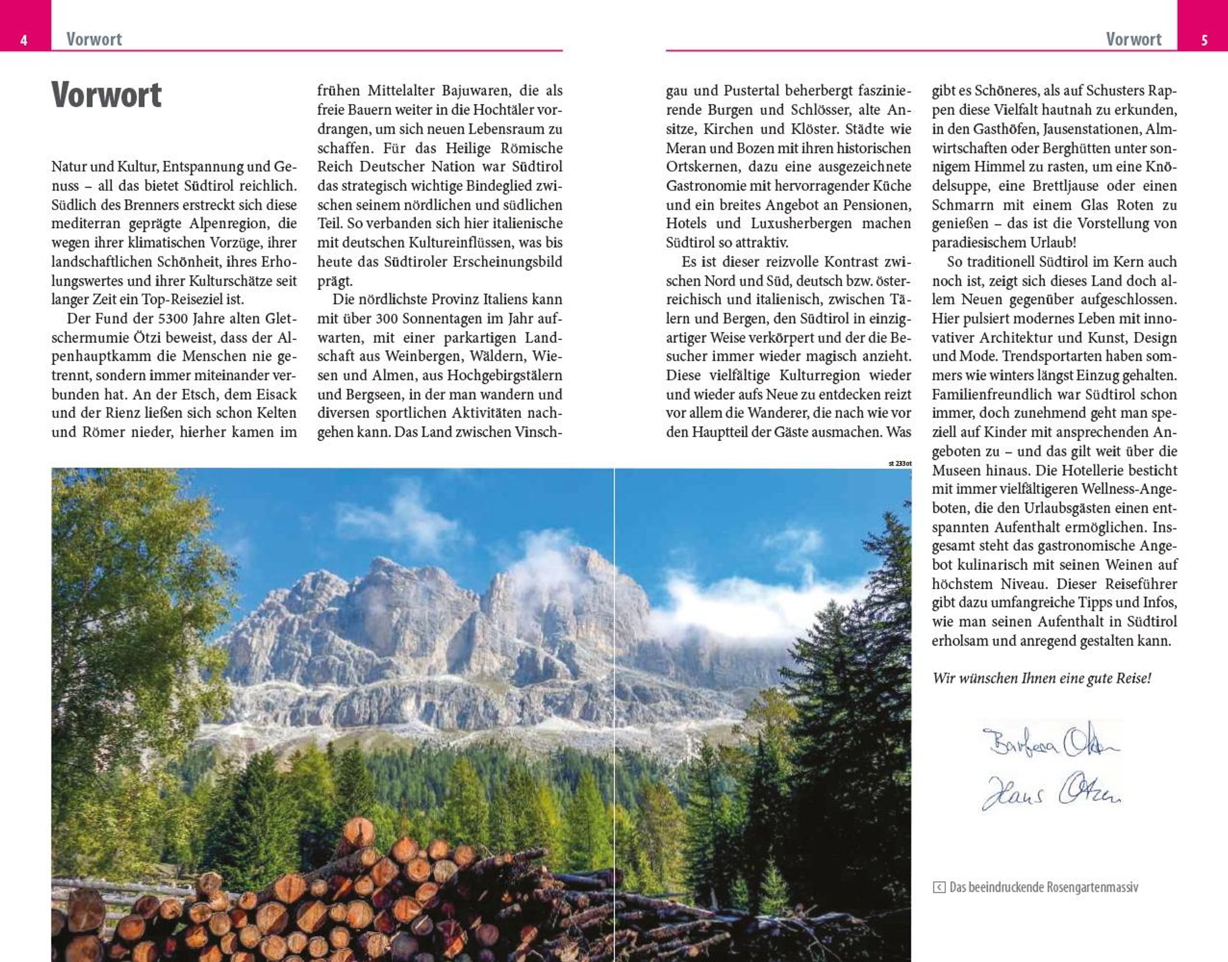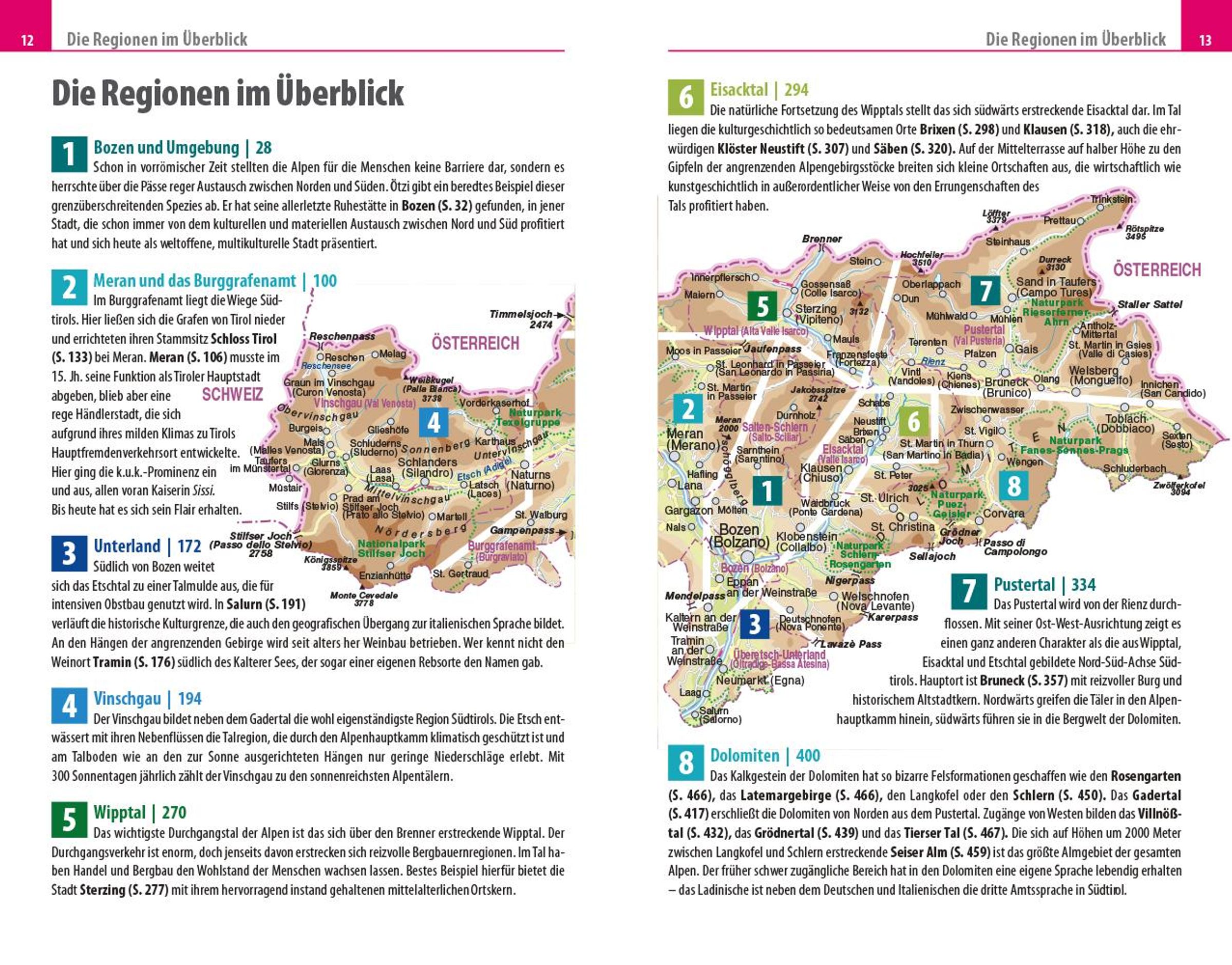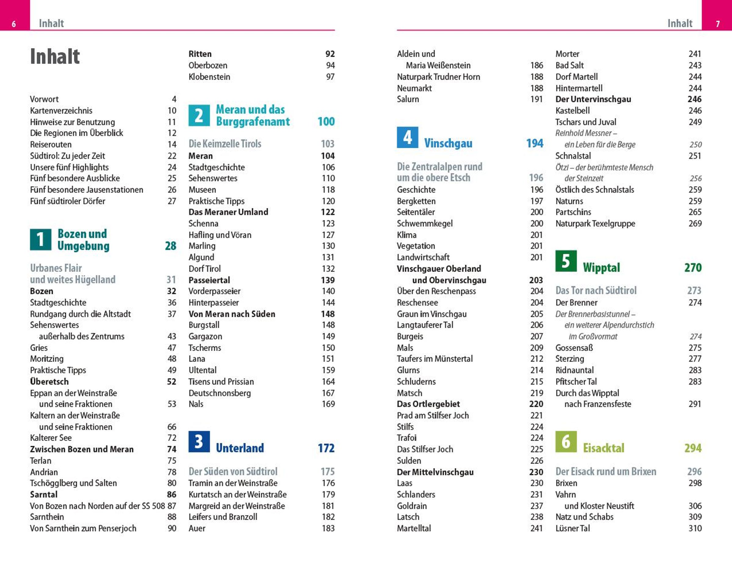 In ihrem Reiseführer beschreiben die Autoren Barbara und Hans Otzen alle interessanten Orte Südtirols: Bozen und Umgebung, Meran und das Burggrafenamt, das Südtiroler Unterland, Vinschgau, das Wipptal, das Eisacktal, das Pustertal und natürlich die Dolomiten. "Es ist dieser reizvolle Kontrast zwischen Nord und Süd, deutsch bzw. österreichisch und italienisch, zwischen Tälern und Bergen, den Südtirol in einzigartiger Weise verkörpert und der die Besucher immer wieder magisch anzieht", so die beeindruckte Feststellung des Autorenteams.