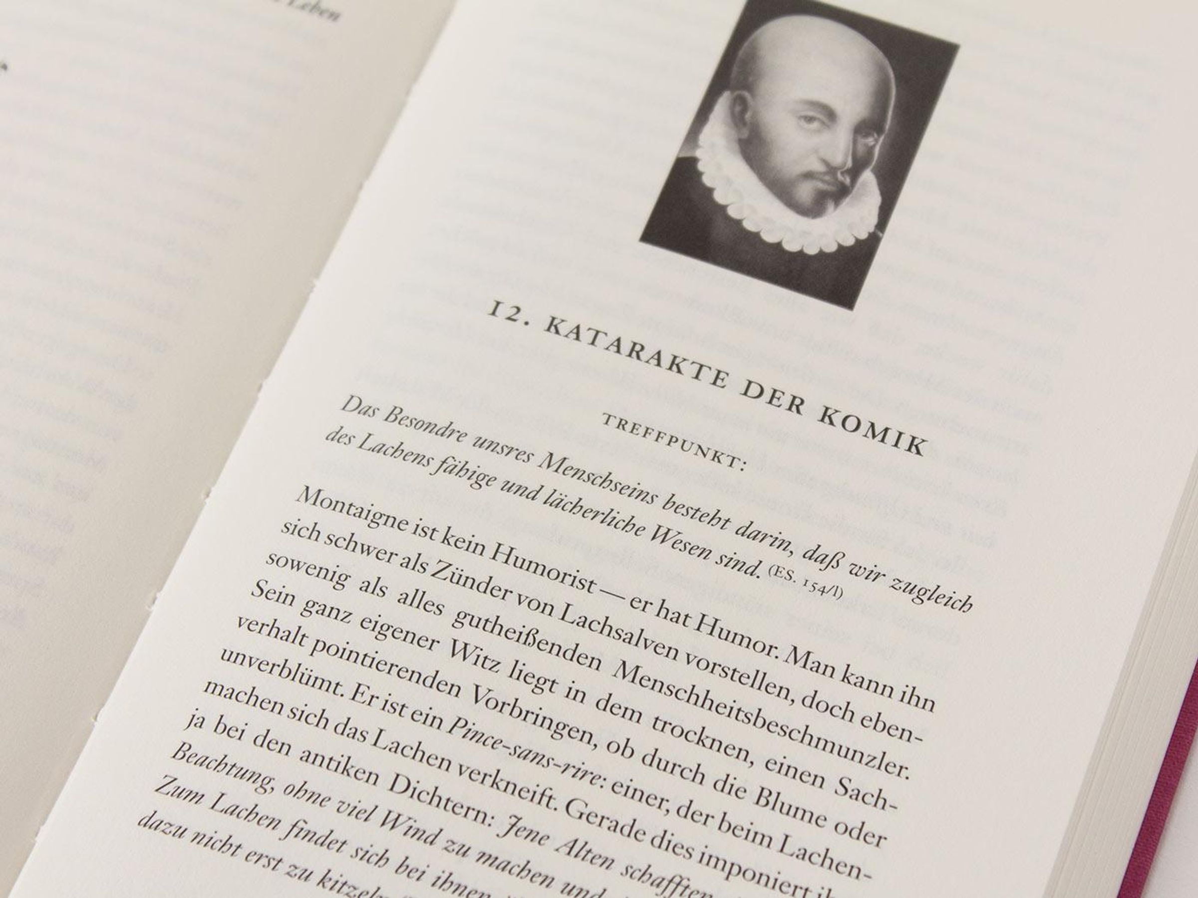 Michel de Montaigne, geb. am 28. Februar 1533 auf Schloss Montaigne im Périgord, stammte aus einer reichen Kaufmannsfamilie und genoss eine humanistische Erziehung. Nach dem Studium der Rechte fungierte er von 1557-70 als Parlamentsrat, zog sich aber nach dem Tod seines Freundes La Boétie in das Turmzimmer seines Schlosses zurück, um zu schreiben. Es folgten Reisen durch Italien, die Schweiz und Deutschland. Von 1582-85 war er Bürgermeister von Bordeaux. Der große Gelehrte, der sich bewusst von der Schulphilosophie fernhielt, starb am 13. September 1592.Anmerkungen: