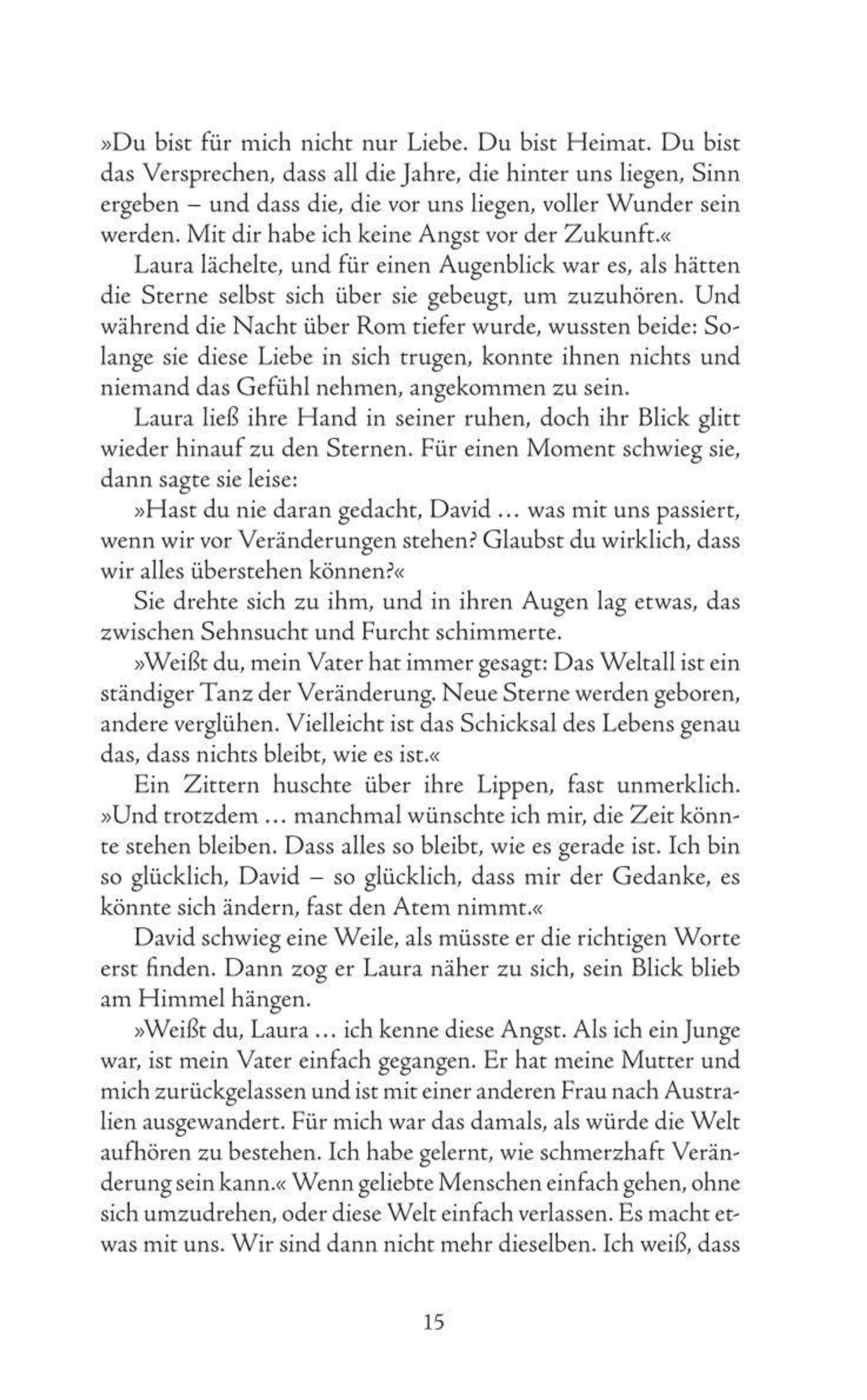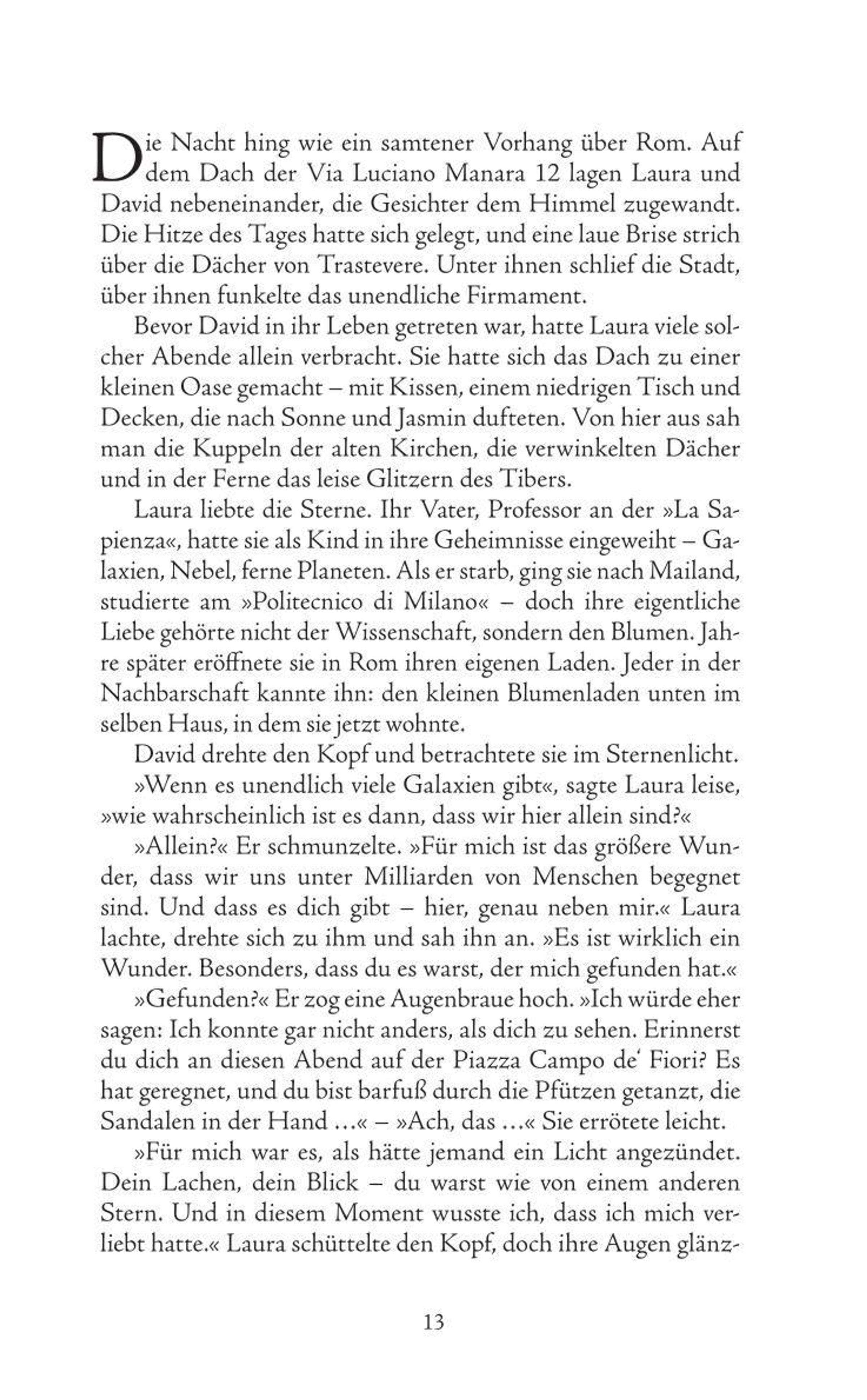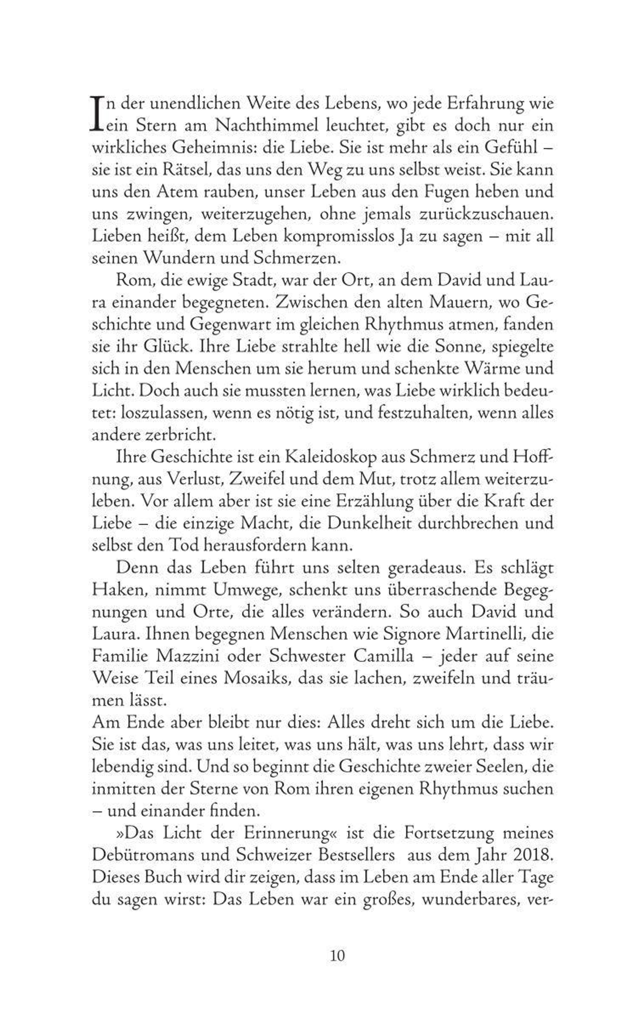 Das Licht der Erinnerung" ist eine Geschichte über Liebe, Abschied und die Magie, die bleibt, wenn ein Herz für immer weiterlebt - so zart und unvergänglich wie der Flug eines Schmetterlings. David, ein Schriftsteller, der einst alles verloren glaubte, findet in Laura nicht nur seine große Liebe, sondern auch seine Inspiration zurück. Gemeinsam erschaffen sie sich ein Leben voller Leichtigkeit, Hoffnung und Träume - über den Dächern der Stadt Rom, begleitet vom Duft der Blumen und der Musik des alten Karussells. Doch das Schicksal stellt sie auf eine harte Probe. Zwischen Freude und Verlust, zwischen der Kraft der Liebe und der Vergänglichkeit des Lebens lernen sie, dass jeder Moment zählt und dass Worte über den Tod hinaus tragen können. Ein Roman über das Licht der Erinnerung, das bleibt, wenn alles andere vergeht. Es ist die Geschichte zweier Menschen, die einander finden - und die Welt dadurch neu sehen. Ein Buch, das Fragen stellt, die uns alle betreffen: Was bedeutet es, wirklich zu lieben? Was bleibt, wenn wir loslassen müssen? Poetisch, berührend und voller Hoffnung erinnert es uns daran: Auch das kleinste Staubkorn im Universum kann leuchten - wenn es von Liebe getragen wird.