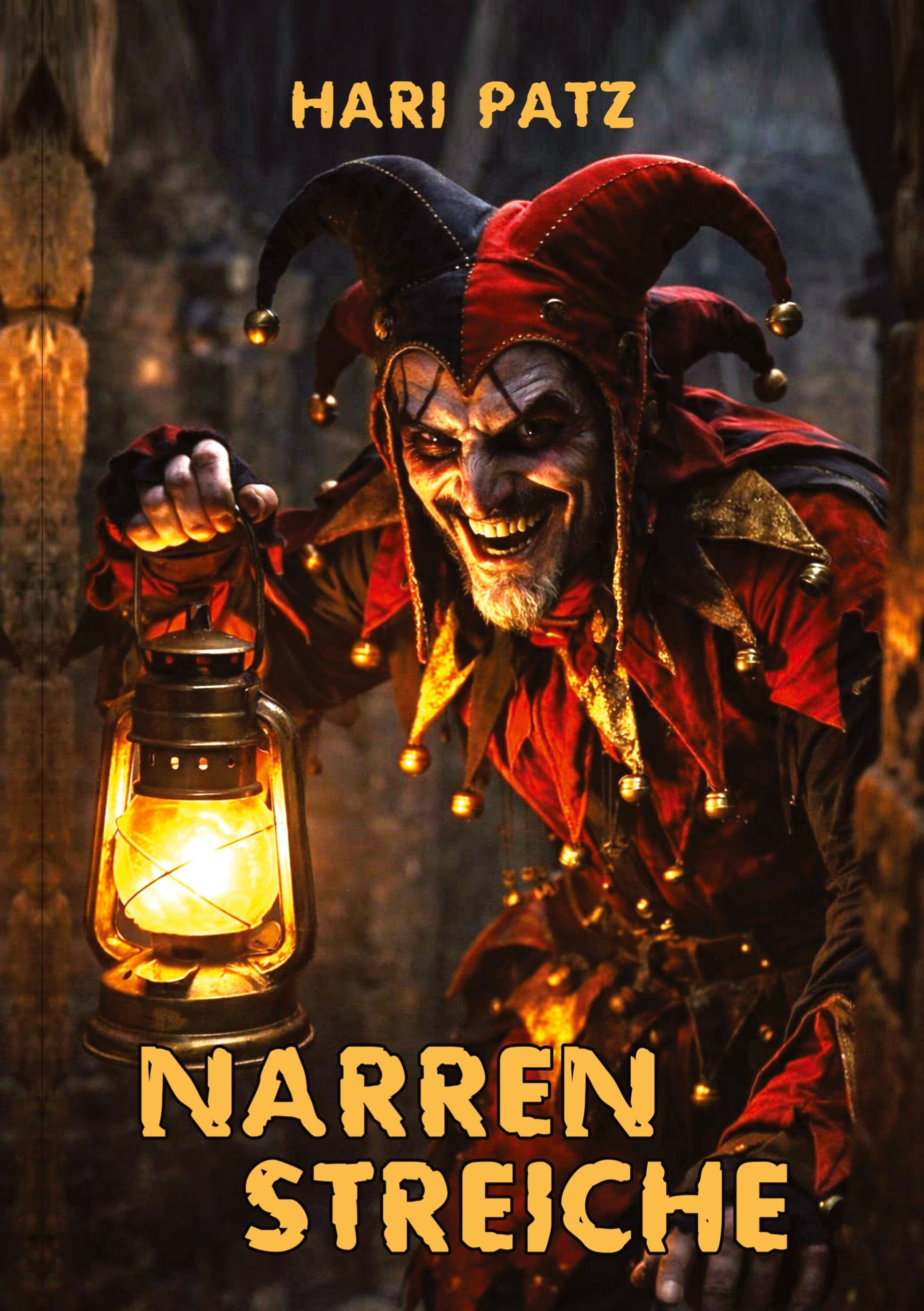 Text: "HARI PATZ, NARRENSTREICHE". Ein grinsender Narr in einem farbenfrohen Kostüm hält eine leuchtende Laterne., Buch