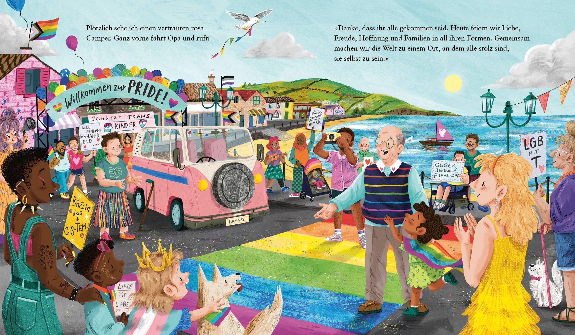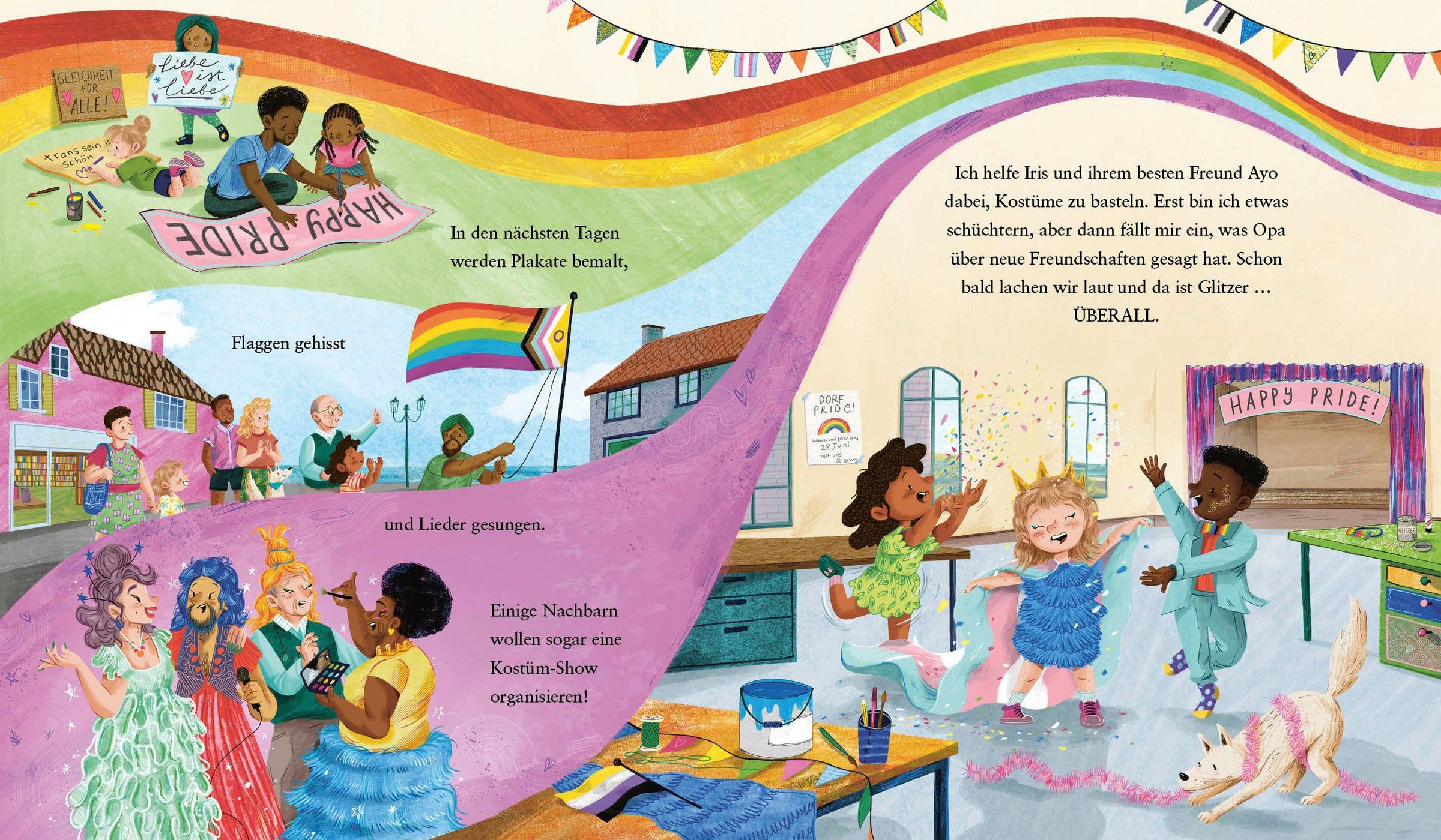 In dieser farbenfrohen Fortsetzung bringen Opa und Enkelkind das bunte Pride-Fest direkt ins eigene Dorf. Gemeinsam mit den Nachbarn wird organisiert, gebacken, gebastelt und gelacht - bis zum großen Tag der Parade. Ein Bilderbuch mit einer klaren Botschaft: Jede Liebe ist einzigartig und verdient es, gefeiert zu werden.
