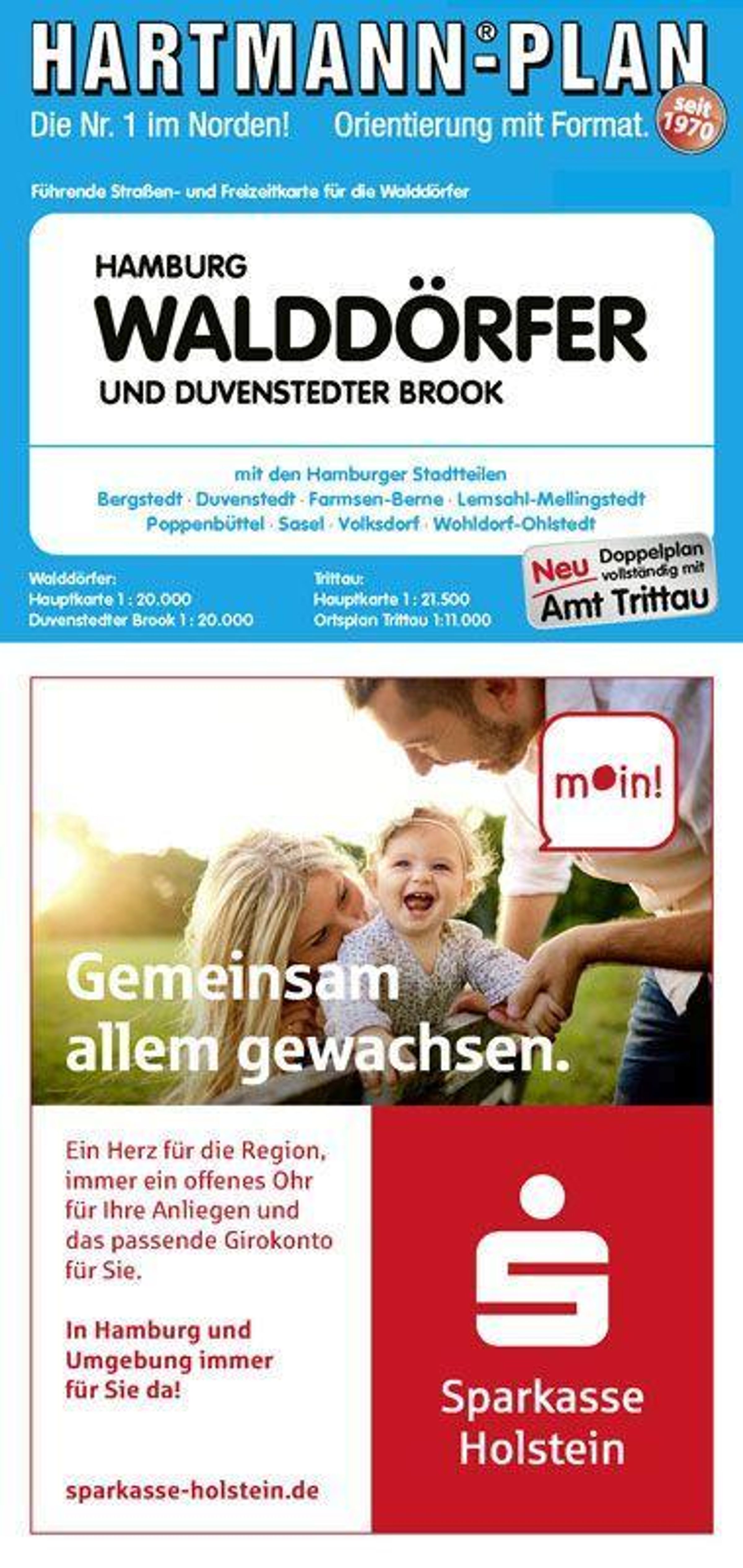 Die führende Straßenkarte und Freizeitkarte für die Walddörfer mit ausgewiesenen Wanderwegen und dem kompletten Duvenstedter Brook. Hauptkarte und Duvenstedter Brook 1: 20.000. Als Doppelplan erstmals auf der Rückseite vollständig mit dem Amt Trittau.