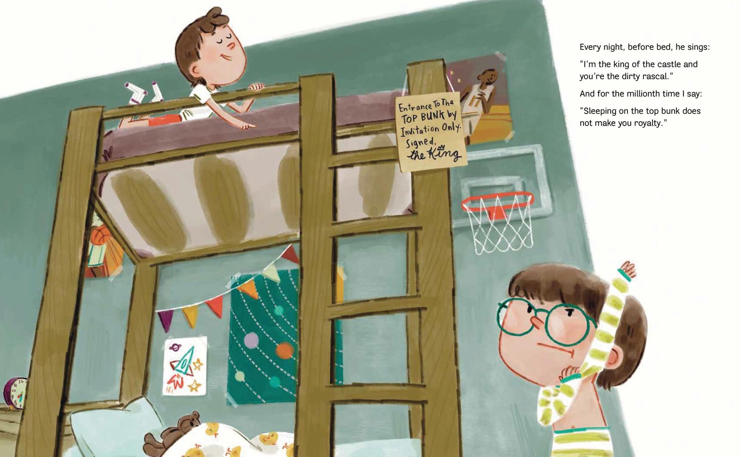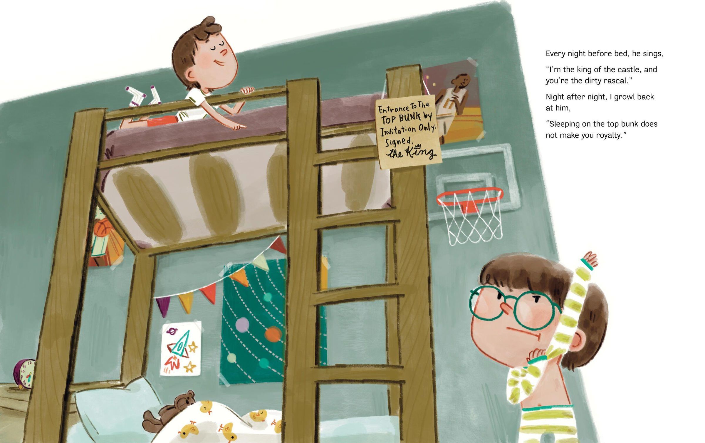 Every night at bedtime, a little boy's older brother climbs into the top bunk of their bed and taunts, "I'm the king of the castle, and you're the dirty rascal." As annoying as this is for the little brother, his big brother also provides a sense of security. Sometimes in the dark, the little brother will startle awake. "You there?" he will whisper. "I'm here, Rascal. Now go to sleep," his brother will whisper back. As time passes, his brother starts going out more with his friends. And then leaves for camp. And, suddenly, the boy is left to ponder how it feels to be without his brother in the bunk bed, and in his life.