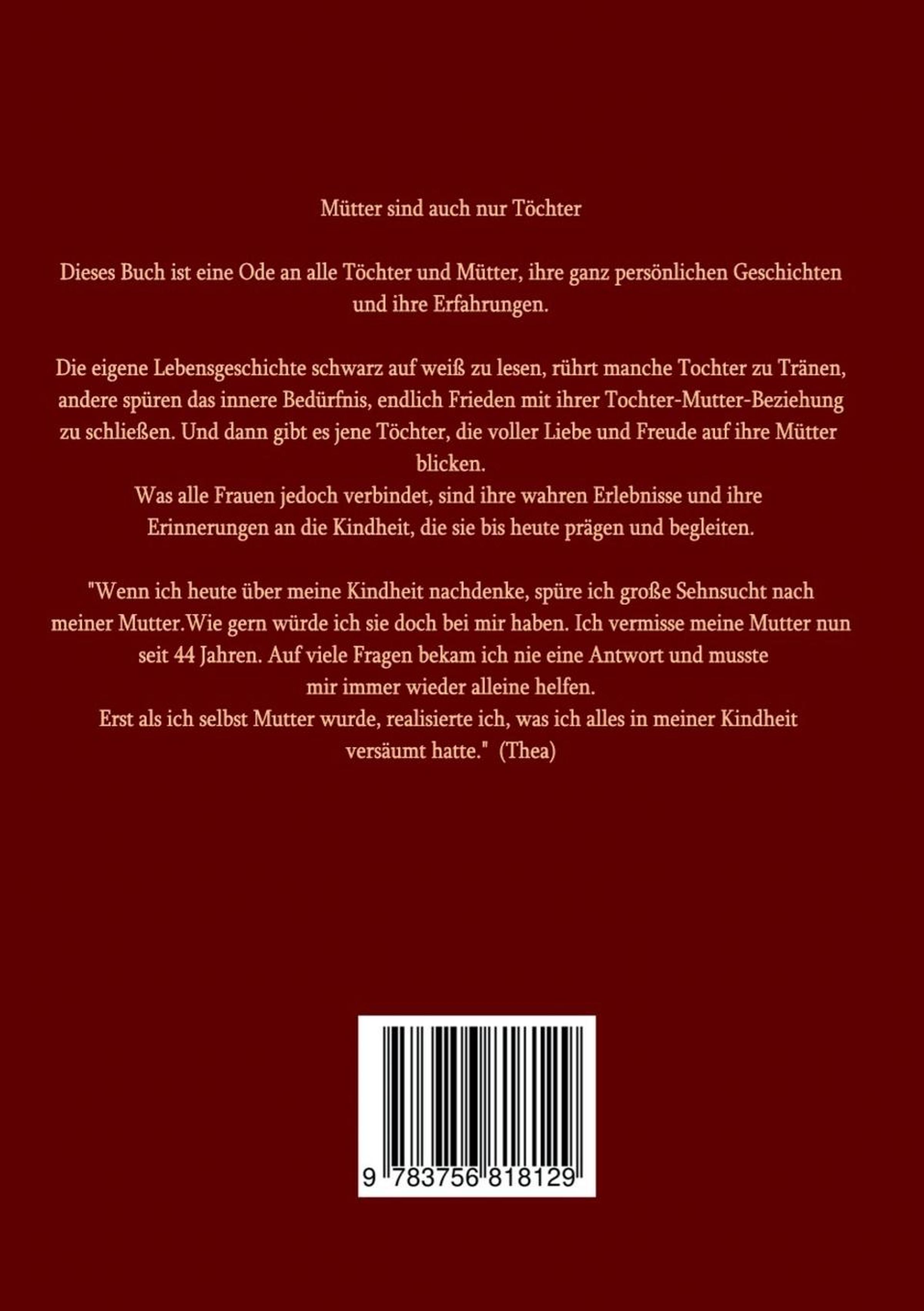 Dieses Buch ist eine Ode an alle Töchter und Mütter, ihre ganz persönlichen Geschichten und ihre Erfahrungen. Die eigene Lebensgeschichte schwarz auf weiß zu lesen, rührt manche Tochter zu Tränen, andere spüren das innere Bedürfnis, endlich Frieden mit ihrer Tochter-Mutter-Beziehung zu schließen. Und dann gibt es jene Töchter, die voller Liebe und Freude auf ihre Mütter blicken. Was alle Frauen jedoch verbindet, sind ihre wahren Erlebnisse und ihre Erinnerungen an die Kindheit, die sie bis heute prägen und begleiten.