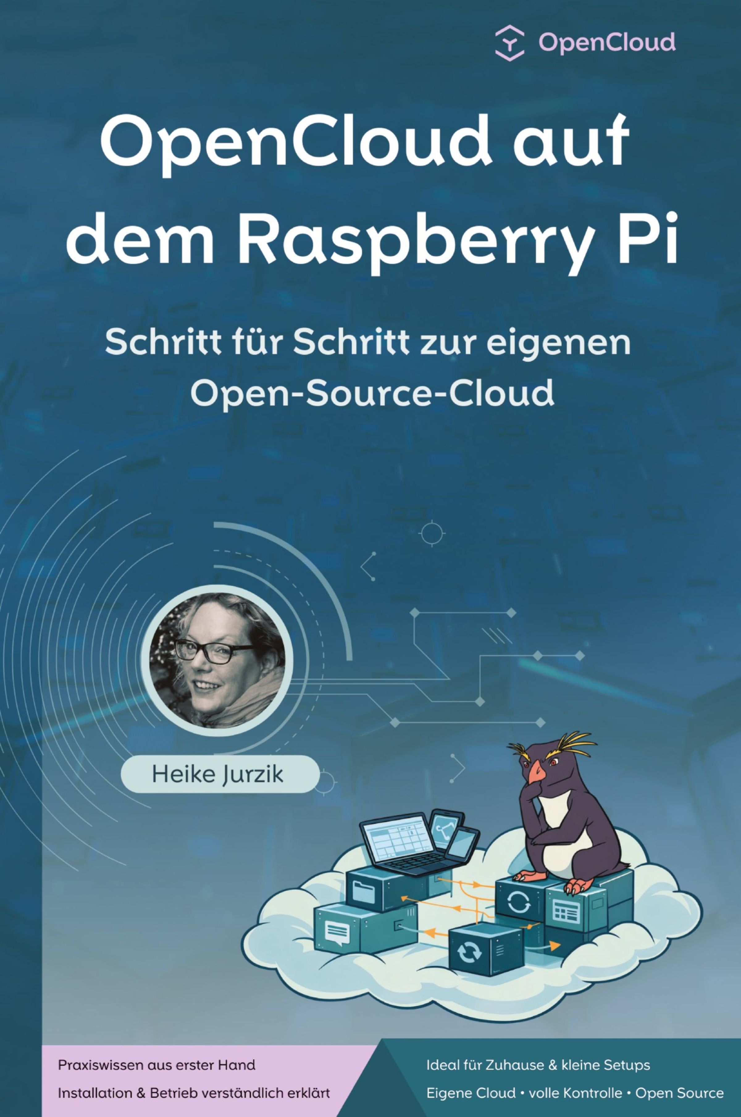 "OpenCloud auf dem Raspberry Pi. Schritt für Schritt zur eigenen Open-Source-Cloud. Heike Jurzik." Illustration: Pinguin., Buch