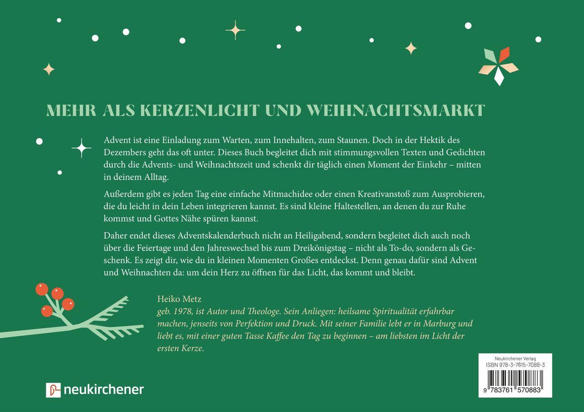 Dieses Buch begleitet daher mit stimmungsvollen Texten und Gedichten durch die Advents- und Weihnachtszeit und schenkt täglich einen Moment der Einkehr - mitten im Alltag. Jeder Tag enthält einen kurzen, inspirierenden Adventsimpuls und eine einfache Mitmachidee oder einen Kreativanstoß, die leicht ins eigene Leben integriert werden können: beim ersten Kaffee, auf dem Heimweg oder vor dem Schlafengehen. Es sind kleine Haltestellen, an denen man zur Ruhe kommt und Gottes Nähe spüren kann.