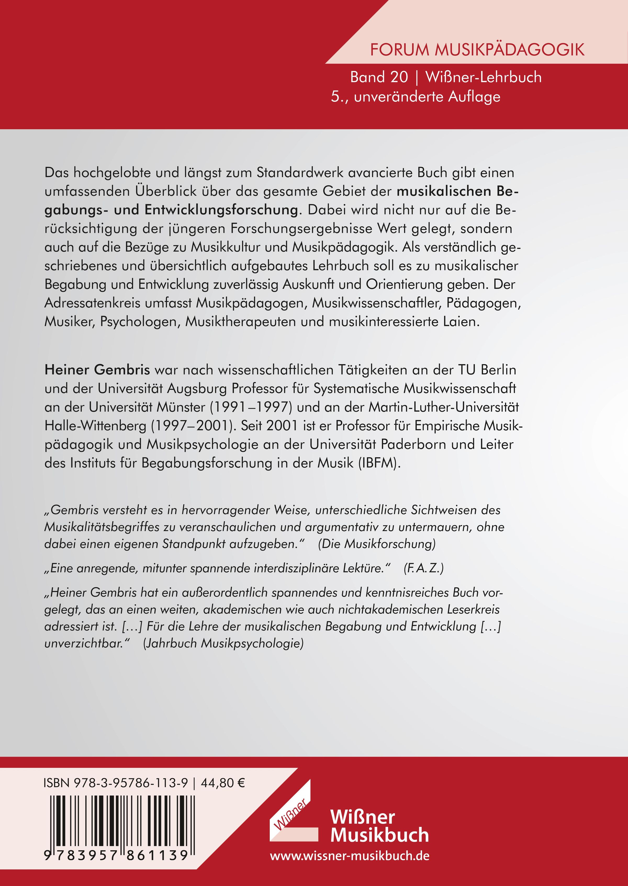 Das hochgelobte und längst zum Standardwerk avancierte Buch gibt einen umfassenden und aktuellen Überblick über das gesamte Gebiet der musikalischen Begabungs- und Entwicklungsforschung. Dabei wird nicht nur auf die Berücksichtigung der jüngeren Forschungsergebnisse Wert gelegt, sondern auch auf die Bezüge zu Musikkultur und Musikpädagogik. Als verständlich geschriebenes und übersichtlich aufgebautes Lehrbuch soll es zu musikalischer Begabung und Entwicklung zuverlässig Auskunft und Orientierung geben. Der Adressatenkreis umfasst Musikpädagogen, Musikwissenschaftler, Pädagogen, Musiker, Psychologen, Musiktherapeuten und musikinteressierte Laien.